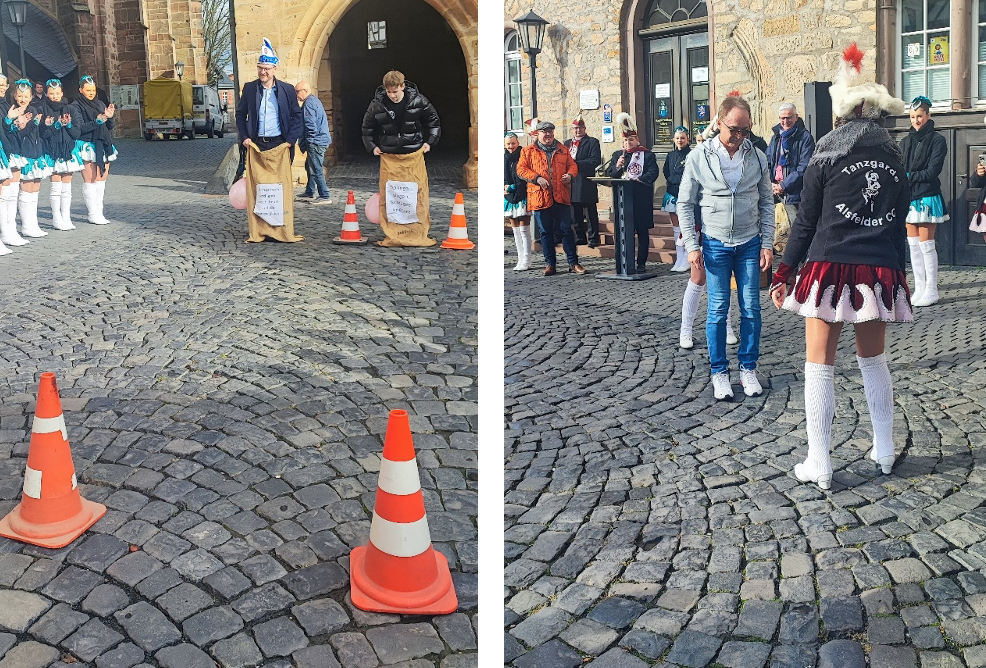 Am Ende griff der Bürgermeister zu einem besonderen Kniff: Der Rathausschlüssel sollte in einem sportlich-närrischen Wettstreit entschieden werden. „Drum kommt es nun zum Test, denn eines steht ja felsenfest: Wenn ich euch soll den Schlüssel reichen, müsst ihr euer Könn’ erweisen!“ rief Paule den Narren zu.