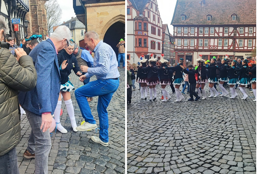 Doch die Schlüsselübergabe verlief nicht ohne Widerstände: Bürgermeister Paule zögerte und wollte das Symbol der Macht nicht ohne Weiteres herausrücken. Ein verbaler Schlagabtausch über Haushalt, Wimmelbuch, das Erlenbad und den Schwälmer Brunnen, aus dem künftig Bier sprudeln soll, brachte die Menge zum Schmunzeln. Stolz verkündeten die Narren: „Ja, bei uns in Alsfeld – da staunste genug: Jetzt gibt’s schon die zweite Auflage vom Wimmelbuch!“