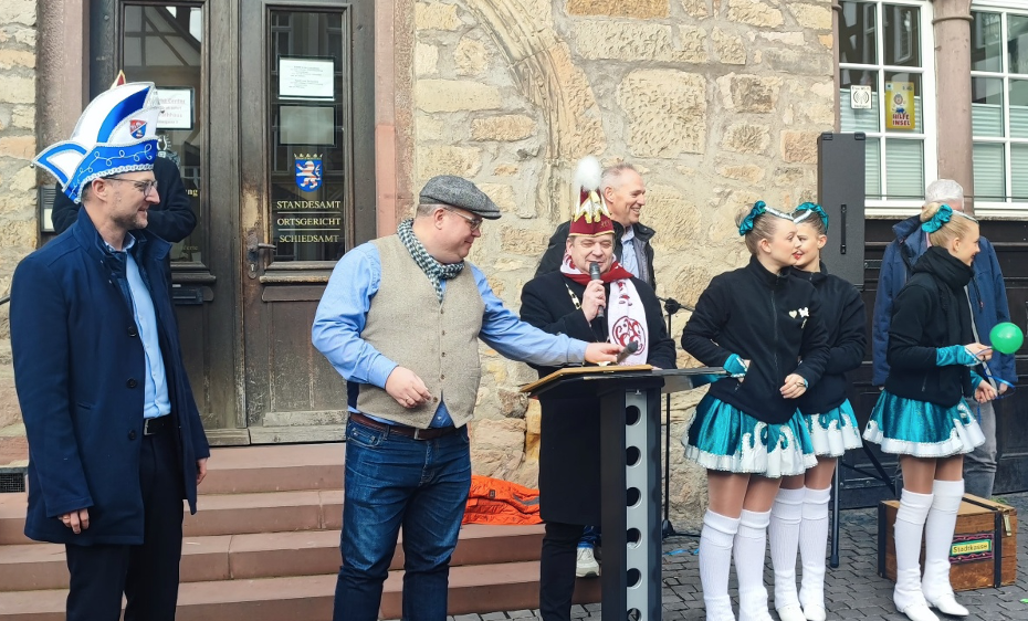 ALSFELD (ol). Punkt 11.11 Uhr am 11. November haben die Narren des Alsfelder Carneval Clubs (ACC) das Rathaus gestürmt und die närrische Herrschaft bis Aschermittwoch übernommen. Nach einem wortgewandten Schlagabtausch mit Bürgermeister Stephan Paule eroberten sie beim närrischen Wettstreit auf dem Marktplatz den symbolischen Rathausschlüssel. Mit Tanz, Musik und viel Gelächter startete die fünfte Jahreszeit unter lautem „Alsfeld Helau!“.