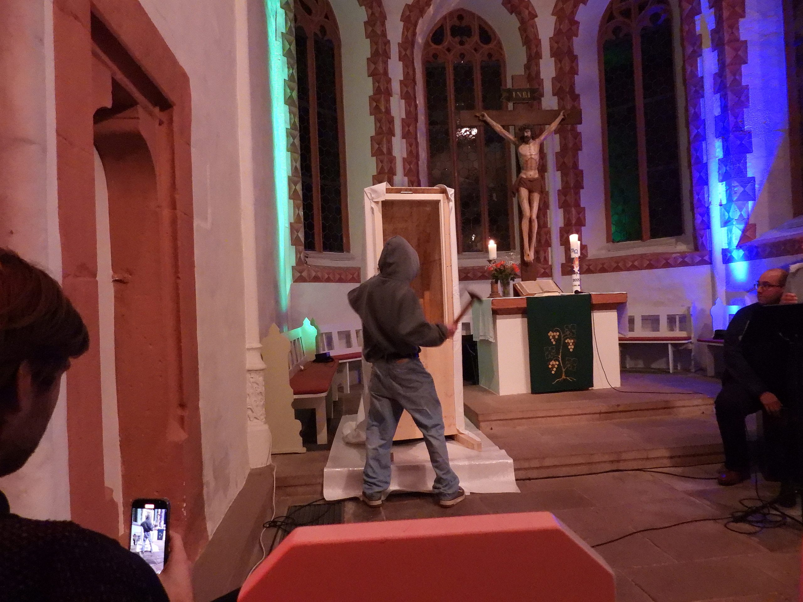 Reichlich 60 überwiegend junge Besucherinnen und Besucher feierten am Sonntag, dem 09. November, einen Jugendgottesdienst in Ober-Ofleiden. Das historisch bedeutsame Datum gab auch das Thema vor: „Frieden ist zerbrechlich“ ist ein Anklang an die friedliche Revolution 1989 und an die Reichsprogromnacht 1938. Und so begann der Gottesdienst auch mit einem Knall: Zu Beginn rannte eine Person im Kapuzenpulli in die Kirche und zerstörte eine Fensterscheibe. Der Effekt war beeindruckend und vermittelte ein Gefühl, wie es sich anfühlen kann, wenn man machtlos zusehen muss, wenn Dinge zerstört werden, so heißt es in der Pressemitteilung des Evangelischen Dekanats Vogelsberg.