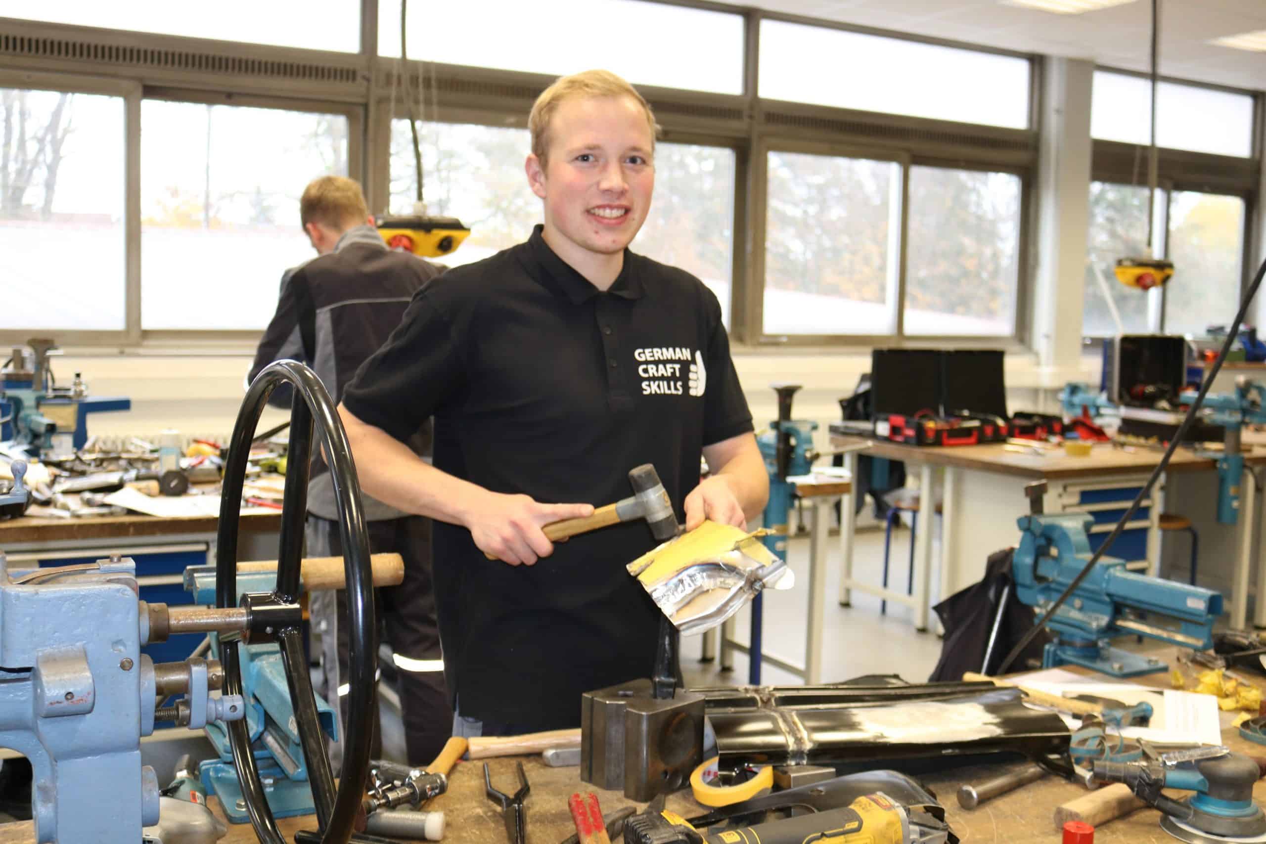 Beide Fachrichtungen dieses Handwerks – Karosserie- und Fahrzeugbautechnik sowie -Karosserieinstandhaltungstechnik – wurden geprüft. Hinzu kam für beide Bereiche eine Elektronikprüfung. Nach einem gemütlichen Kennenlernabend in Alsfeld war es dann am nächsten Morgen für bundesweit angereisten Wettbewerber so weit: Die Instandsetzer mussten zeigen, dass sie ein demoliertes Frontblech wieder fitmachen können. Dazu sollten sie sowohl ein – vielleicht durch einen Unfallschaden – verformtes Teil instandsetzen als auch ein Fahrzeugblech reproduzieren, sodass es problemlos eingesetzt werden konnte. Die Landesmeister in der Karosserie- und Fahrzeugbautechnik fertigten nach Zeichnung eine Traverse aus Rohmaterial – mit Lampenhalterung. Alle noch recht frisch gebackenen Gesellen hatten ihre eigenen Arbeitsgeräte mitgebracht, nutzten jedoch auch die fest installierten, größeren Anlagen vor Ort, beispielsweise die Schweißgeräte. „Alle Werkstücke werden am Ende von einer fachkundig besetzten Jury mit Mitgliedern aus ganz Deutschland begutachtet“, schilderte Fuchs den weiteren Verlauf des Wettbewerbs. Seine Aufgabe war es dann, alle Stellungnahmen zu sichten, zusammenzufassen und daraus in der jeweiligen Fachrichtung den Besten zu ermitteln.
