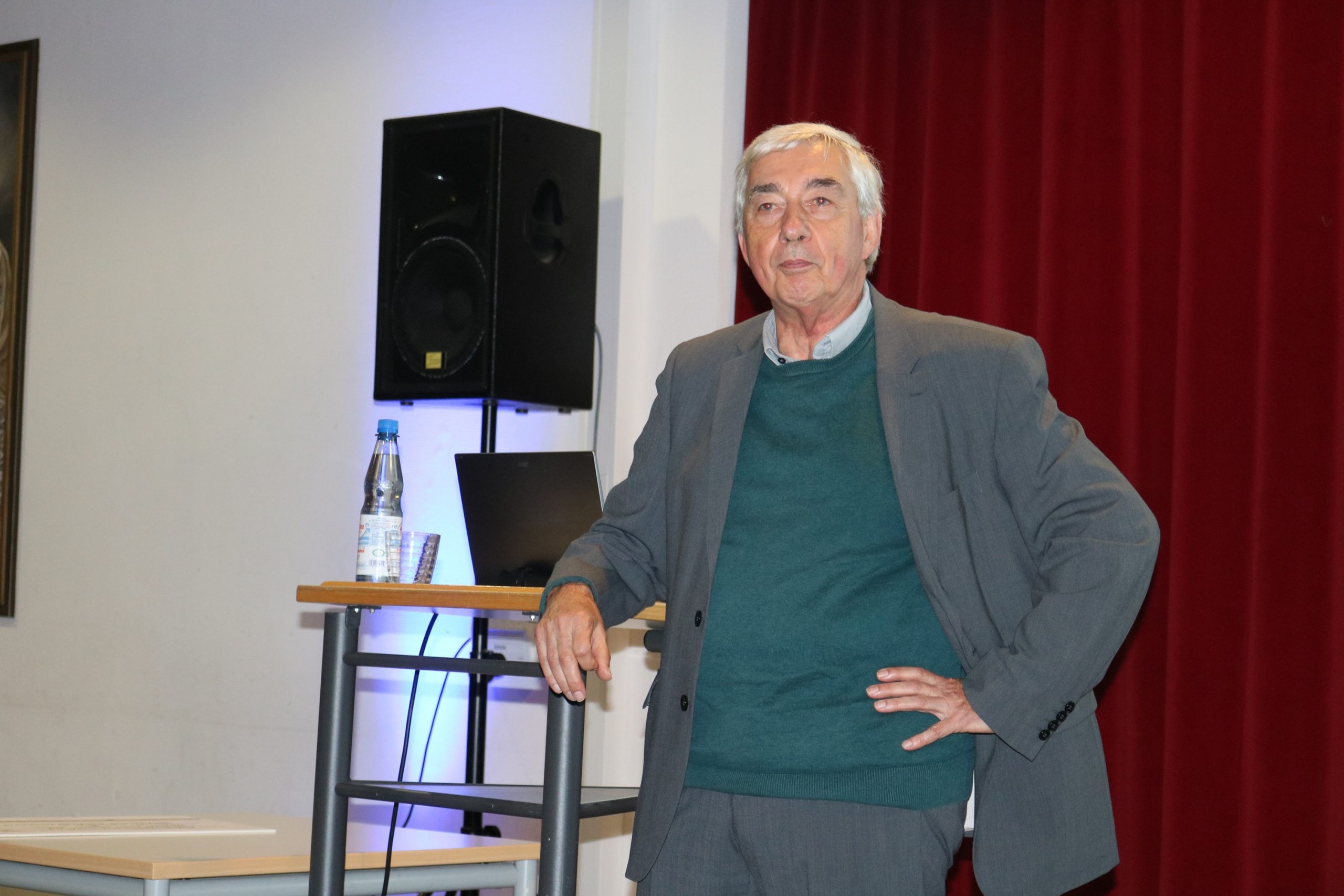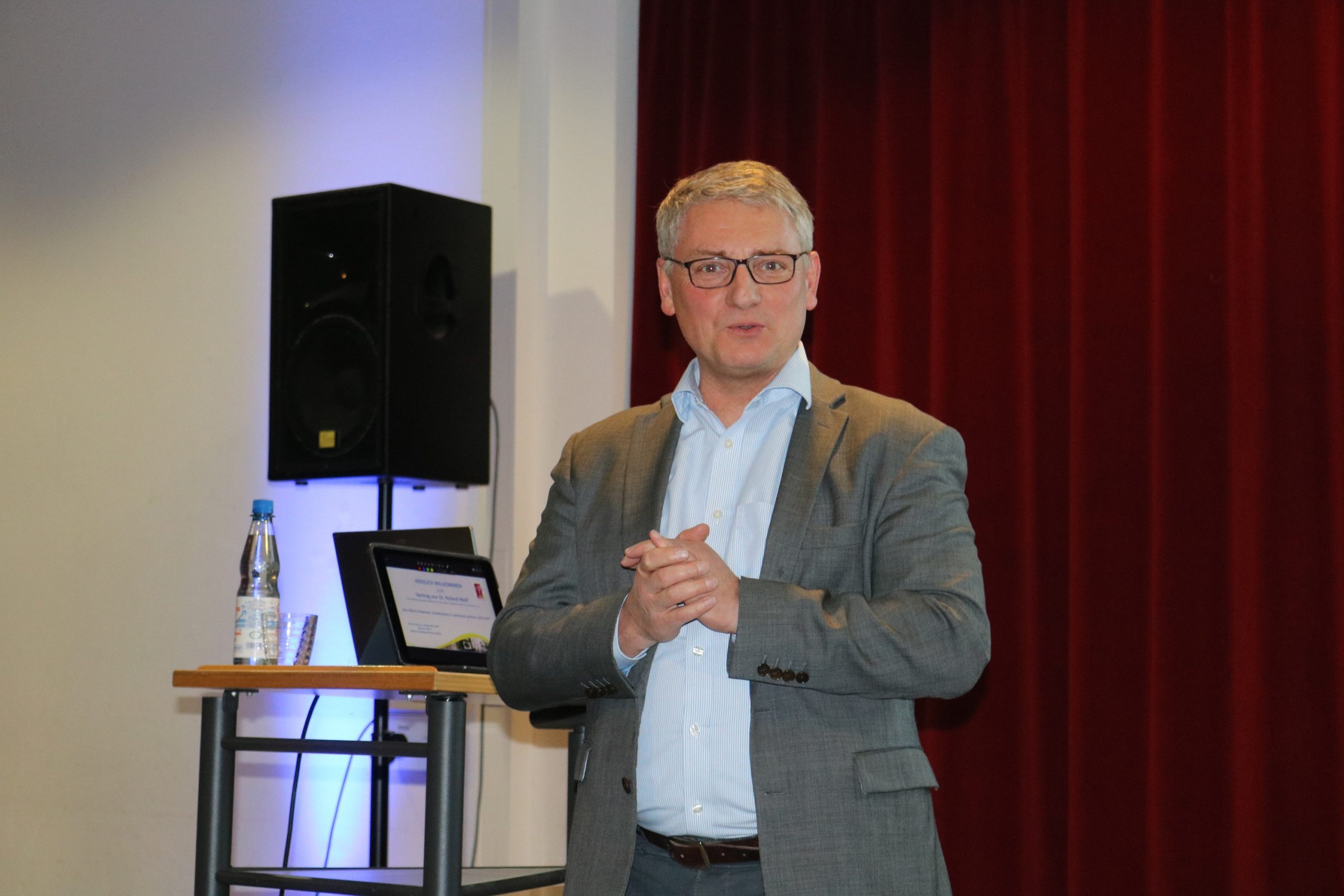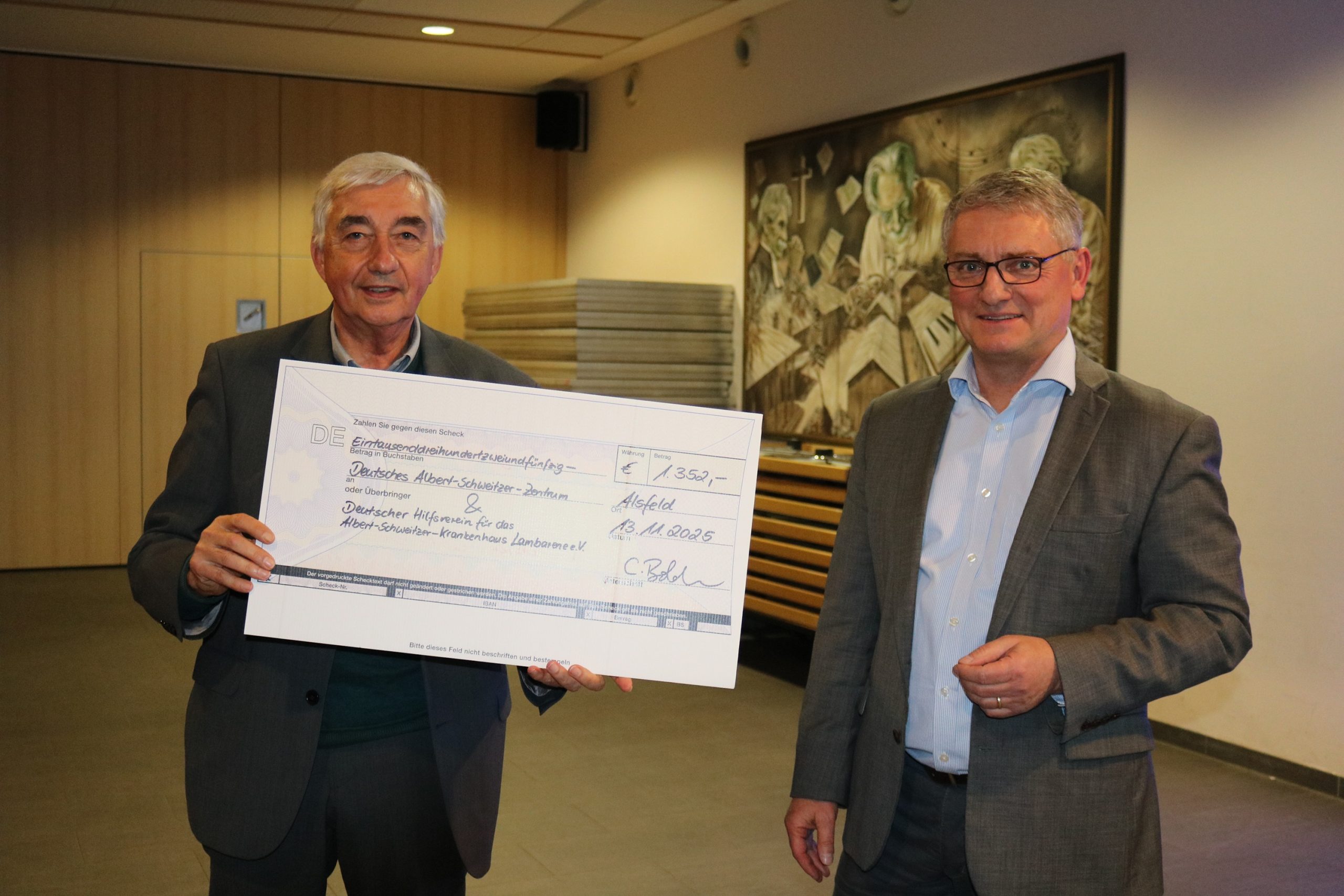 Schulleiter Christian Bolduan freute sich sichtlich, mit dem Studiendirektor i. R. einen versierten Afrika-Kenner in der Aula der Schule in der Schillerstraße zu begrüßen, einen der mehrfach im Jahr nach Gabun reist, um sich vor Ort ein Bild zu machen und mit den Menschen in und um das Spital ins Gespräch zu kommen. Für die Schule sei es wichtig, die vielen Facetten Albert Schweitzers in die Wahrnehmung ihrer Schülerinnen und Schüler zu rücken, so Bolduan, der neben einigen Gästen aus der Schülerschaft auch viele Lehrkräfte, Ärztinnen und Ärzte sowie andere Interessierte im Publikum willkommen hieß. Einen großen Scheck gab es vorab: Die Schule hatte mit den vorhergehenden Veranstaltungen (einen Vortrag und ein Konzert) mehr als 1300 Euro eingenommen, die nun dem Spital in Gabun und der Bildungsarbeit der „Stiftung Deutsches-Albert-Schweitzer-Zentrum“ zugutekommen.