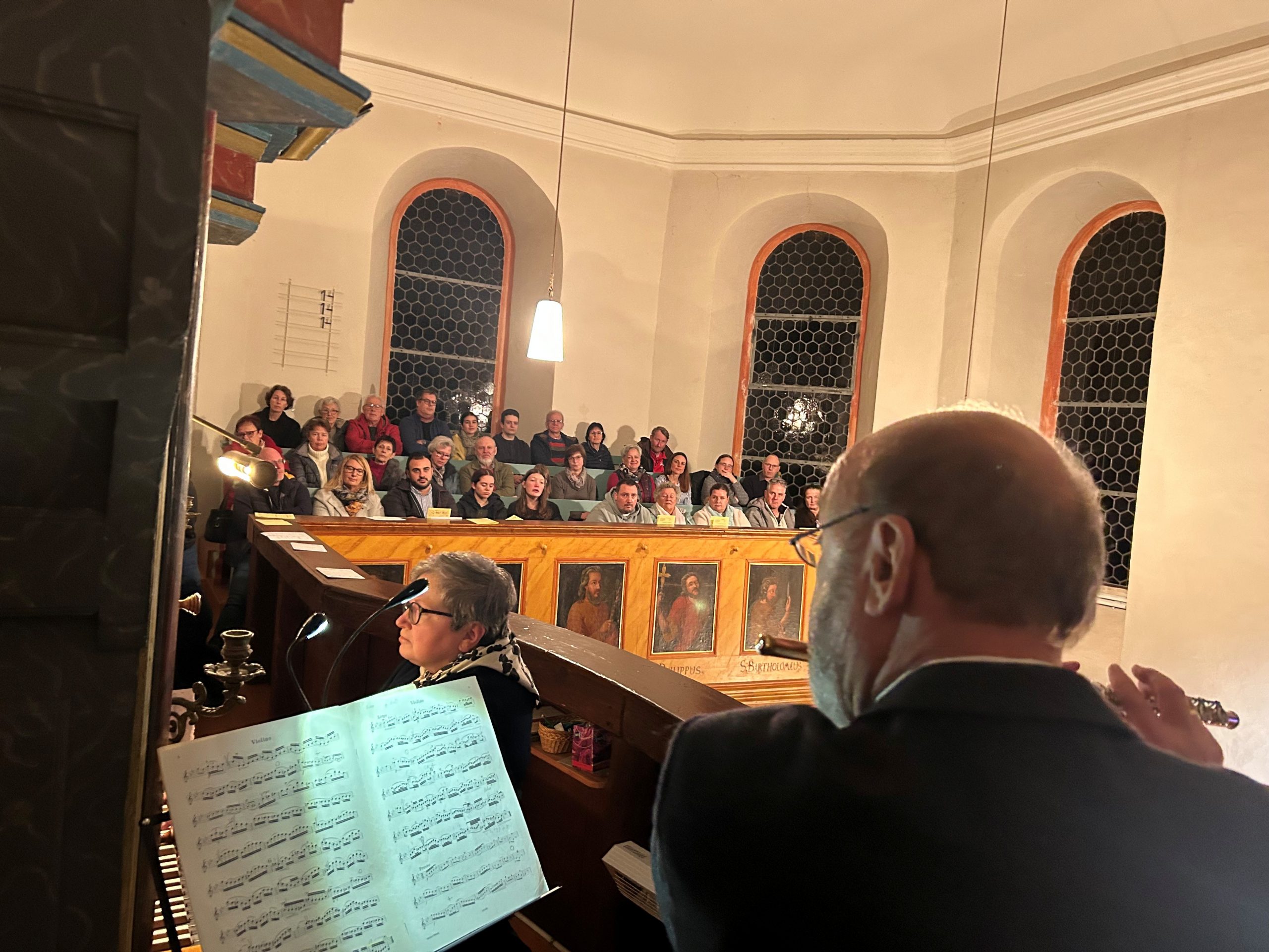 Mit dem „Adagio BWV 1020“ und dem dazugehörigen „Allegro“ von Johann Sebastian Bach erfreuten Claudia Bodenstein und Roland von Tenspolde in ihrem zweiten Part das Publikum in der Altenburger Kirche. Sie interpretierten hier musikalisch, wie Stille und Freude gerade in der Weihnachtszeit aufeinandertreffen und sich gegenseitig bedingen.
