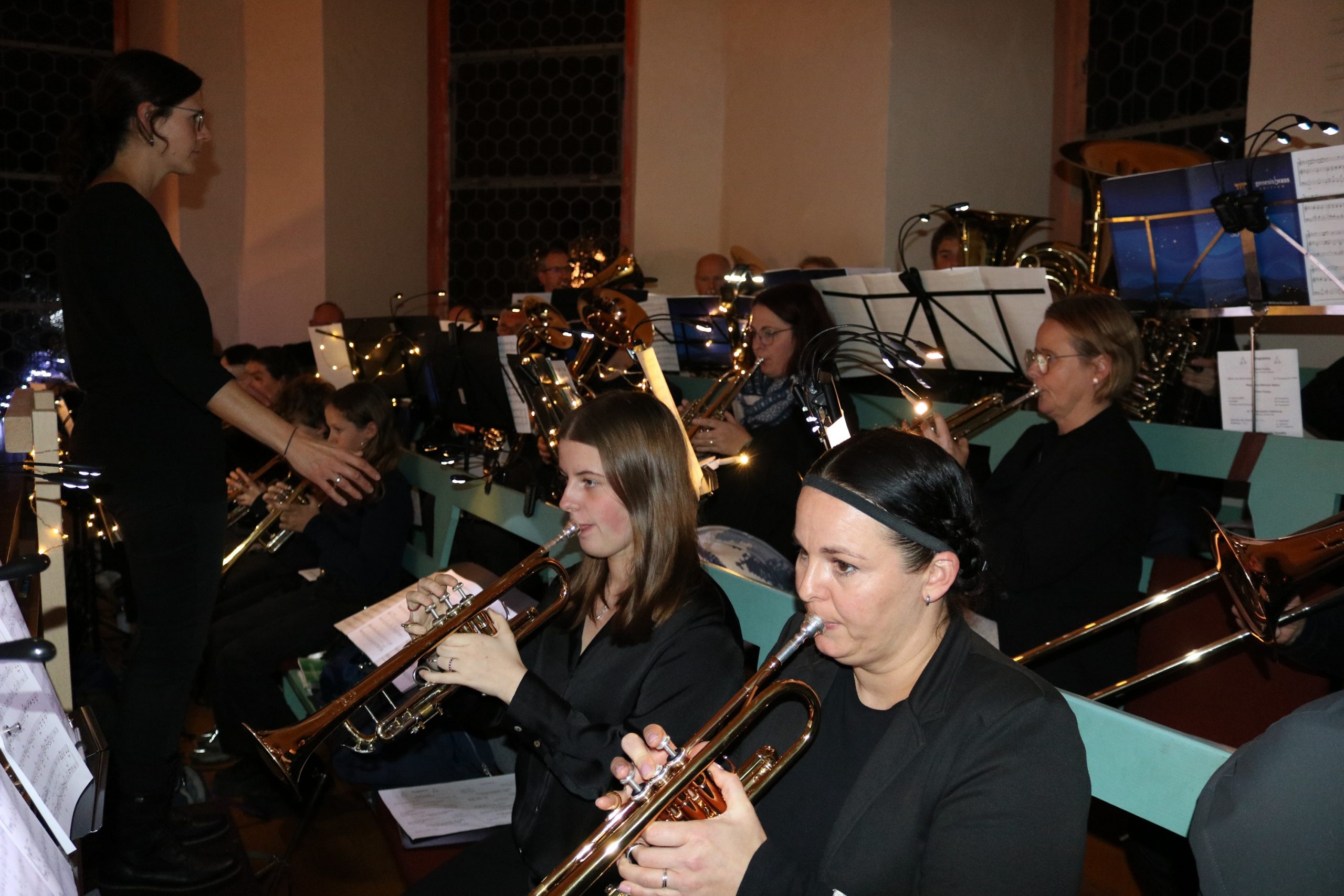 Der Posaunenchor steuerte sodann zwei prächtige Lieder zum Programm hinzu und zeigte wieder einmal mehr seine konzertanten Qualitäten. Sowohl die tiefen als auch die hellen Instrumente hatten ihre Einsätze und vereinten sich zu einem vollen gemeinsamen Klang. Nach den gefühlvollen „Glocken der Weihnacht“ eroberte der mitreißende Ton von „Adiemus“ den Raum – eine großartige Darbietung der Bläserinnen und Bläser.