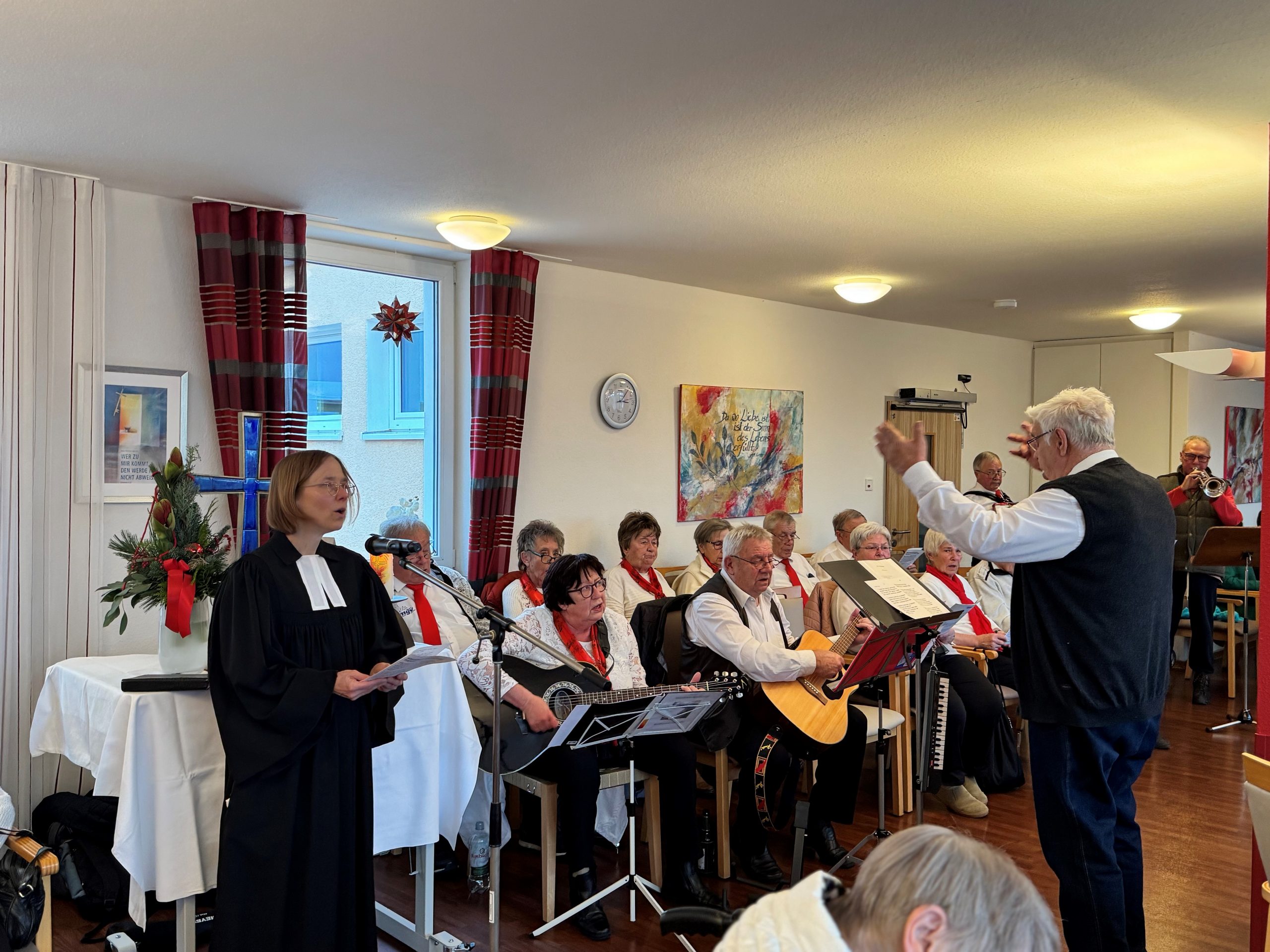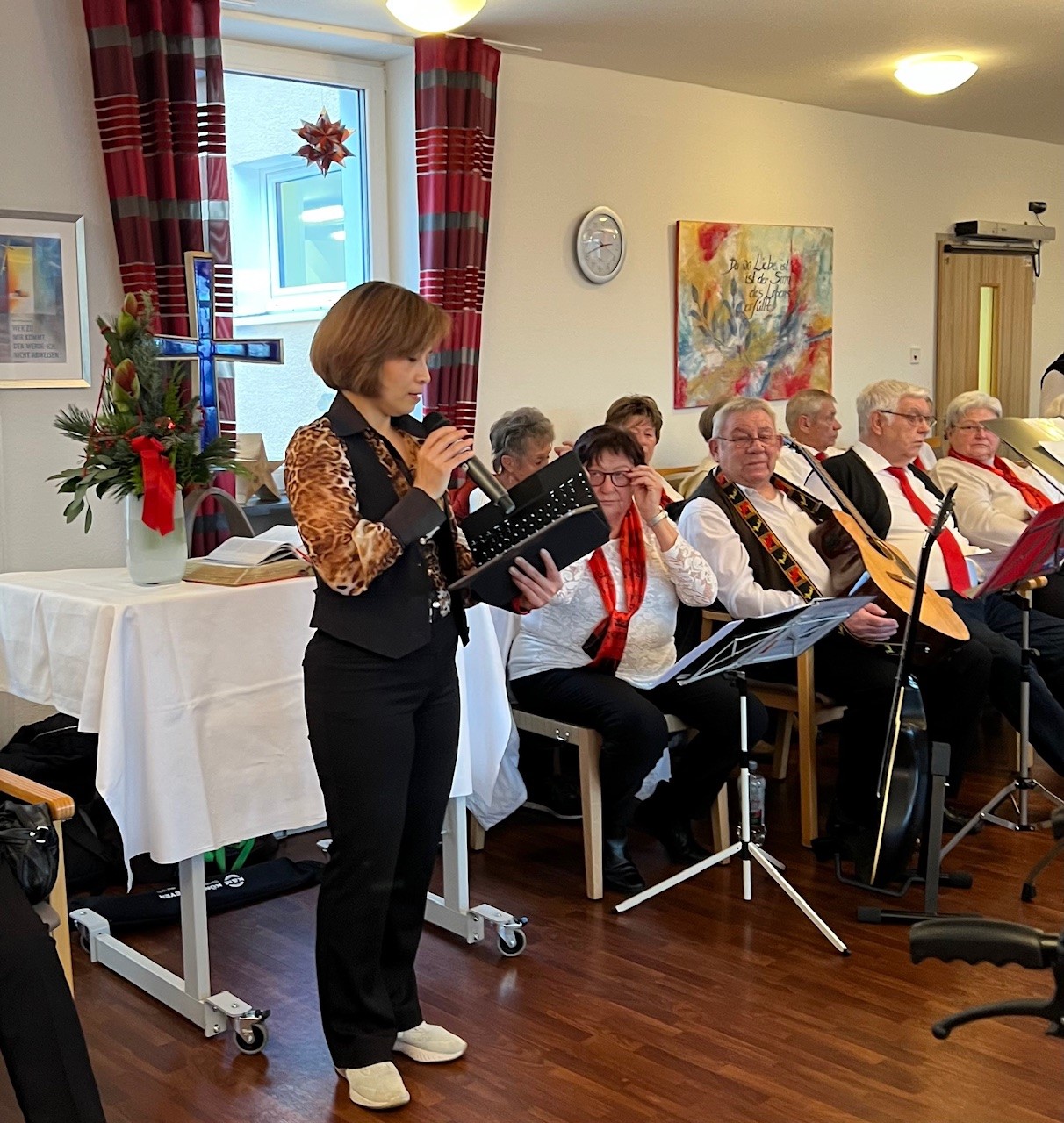 Der Gottesdienst bildete das Fundament des Nachmittags. Pfarrerin Anke Göltenboth eröffnete ihn mit dem adventlichen Psalm 24 – „Machet die Tore weit“ – und führte mit vertrauten Gebeten, dem Vaterunser und klassischen Kirchenliedern durch die Liturgie. Die Sonntagssinger aus Holzburg übernahmen die vollständige musikalische Gestaltung. Sie unterstützten den Gemeindegesang, sangen liturgische Chorstücke, setzten Kirchenmusikschwerpunkte und gaben dem Gottesdienst einen warmen, getragenen Grundton. Unter der präzisen Leitung von Dirigent Manfred Gonder entstand ein musikalisches Bild, das die Liturgie wie feines Holzwerk einrahmte.