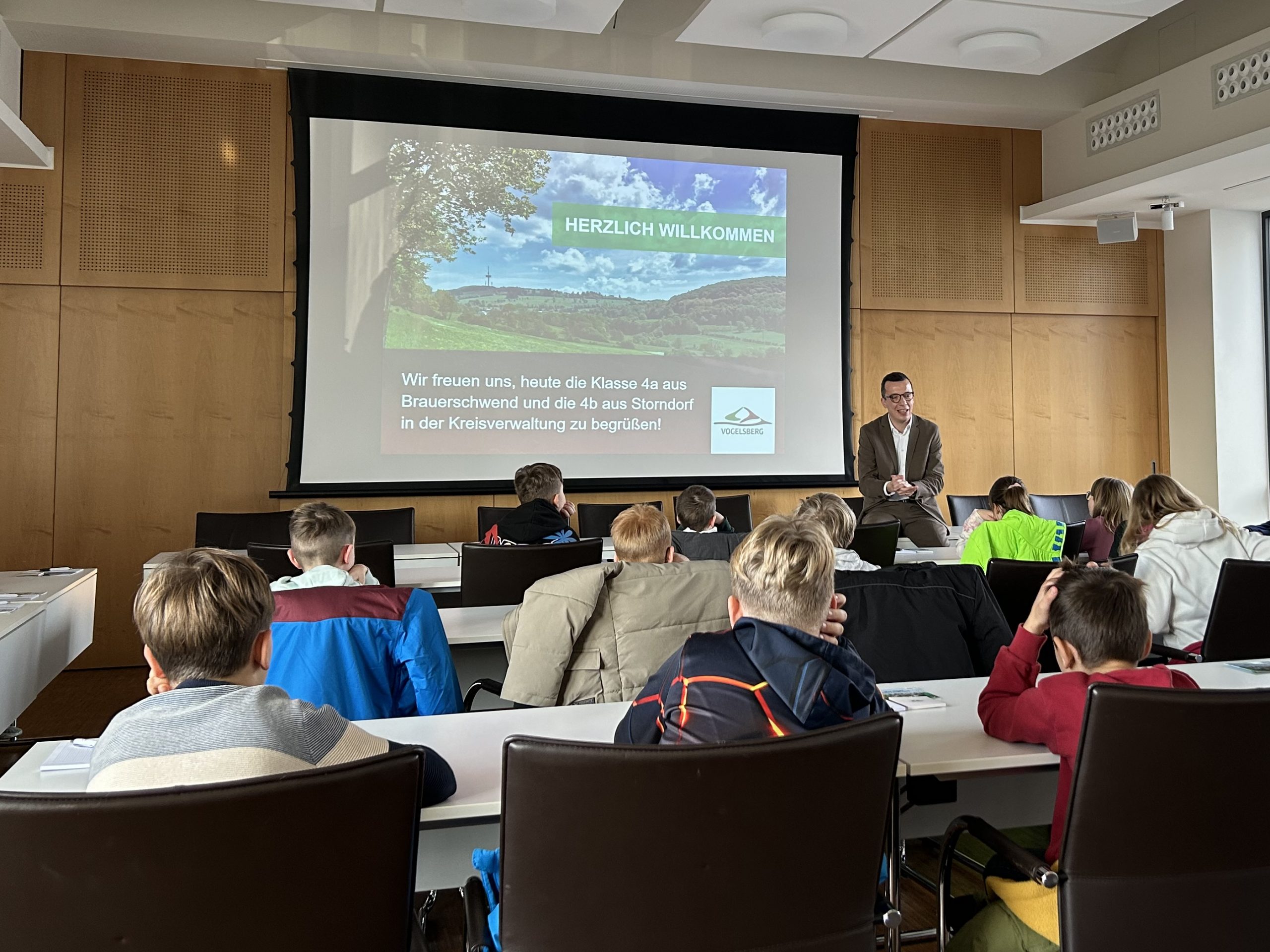 VOGELSBERGKREIS (ol). Die Klassen 4a und 4b der Cornelia-Funke-Schule Schwalmtal haben den Ersten Kreisbeigeordneten Patrick Krug in der Kreisverwaltung besucht und ihm Fragen gestellt, die zwischen Sachkunde und „Freundebuch“ wechselten. Der Besuch bildete den Auftakt zu einer Unterrichtseinheit über den Vogelsbergkreis. Patrick Krug erklärte den Kindern die vielfältigen Aufgaben der Kreisverwaltung – von Tierschutz über Lebensmittelkontrolle und Straßenbau bis zu Schulen und Rettungsdienst – und beantwortete persönliche Fragen zu Hobbys, Lieblingsverein und Kreiswappen.