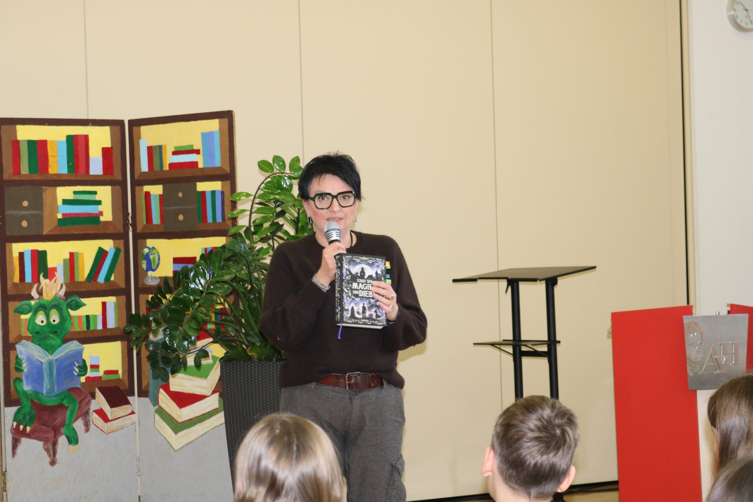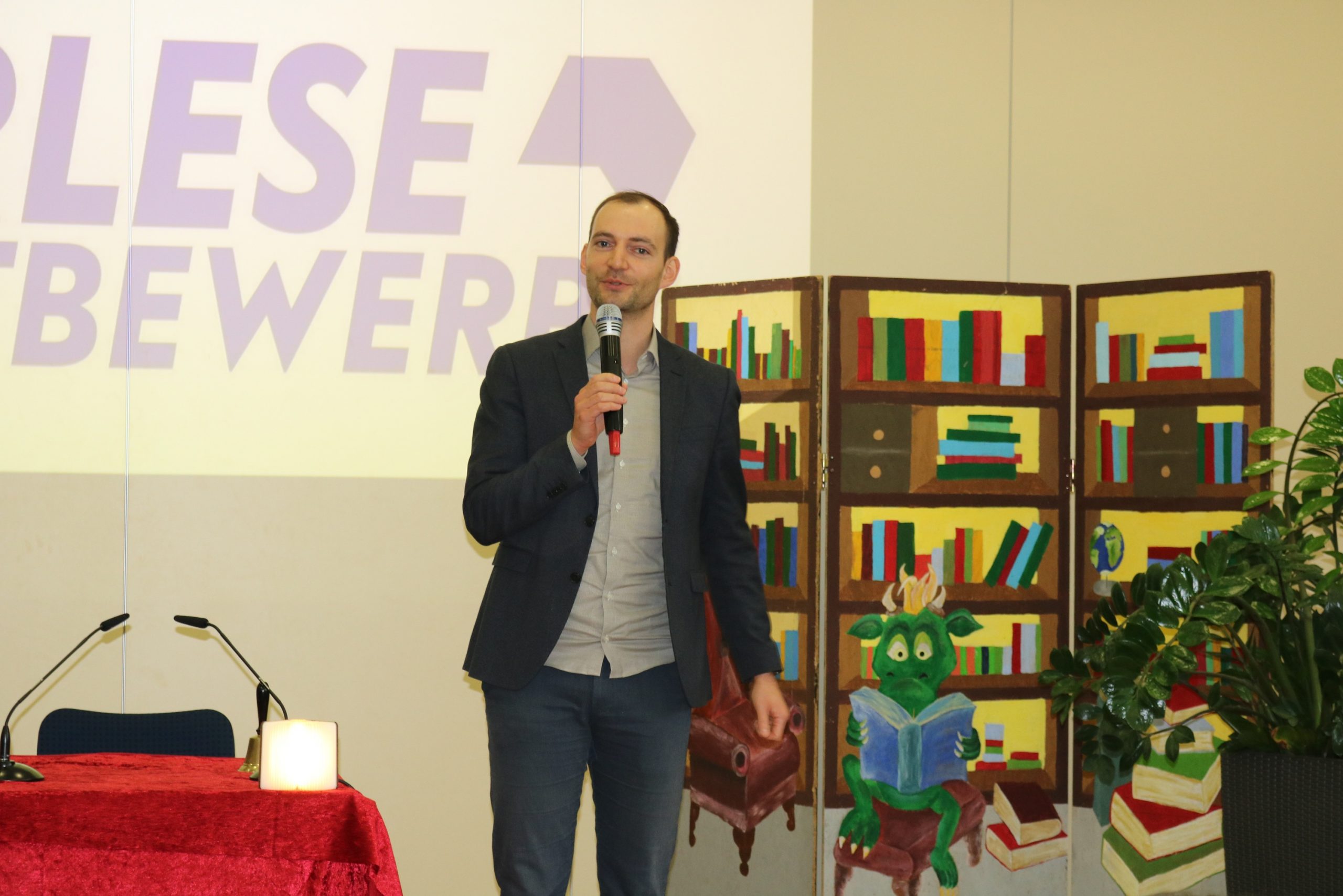 Im ersten Durchlauf konnten sie ihre selbst gewählten Bücher mitbringen – auch dies war eine große Freude: Von Klassikern wie „Robinson Crusoe“ über Fantasy mit der „Schule der Magischen Tiere“ und Krimis wie „Mr. Marple und die Schnüfflerbande“ bis hin zu „Abenteuer eines Döner-Checkers“ (das Buch des späteren Schulsiegers) waren viele interessante Lesetipps dabei, die die Klassensieger professionell vortrugen. Während das Publikum verzückt lauschte, hatte die Jury, besetzt mit den Deutsch-Leistungskurslern Ferdinand Jokisch und Laura Bernhard, der Buchhändlerin Debora Stein, dem Stadtjugendpfleger Andreas Goldbach und dem Pfarrer Sven Kießling, auf viele Kriterien zu achten: Wird sicher und flüssig gelesen? Ist die Aussprache deutlich, das Lesetempo angemessen? Wird der Text inhaltlich atmosphärisch erfasst und gut umgesetzt und ist der Vortrag lebendig und ansprechend, ohne übertrieben zu sein? Diese und weitere Kriterien flossen in die Bewertung ein. Im zweiten Durchlauf wurde es ein wenig schwieriger für die Vorlesenden: Konnten sie sich bei ihrer eigenen Buchauswahl noch vorbereiten, mussten sie nun aus einem Text vorlesen, den sie bisher nicht kannten: Buchhändlerin Debora Stein hatte das Buch „Stadt der Magier und Diebe“ von Judith Mohr mitgebracht. Sowohl der unbekannte Inhalt musste in die Art des Vortrags einfließen als auch mussten unbekannte schwierige Wörter erfasst und vorgelesen werden.