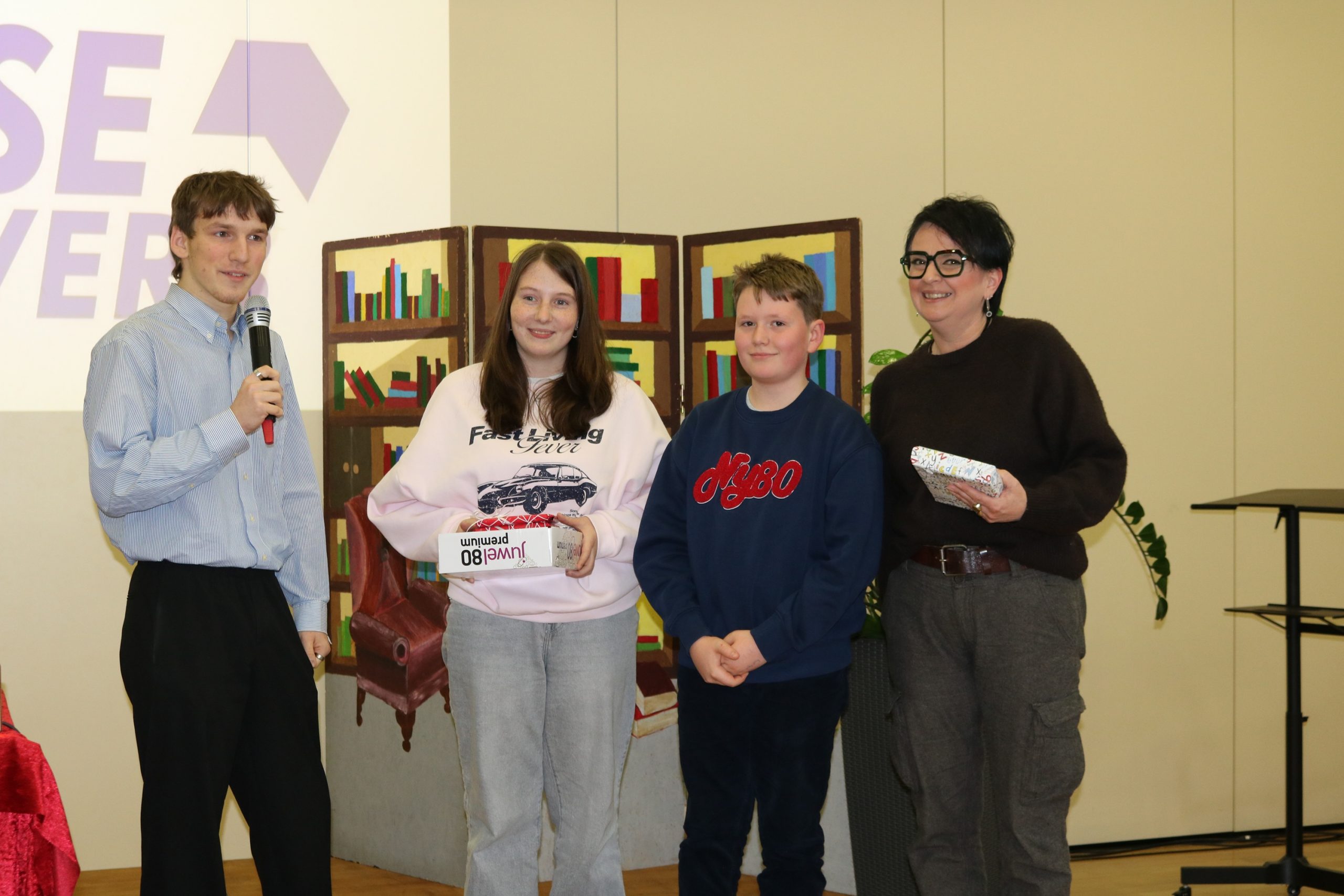 Doch nicht nur Spaß und Freude stecken hinter der Idee des Wettbewerbs, auch pädagogisch hat dieser seine Berechtigung: Lautes Lesen ist zum einen ein wichtiger Baustein zur Entwicklung von Lesekompetenz. Und die teilnehmenden Kinder stärken ihre sozialen und sprachlichen Kompetenzen, erweitern Textverständnis, fördern mit dem Lesen vor Publikum ihr Selbstbewusstsein und trainieren ihre Konzentrationsfähigkeit. Ein Angebot also, von dem alle profitieren, auch das junge Publikum, das sich entspannt zurücklegte, als die acht Wettbewerber zu ihrer Lektüre griffen. An der AvH stellten sich im Vorlesewettbewerb: Luca Stump und Martha Schlaudraff (6a), Maja Fischer und Johann Mischak (6b), Nora Weigel und Hagen Spakin (6c) sowie Ferry Köckritz und Pauline Heiß (6d).