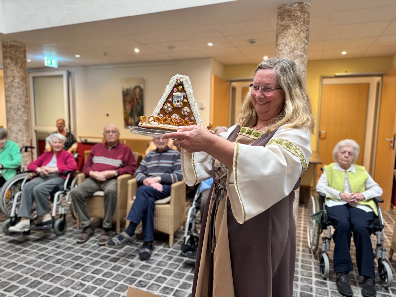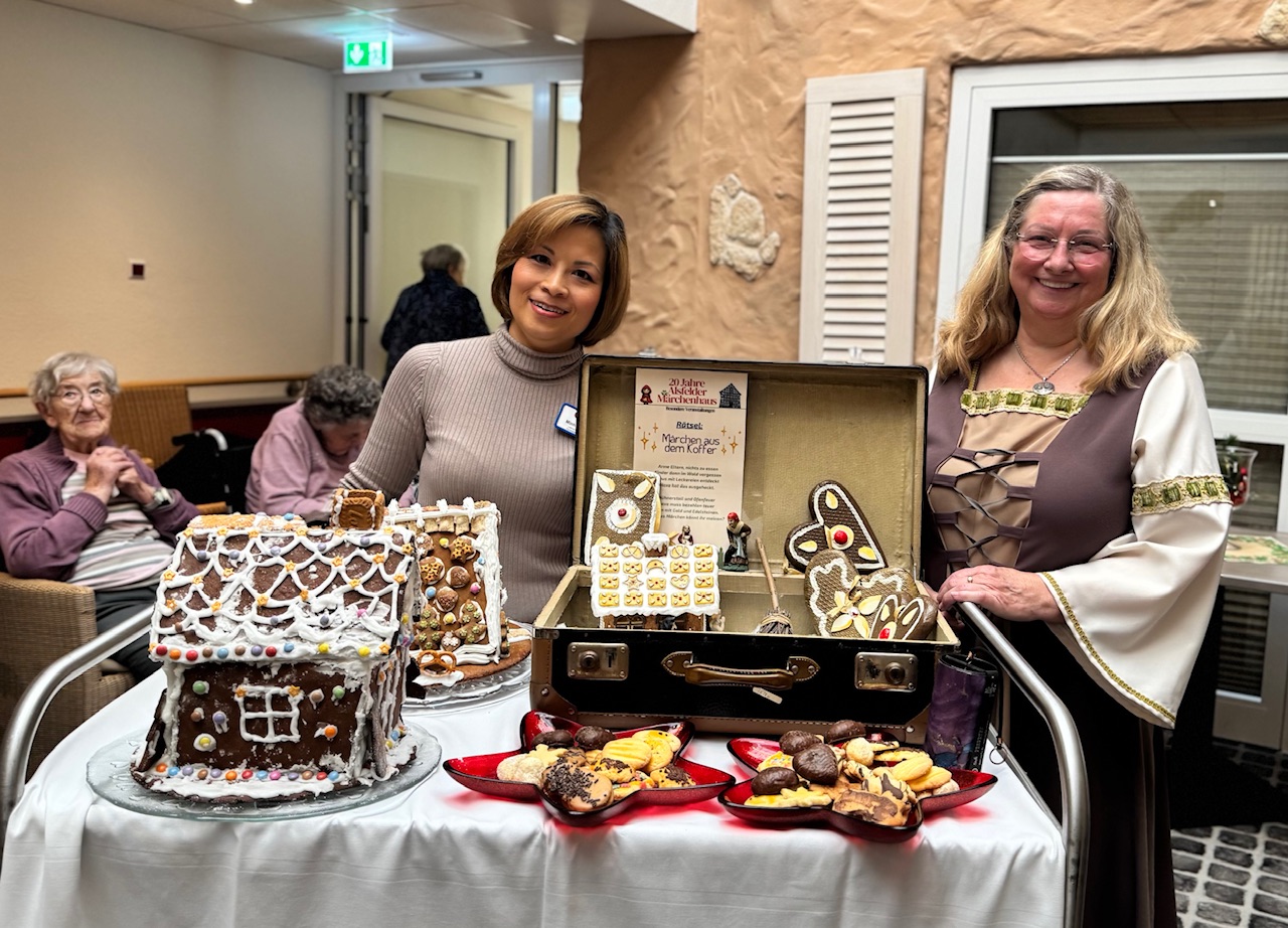 Der dramaturgische Höhepunkt folgte am Marktplatz des Hauses Stephanus, dem offenen Zentrum der Einrichtung. Aus dem Wagen des „Märchenmobils“ wurden die Lebkuchenhäuser gehoben, begleitet von Staunen und leiser Bewunderung. Gemeinsam mit Silvia Völker, Märchenerzählerin aus dem Alsfelder Märchenhaus, stellte Luis das Projekt vor. Dann begann Völker zu erzählen – ihre Stimme legte einen sprachlichen Wald über den Raum. Manche Bewohner sprachen Zeilen mit, andere nickten bei vertrauten Wendungen. Ein Herr murmelte: „Wie früher bei Muttern.“