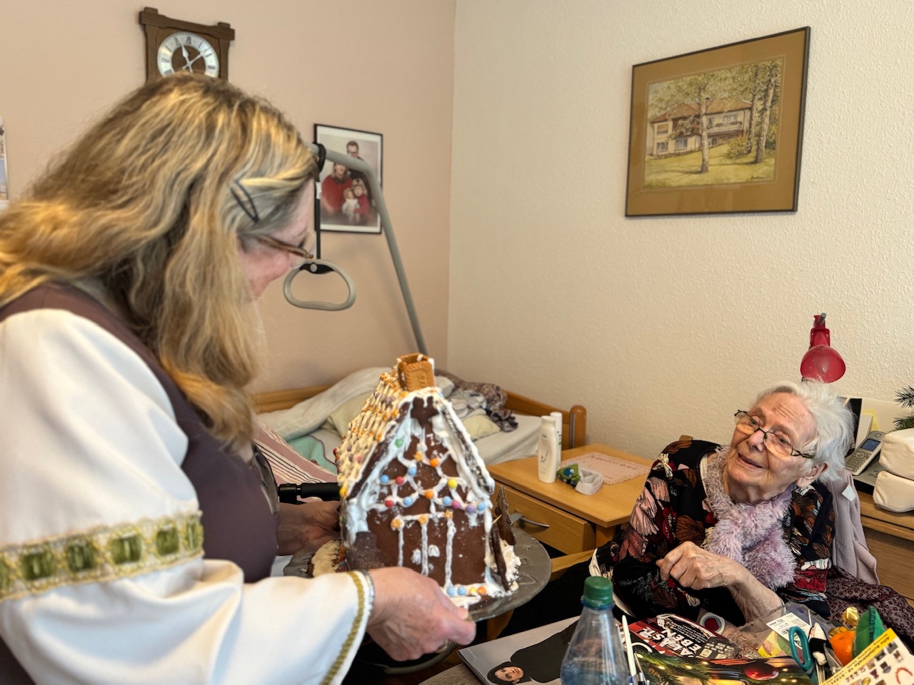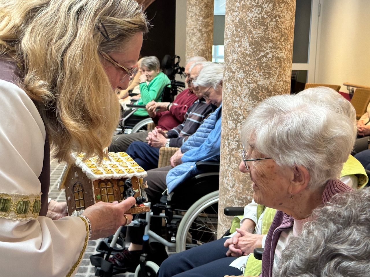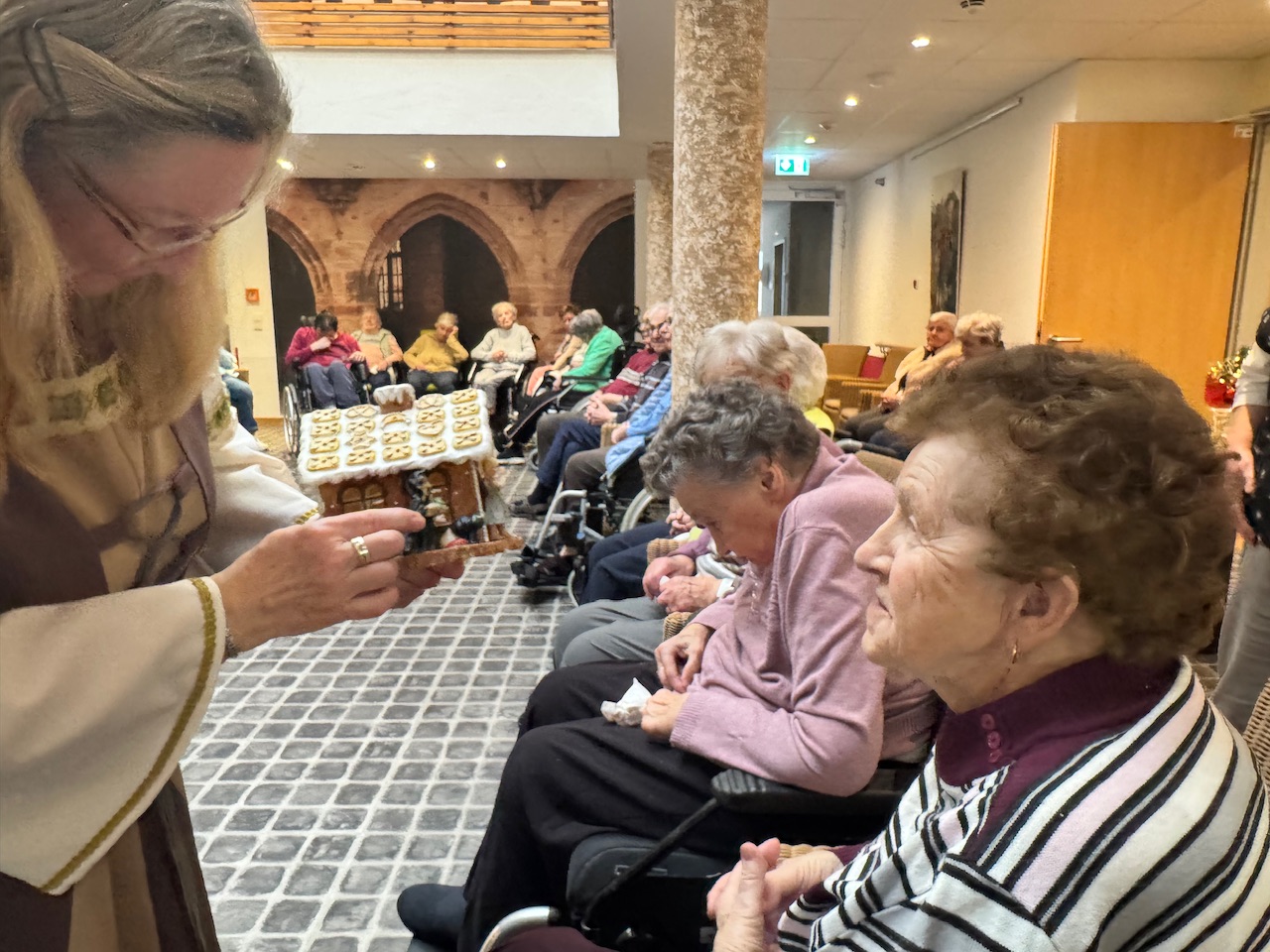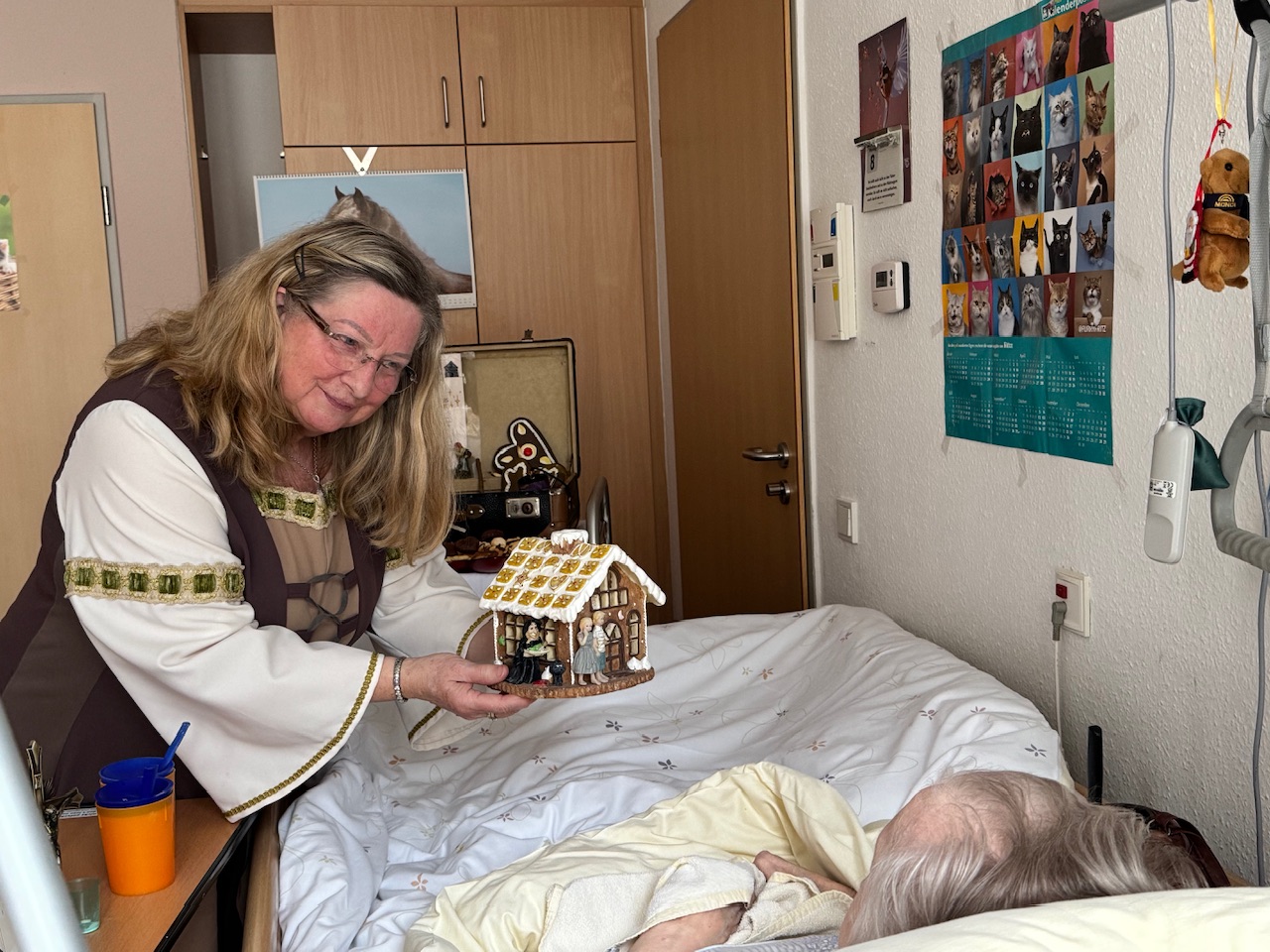 Nach dem öffentlichen Teil begann eine stille, intime zweite Phase: die Zimmerbesuche. Luis und Völker beluden das Märchenmobil erneut – mit Lebkuchenhaus, Plätzchen, Märchenkoffer und kleinen Klang- und Sinnesmaterialien – und machten sich auf den Weg zu Bewohnerinnen und Bewohnern, die nicht mobil sind oder in palliativer Begleitung leben. Dort entfaltete das Märchen seine leise, aber kraftvolle Wirkung. Ein Bewohner, der kaum spricht, begann die ersten Worte der Liedzeile zu formen. Eine Bewohnerin strich vorsichtig über das Lebkuchendach und sagte: „So etwas hätte ich mich zu Hause nie getraut.“ Eine Angehörige am Bett eines schwerkranken Mannes sagte: „So eine Überraschung, so viel Zuwendung… das vergisst man nicht.“