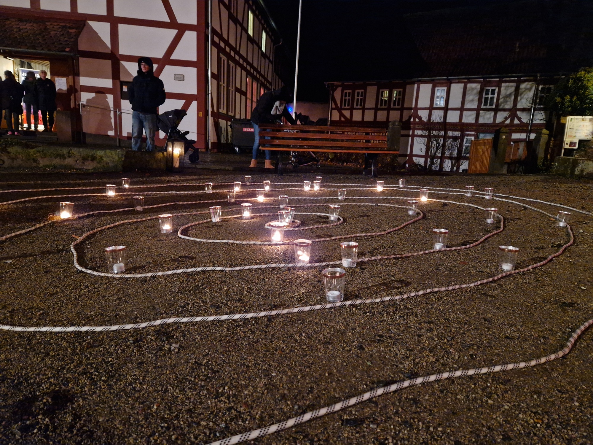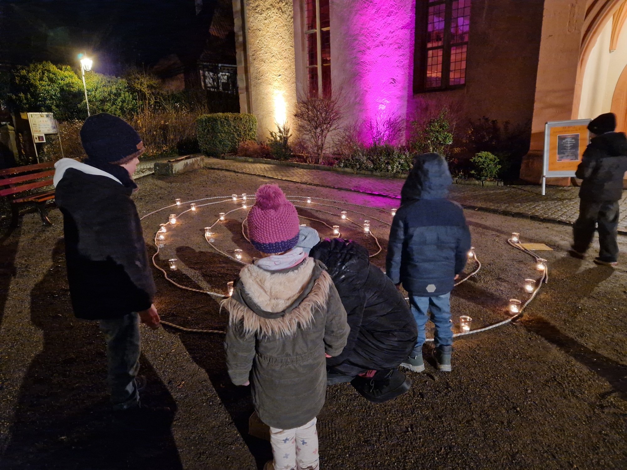 Die Stationen wurden gern und rege besucht: Ein Moment zum Innehalten, zur Selbstreflexion, um rund um eine Feuerschale stehend oder eine Tasse dampfenden Punschs in der Hand haltend mit sich und anderen in Kontakt zu kommen, oder – wie es die Kleinsten gern taten, mit leuchtenden Augen eine Kerze anzuzünden und lachend durch das Lichterlabyrinth zu flitzen. In der Kirche wurde Raum für Stille geboten und die Möglichkeit, sich einen „Segen to go“ mitgeben zu lassen. Wer tiefer in das Thema einsteigen wollte, konnte sich im Pfarrhaus bei Tee und typischen Taizé-Snacks einen Infofilm anschauen.