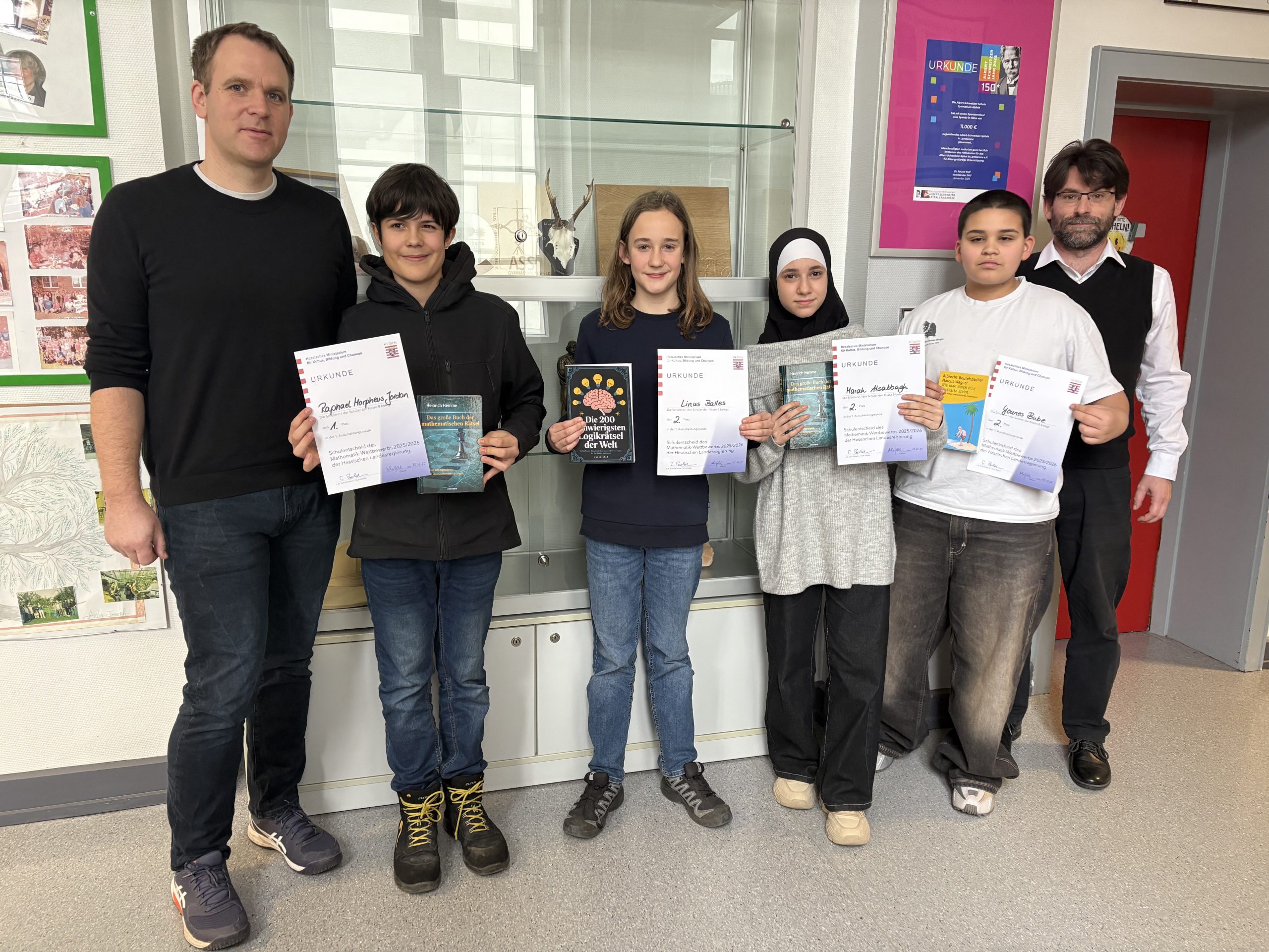 Kürzlich konnte Schulleiter Christian Bolduan gemeinsam mit Fachbereichsleiter Martin Wilhelm die vier Schülerinnen und Schüler auszeichnen, die am Alsfelder Gymnasium besten abgeschnitten haben, so heißt es in der Pressemitteilung des Alsfelder Gymansiums: Raphael Jordan belegte den ersten Platz, den zweiten Platz teilten sich punktgleich Younes Bube, Linus Balles und Marah Alsabbagh. Sie erhielten neben einer Urkunde auch einen Buchpreis und werden die Schule in der zweite Runde Anfang März vertreten, die kreisweit stattfindet. Bolduan wünschte ihnen hierfür viel Erfolg und dankte gleichzeitig Martin Wilhelm für die Durchführung sowie den Mathematiklehrkräften der Jahrgangsstufe 8 für die gute Vorbereitung der Klassen auf den Wettbewerb.
