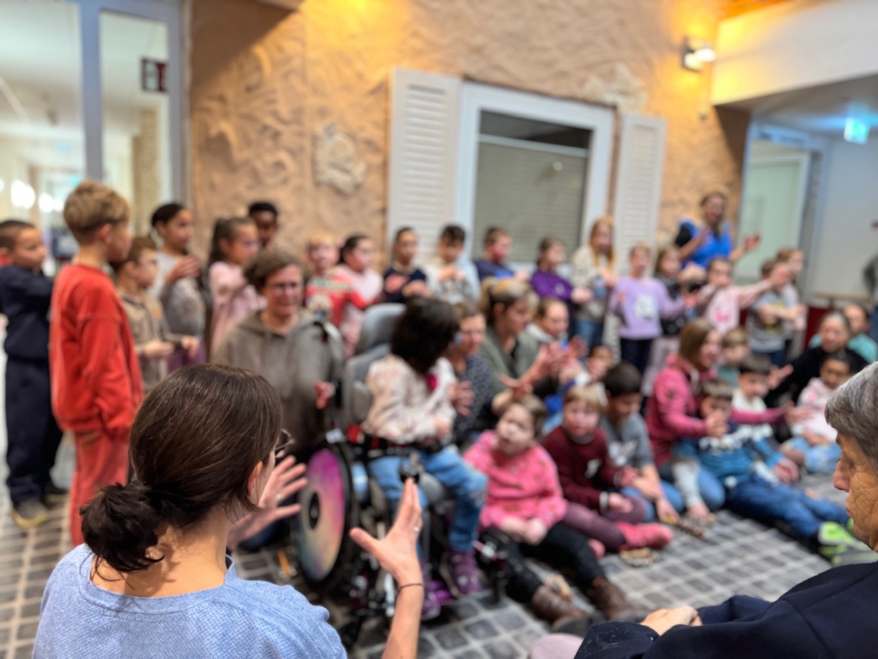 Es folgte ein Kerzentanz. Echte Kerzen waren nicht nötig. Die Kinder hielten imaginäre Lichter in den Händen. „Es ist die dunkle Jahreszeit“, erklärte Koehl später. „Jetzt werden überall Lichter angezündet. Das haben wir uns zunutze gemacht.“ Die Kerzen waren zuvor gemalt, gebastelt, beklebt worden – jedes ein Zeichen von Geduld und Sorgfalt. Zum Kerzenlied nutzten die Kinder Gebärden. Hände wurden zu Sprache, Bewegung zu Bedeutung. Einige Bewohner machten vorsichtig mit, andere verfolgten das Geschehen lächelnd. Distanz entstand keine – Bühne und Publikum verschmolzen.