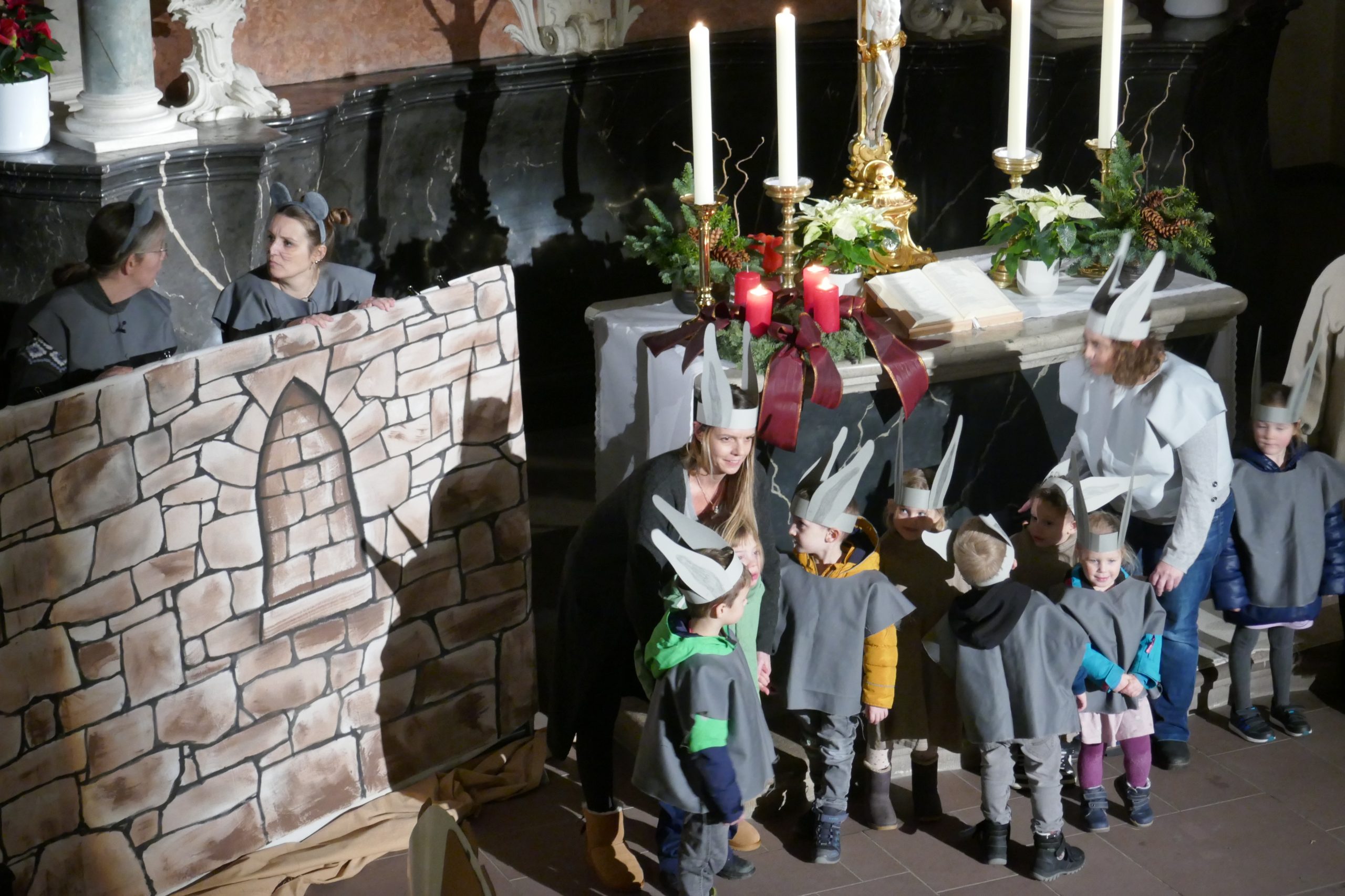 Spannend, unterhaltsam und sehr mitreißend präsentierten die Kinder und ihre Erzieherinnen die Geschichte der kleinen Mäuse Betti und Mini, die von der Stadtmauer aus auf einen König aufmerksam wurden, den sie sodann suchten. Dazu war der Altarraum schön geschmückt mit einem Stall, der Stadtmauer und einem Stadttor. Doch egal, mit welchem Tier sie auch sprachen, niemand wusste etwas von einem König. Irgendwann gaben die kleinen Mäuse auf, kehrten in ihren Stall zurück und fanden dort, was sie suchten: den König, wenn auch ganz anders, als sie sich das vorgestellt hatten.