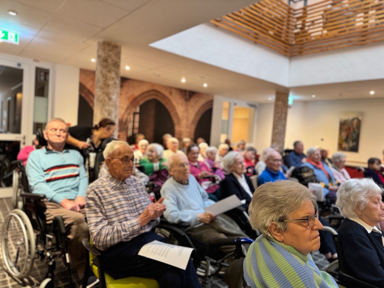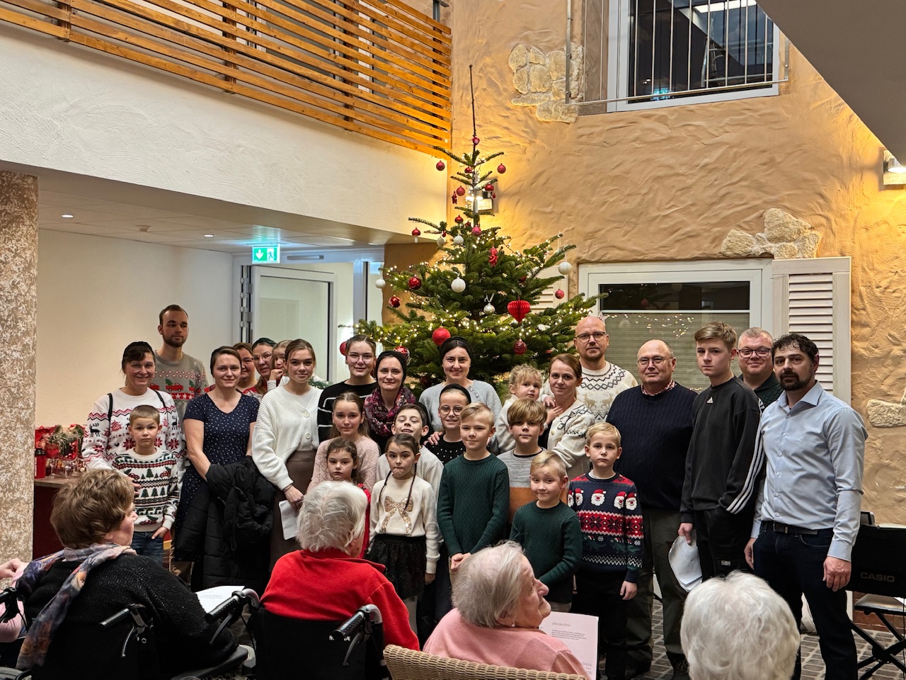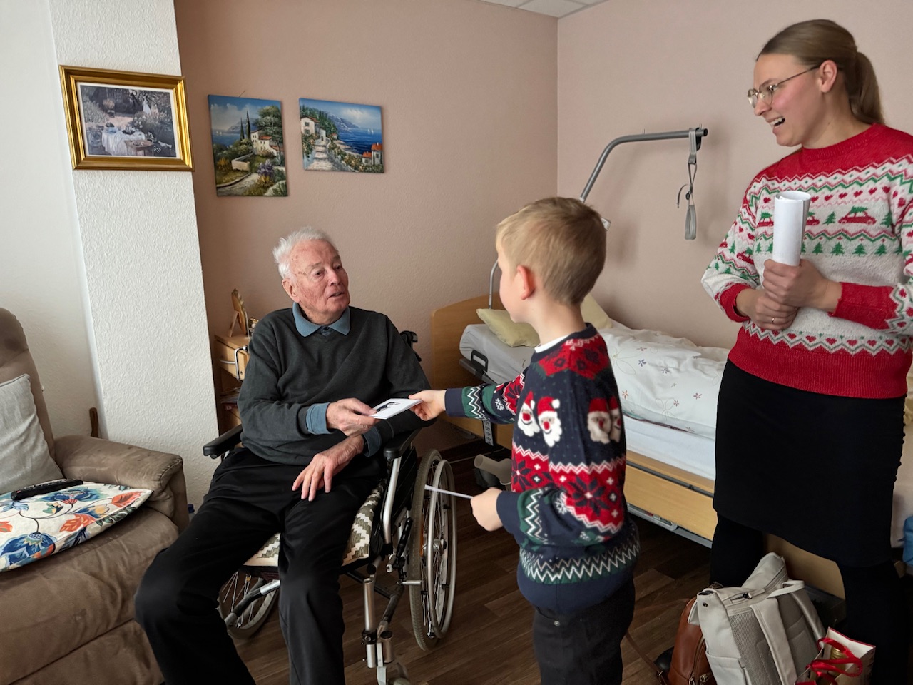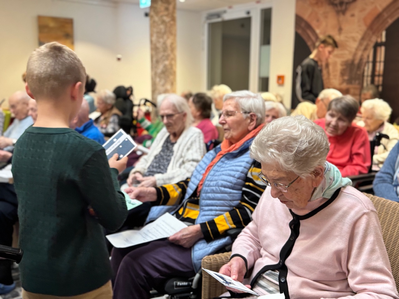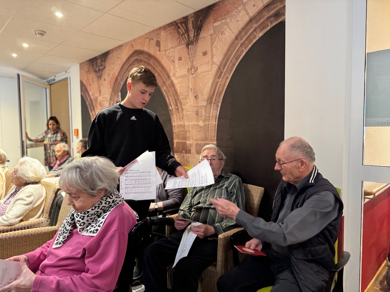 Nach dem gemeinsamen „Stille Nacht“ endet der Nachmittag nicht am Marktplatz. Die Gruppe zieht weiter durchs Haus – von Flur zu Flur, von Zimmer zu Zimmer. Für Bewohnerinnen und Bewohner, die nicht teilnehmen können, gibt es ein Lied, eine handgeschriebene Karte, ein paar ruhige Worte. Es sind kurze Besuche, die lange nachklingen.