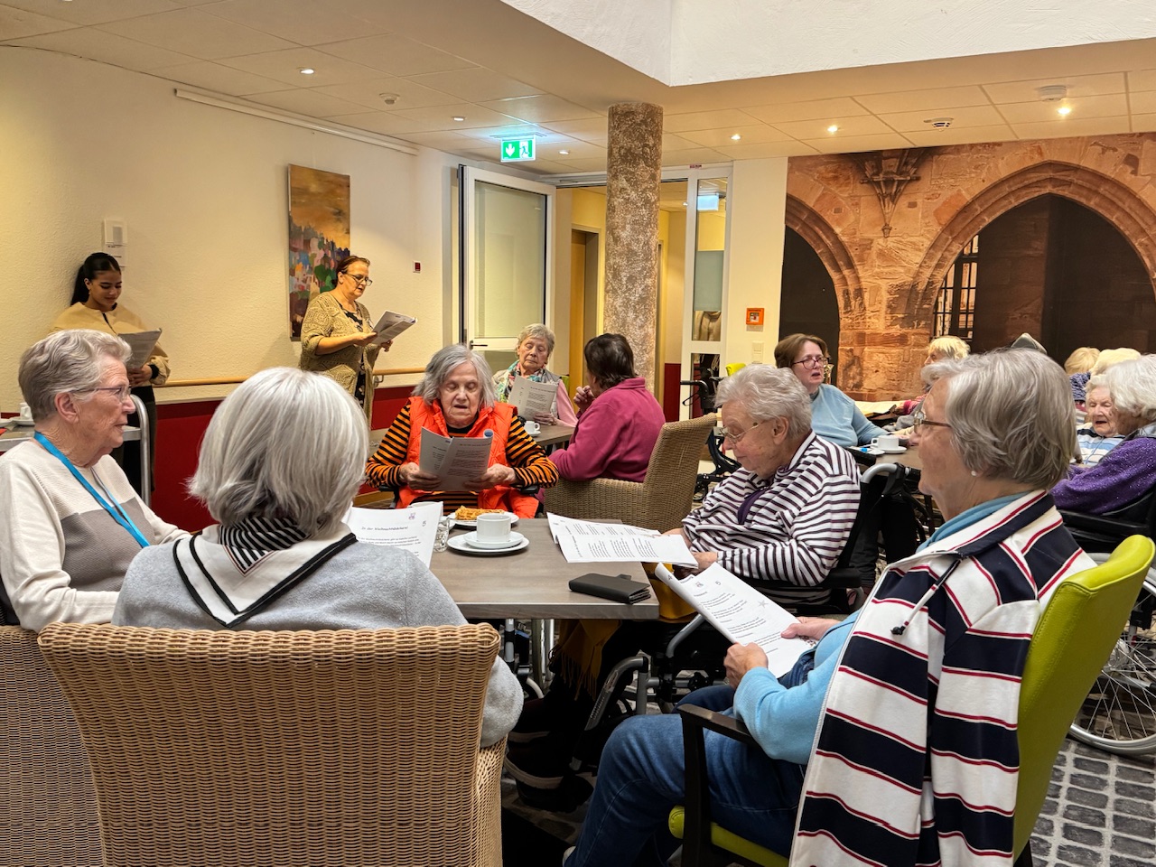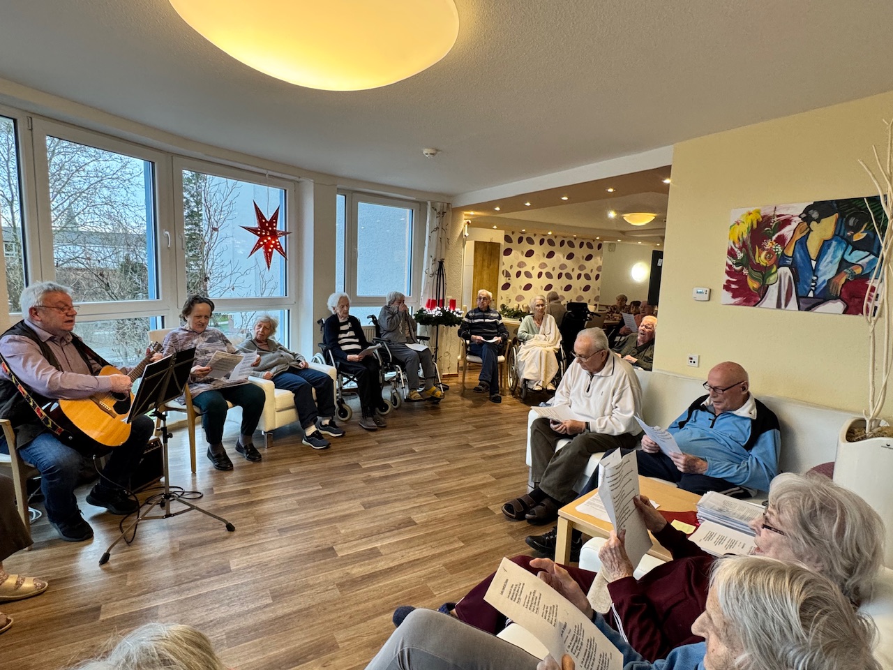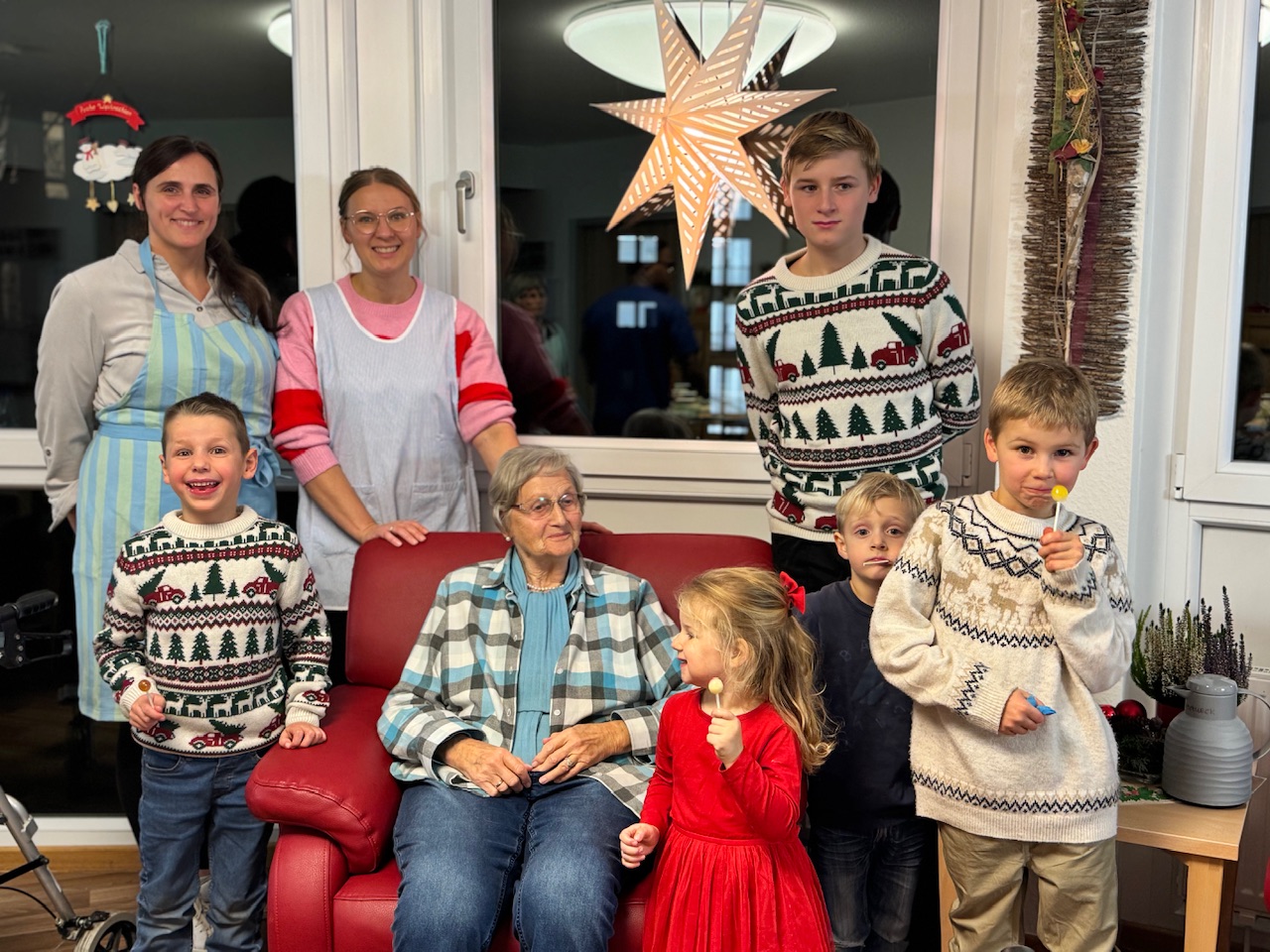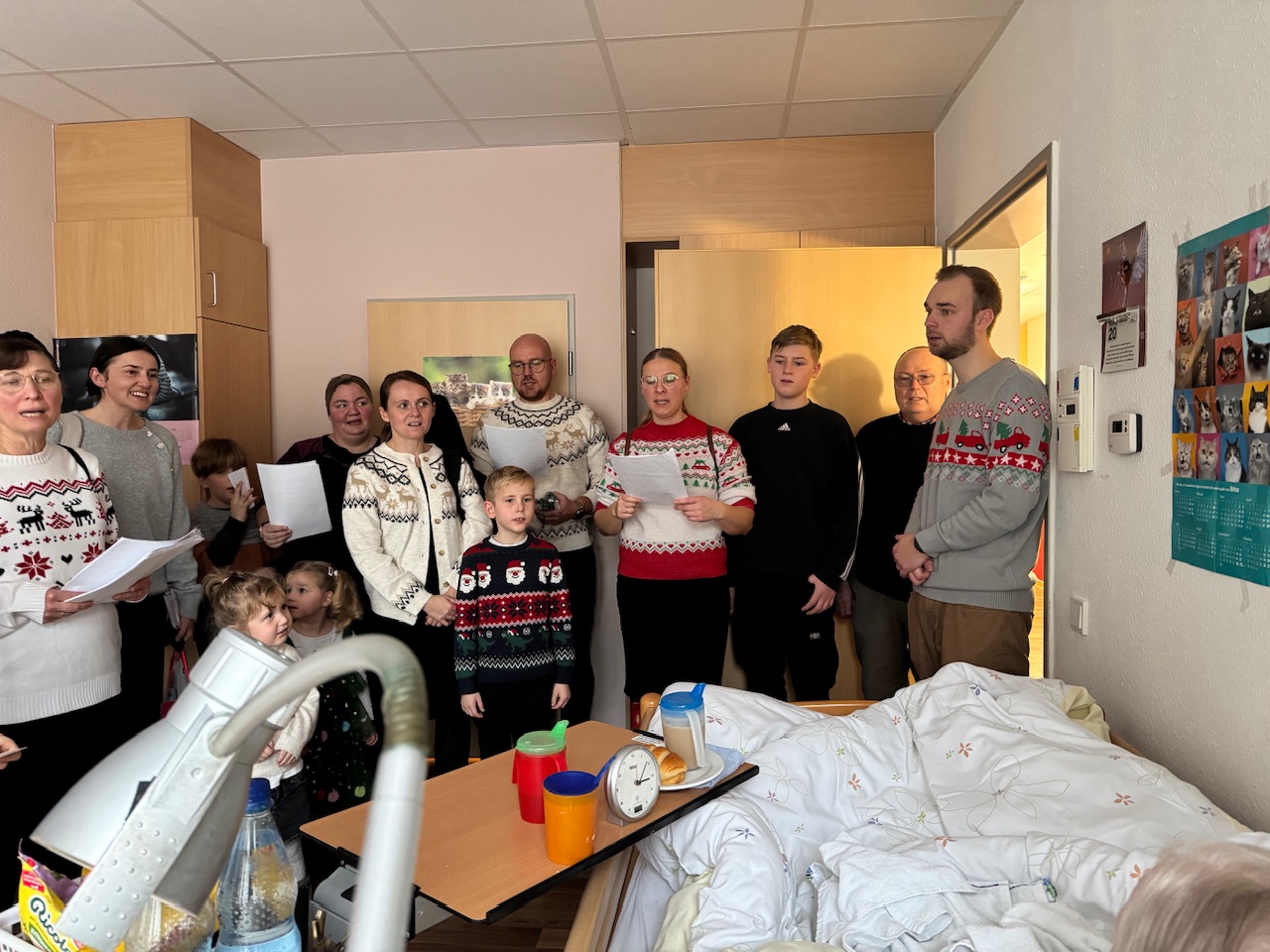 Nach dem gemeinsamen „Stille Nacht“ endet der Nachmittag nicht am Marktplatz. Die Gruppe zieht weiter durchs Haus – von Flur zu Flur, von Zimmer zu Zimmer. Für Bewohnerinnen und Bewohner, die nicht teilnehmen können, gibt es ein Lied, eine handgeschriebene Karte, ein paar ruhige Worte. Es sind kurze Besuche, die lange nachklingen.