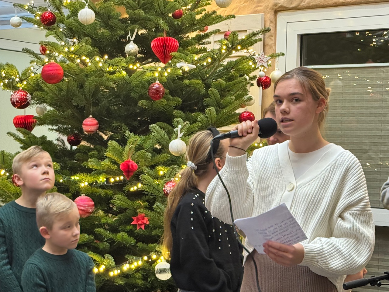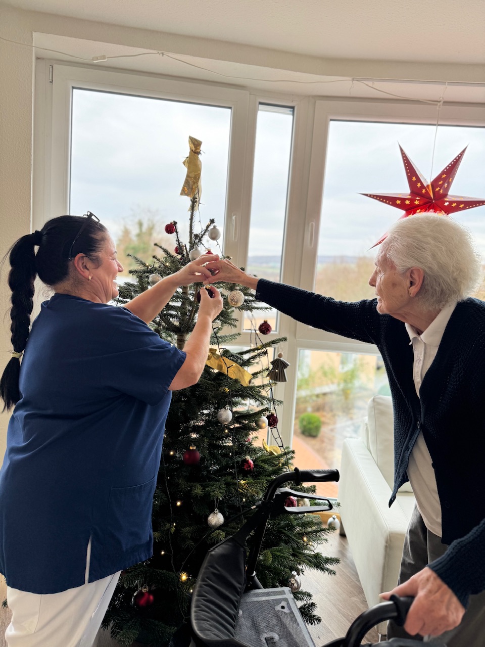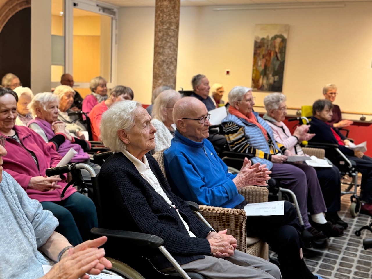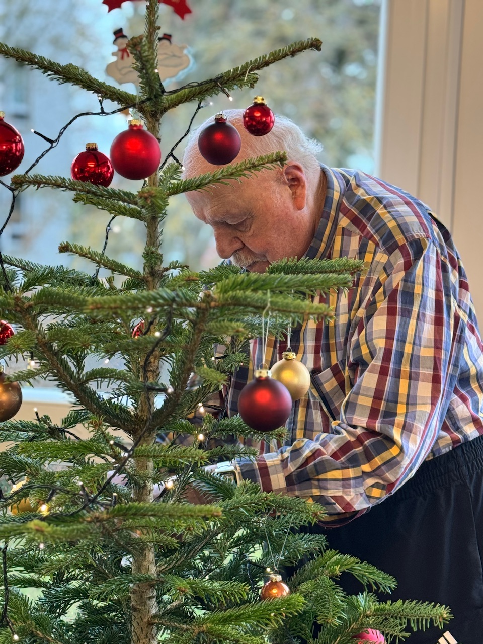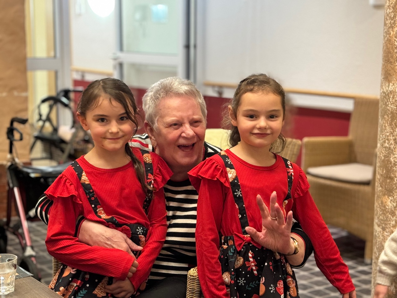 Nach dem gemeinsamen „Stille Nacht“ endet der Nachmittag nicht am Marktplatz. Die Gruppe zieht weiter durchs Haus – von Flur zu Flur, von Zimmer zu Zimmer. Für Bewohnerinnen und Bewohner, die nicht teilnehmen können, gibt es ein Lied, eine handgeschriebene Karte, ein paar ruhige Worte. Es sind kurze Besuche, die lange nachklingen.