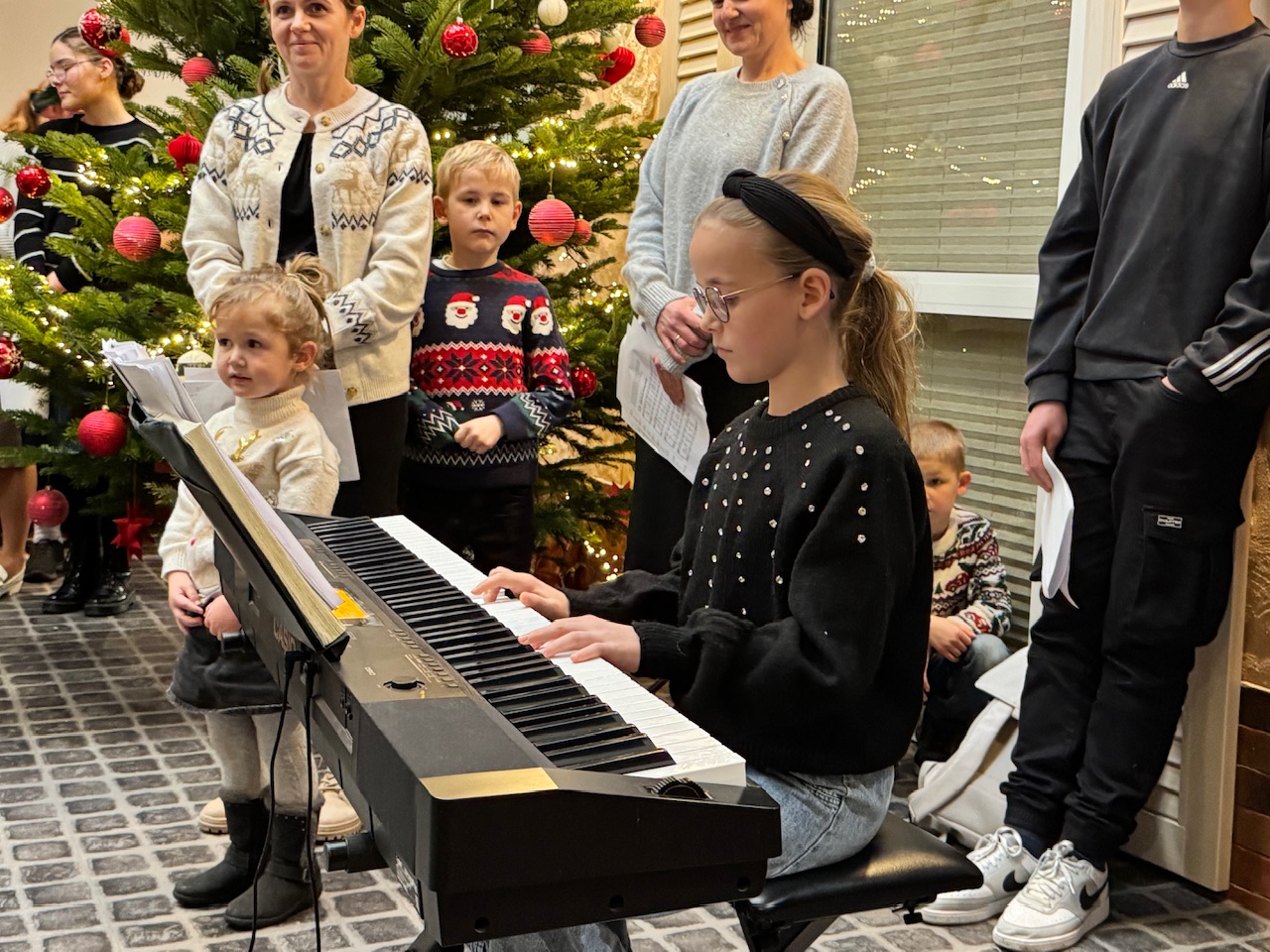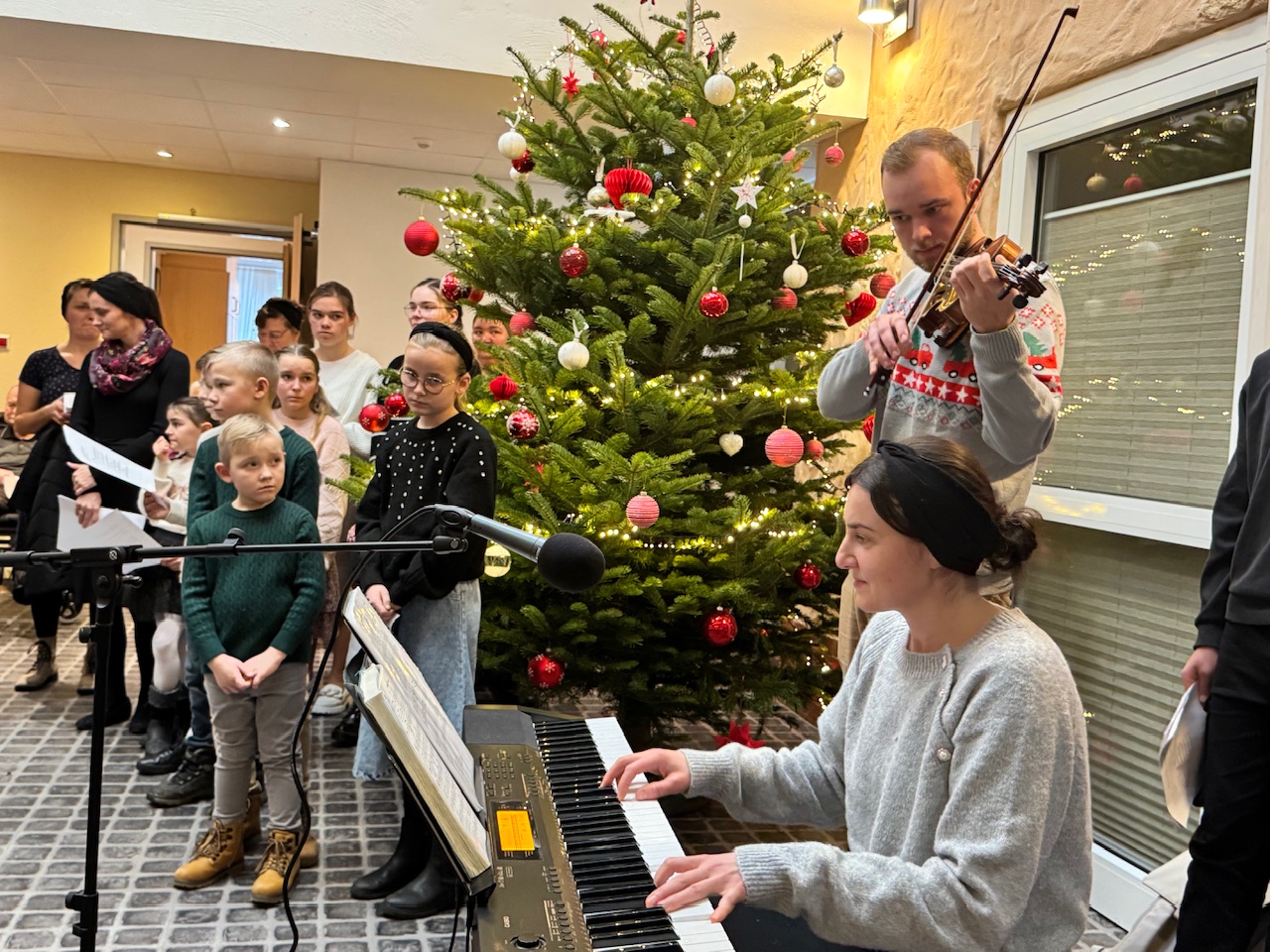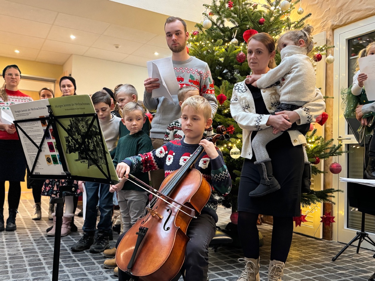 Auch junge Musikerinnen und Musiker gestalten das Programm. Samuel Unterberg begleitet am Cello, Eduard Jeske spielt Akkordeon. Später kommt Leon Wiese mit der Geige hinzu – ein Instrument, das er nach Angaben der Beteiligten erst seit zwei Jahren lernt. Am Klavier sitzt Emylia Unterberg. Samuel ist sieben Jahre alt, Emylia zehn; beide musizieren seit dem fünften Lebensjahr.