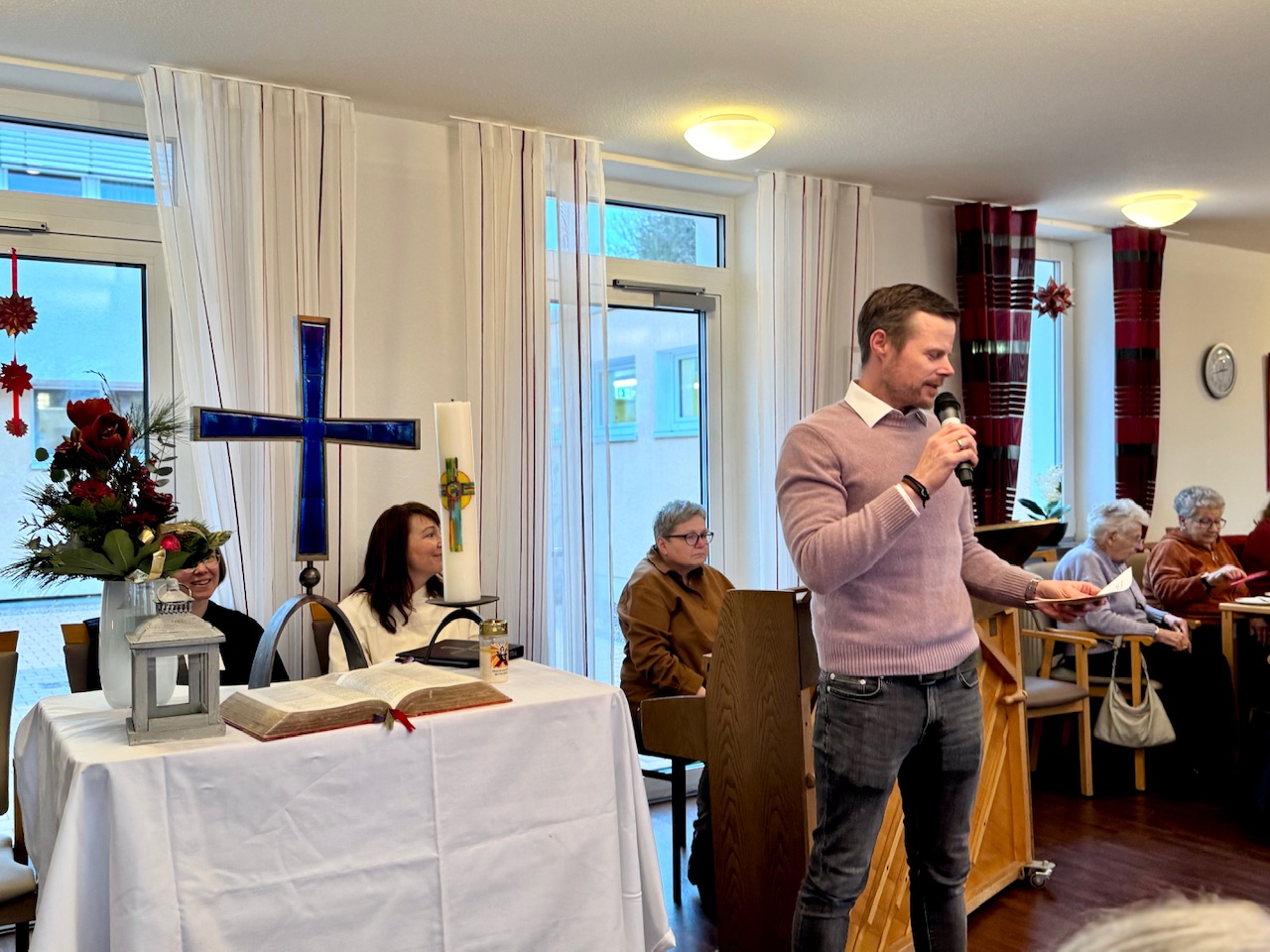 Einrichtungsleiter Manuel Jöckel eröffnete den Nachmittag mit einem klaren Akzent. Weihnachten sei ein Fest der Wärme, der Erinnerung und der Gemeinschaft, sagte er – gerade an einem Ort, an dem viele Lebensgeschichten zusammenkämen.