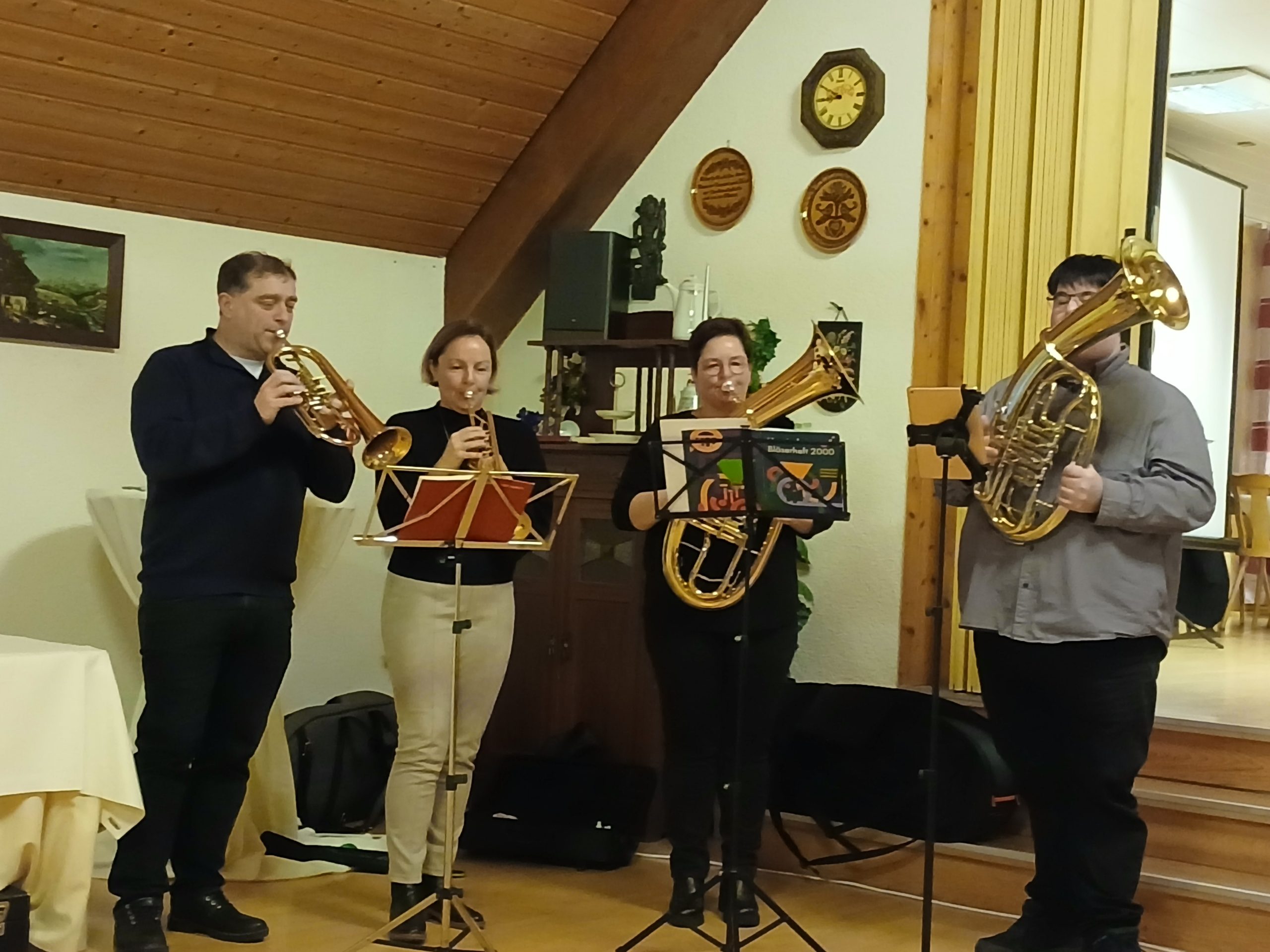 Musikalisch wurde die weihnachtliche Zusammenkunft traditionell von einer Minimalbesetzung aus den eigenen Reihen umrahmt. Diesmal hatten sich mit Sabine Geißel, Daniela Rüffer-Winkler, Mark Herget und Lars Wicke vier Musiker dieser Aufgabe angenommen, die in diesem Jahr bereits 40 Jahre zusammen Musik im Posaunenchor Schwarz machen. Die übrigen Anwesenden sangen zu den dargebotenen alten Weihnachtsliedern mit Inbrunst. Den Abschluss des Abends bildetet ein Jahresrückblick mit Bildern der musikalischen Aktivitäten von Matthias Muhl.