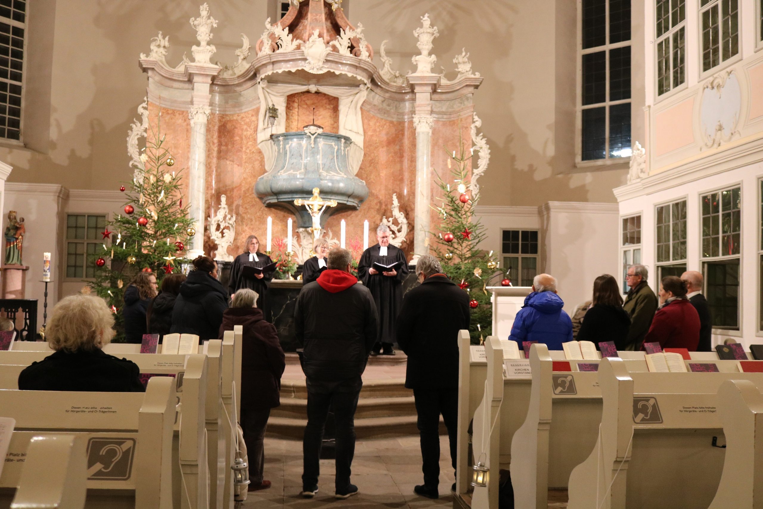 Kein Wunder also, dass zu dieser besonderen Ehrung, von der Jutta Heß an diesem Abend überrascht wurde, viele Gäste in die Stadtkirche gekommen waren: Neben ihrer Familie waren auch Dekanin Dr. Dorette Seibert und Martin Reibeling, der kommissarische Präses des Evangelischen Dekanats, anwesend. Von der katholischen Pfarrei nahmen Hedwig Kluth und Bernd Staubach an dem Gottesdienst teil. Die Patronatsfamilie war mit Ulrike Freifrau Riedesel zu Eisenbach und Henn Freiherr Riedesel zu Eisenbach vertreten. Auch Bürgermeister Rainer-Hans Vollmöller war unter den Gratulanten. Doch nicht nur sie, alle Gemeindeglieder nutzten die Auszeichnung, um ihrerseits Jutta Heß ihre Wertschätzung auszudrücken: Sie dankten mit stehendem Applaus für den Einsatz der Geehrten und reihten sich gerne in die lange Schlange der Gratulanten ein.