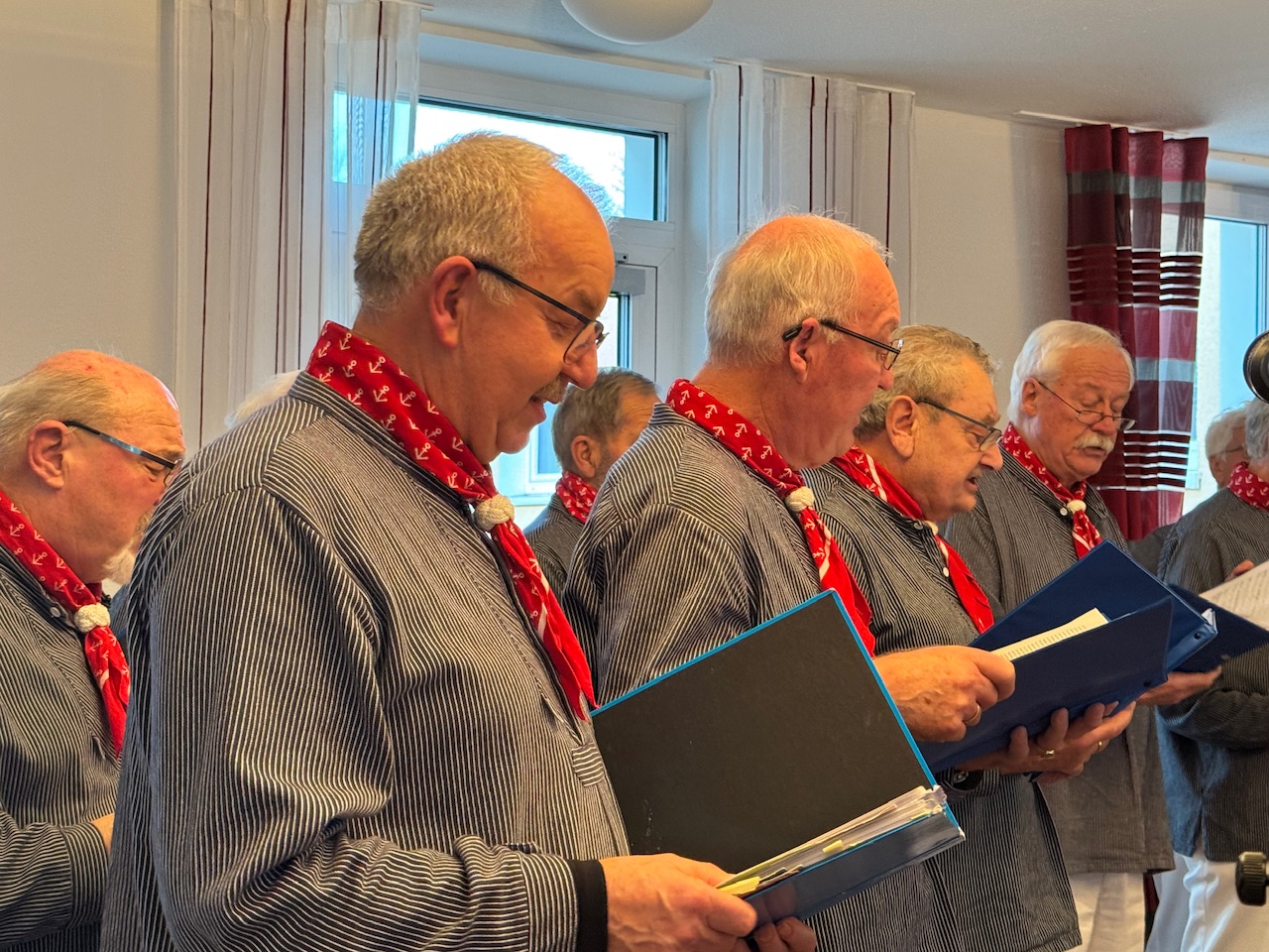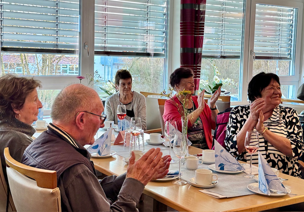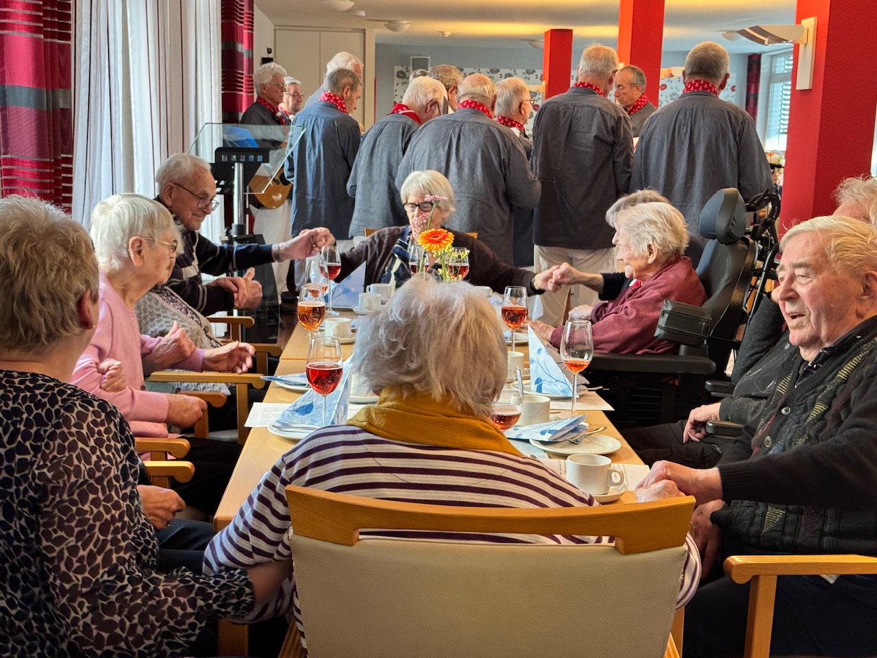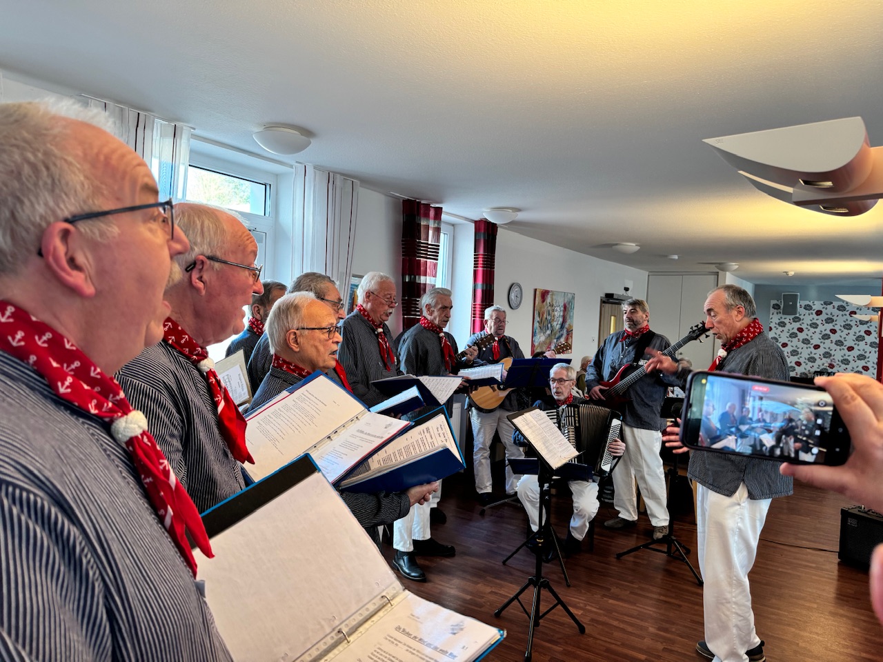 Mit Stücken wie „Die Wolken, der Wind und das weite Meer“ wurde das raue Leben der Seeleute besungen, später schlugen Volkslieder eine Brücke in biografische Erinnerungsräume. Spätestens beim gemeinsamen Singen verschwammen die Grenzen zwischen Chor und Publikum. Bewohnerinnen und Bewohner stimmten ein, manche leise, manche textsicher. Auch Menschen mit Demenz sangen mit, getragen von Melodie und Rhythmus. Kurze Reaktionen aus dem Publikum fassten die Stimmung zusammen. „Das war schön.“ „Kräftige Stimmen.“ „Das ist Heimat.“