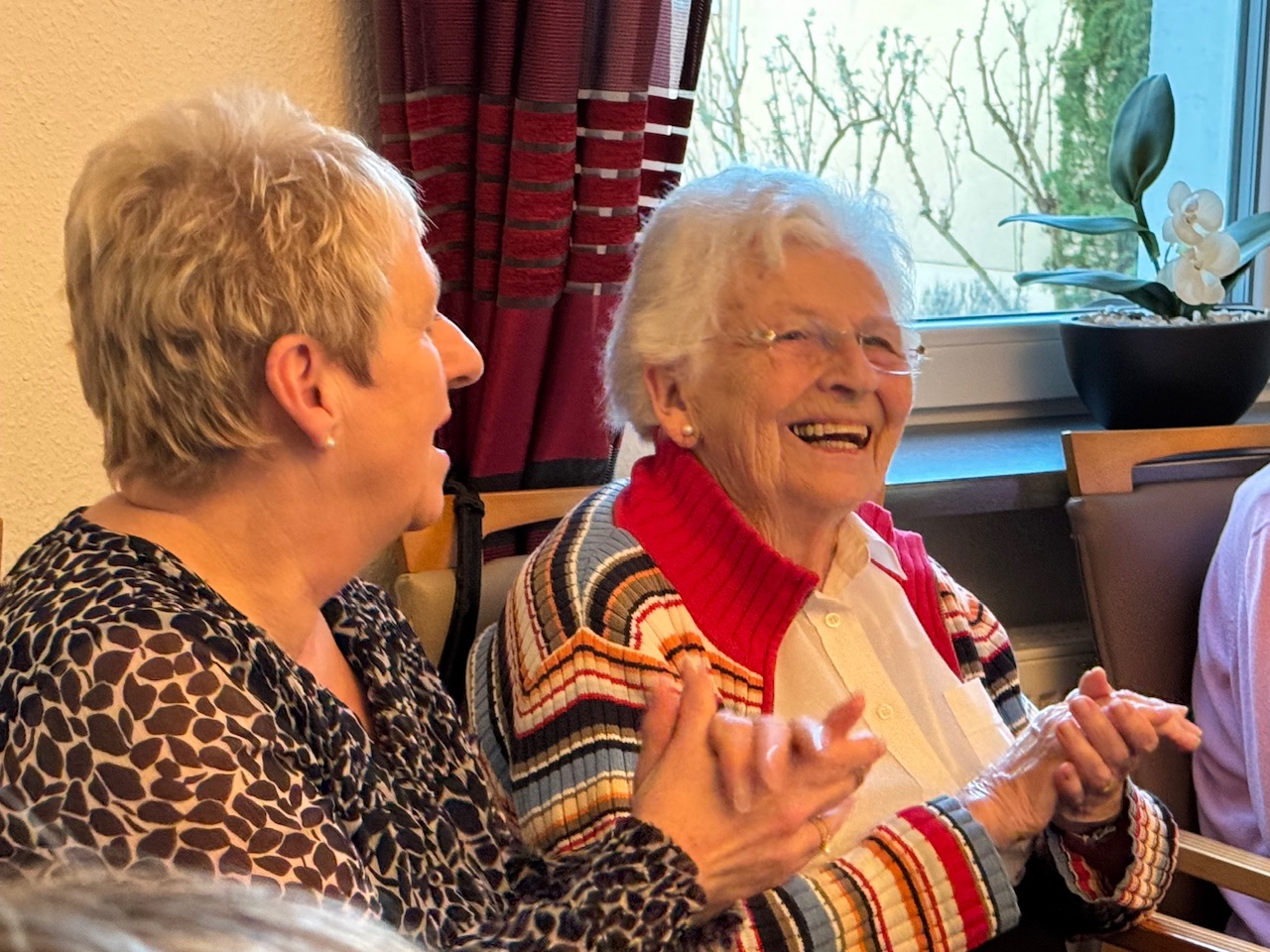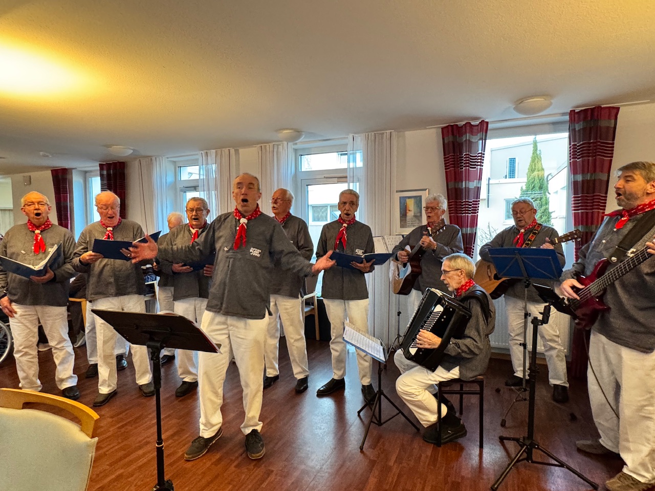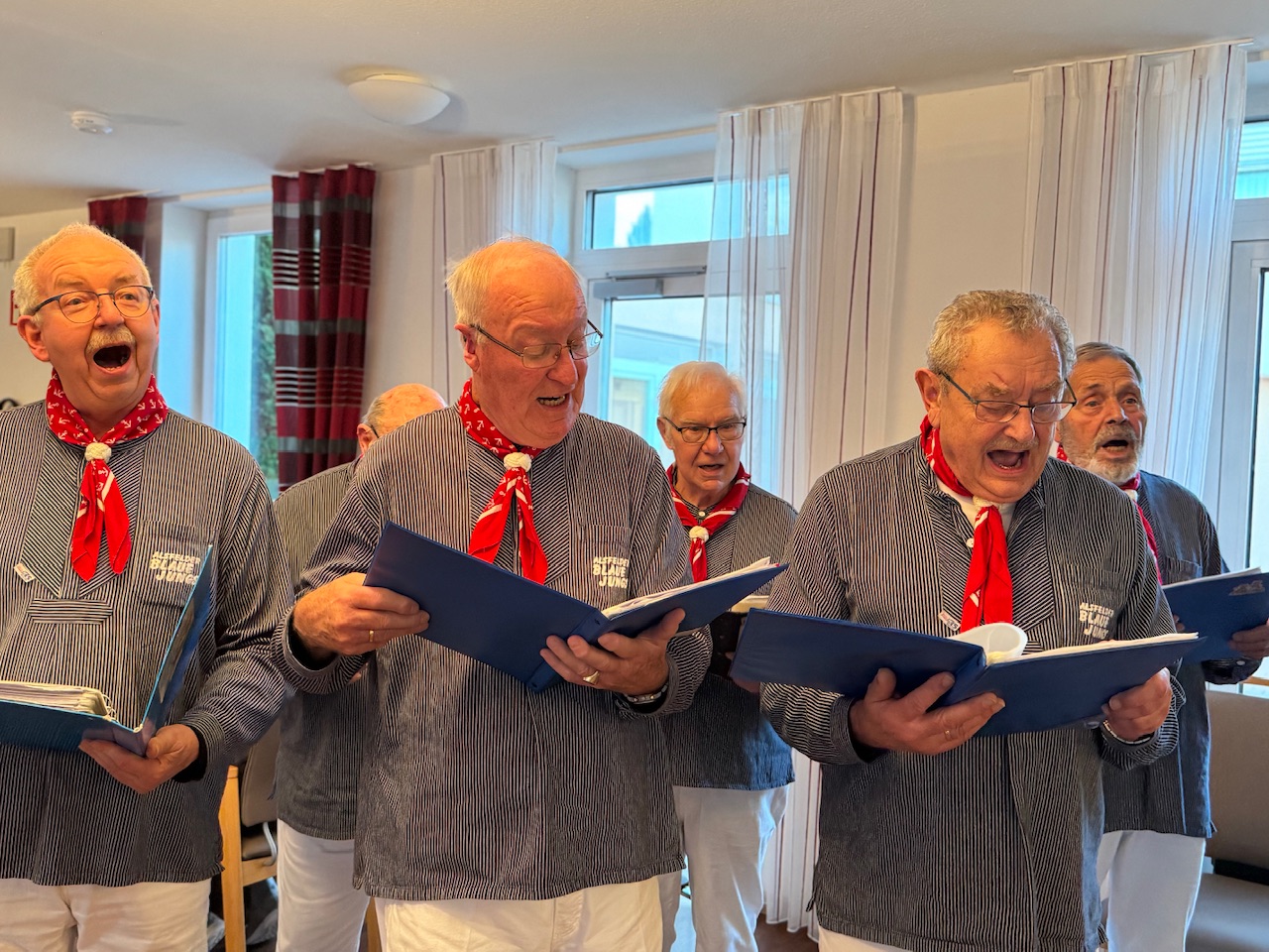 Mit Stücken wie „Die Wolken, der Wind und das weite Meer“ wurde das raue Leben der Seeleute besungen, später schlugen Volkslieder eine Brücke in biografische Erinnerungsräume. Spätestens beim gemeinsamen Singen verschwammen die Grenzen zwischen Chor und Publikum. Bewohnerinnen und Bewohner stimmten ein, manche leise, manche textsicher. Auch Menschen mit Demenz sangen mit, getragen von Melodie und Rhythmus. Kurze Reaktionen aus dem Publikum fassten die Stimmung zusammen. „Das war schön.“ „Kräftige Stimmen.“ „Das ist Heimat.“