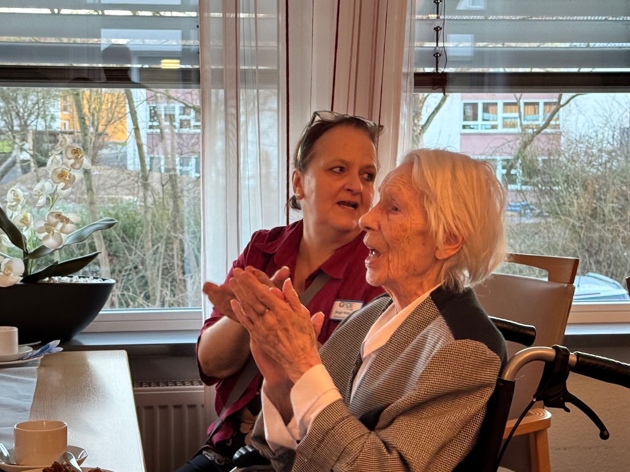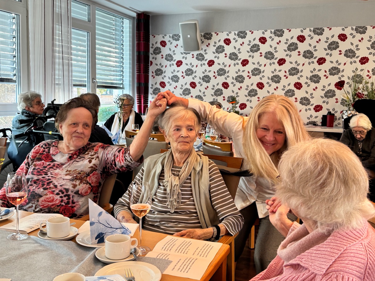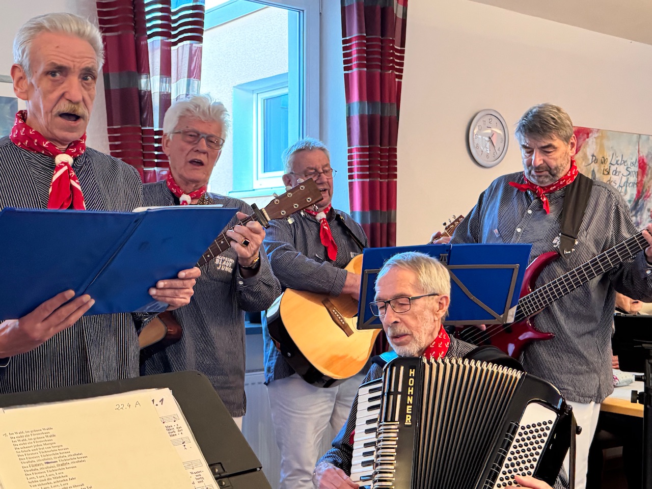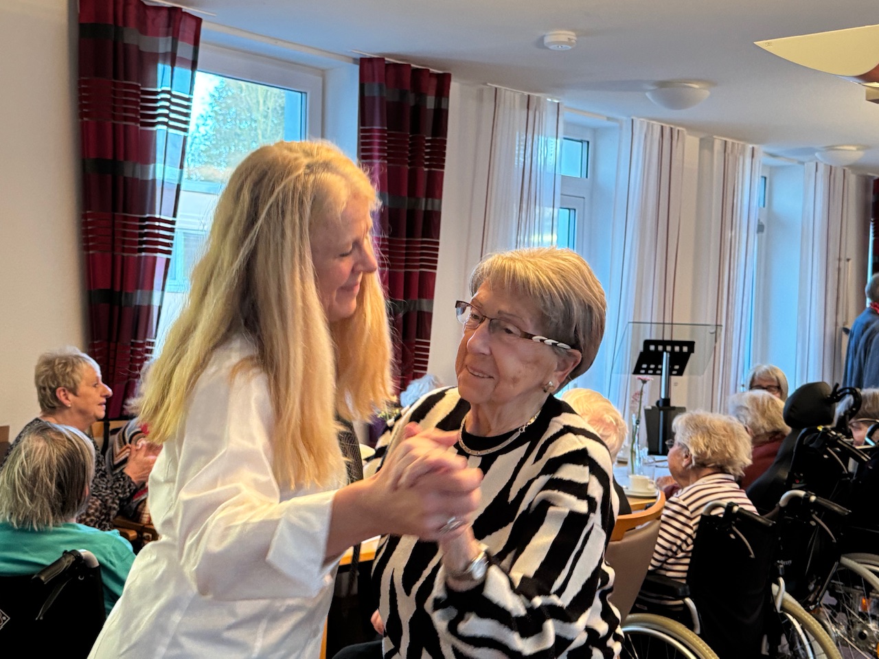 Mit Stücken wie „Die Wolken, der Wind und das weite Meer“ wurde das raue Leben der Seeleute besungen, später schlugen Volkslieder eine Brücke in biografische Erinnerungsräume. Spätestens beim gemeinsamen Singen verschwammen die Grenzen zwischen Chor und Publikum. Bewohnerinnen und Bewohner stimmten ein, manche leise, manche textsicher. Auch Menschen mit Demenz sangen mit, getragen von Melodie und Rhythmus. Kurze Reaktionen aus dem Publikum fassten die Stimmung zusammen. „Das war schön.“ „Kräftige Stimmen.“ „Das ist Heimat.“