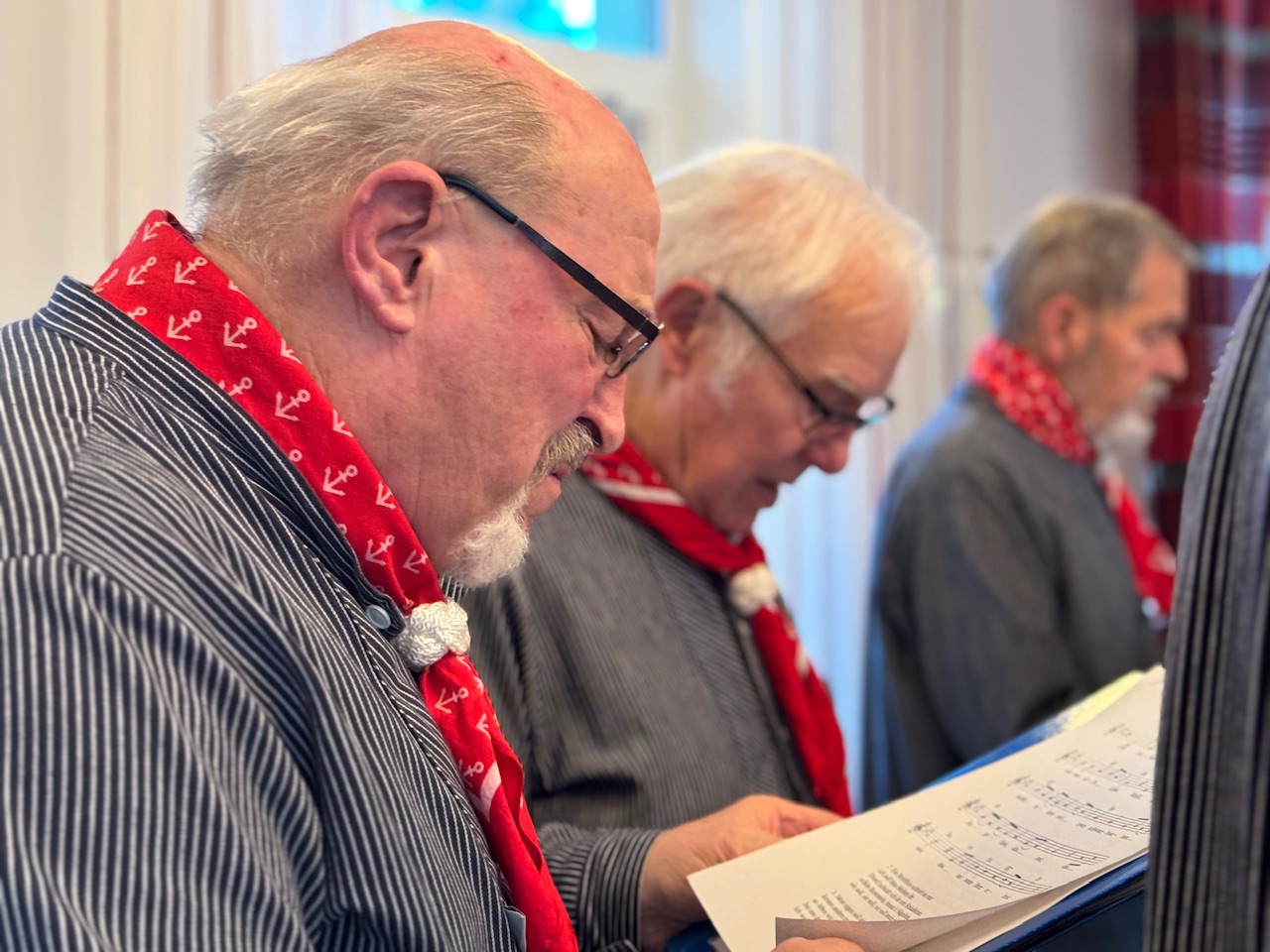 Nach dem Gottesdienst begann der Konzertteil. Wilfried Geißler, Chorleiter des Vereins, begrüßte die Gäste und skizzierte kurz Geschichte und Ausrichtung des Chors. Unter der Leitung von Dirigent Rolf Horten entfaltete sich ein Programm zwischen Seefahrerromantik, Heimatlied und Wunschkonzert. Gitarren, Akkordeon und Gesang nahmen das Publikum mit auf imaginäre Reisen, etwa mit „Der weiße Mond von Maratonga“ oder dem Medley „Eine Reise ins Glück“.