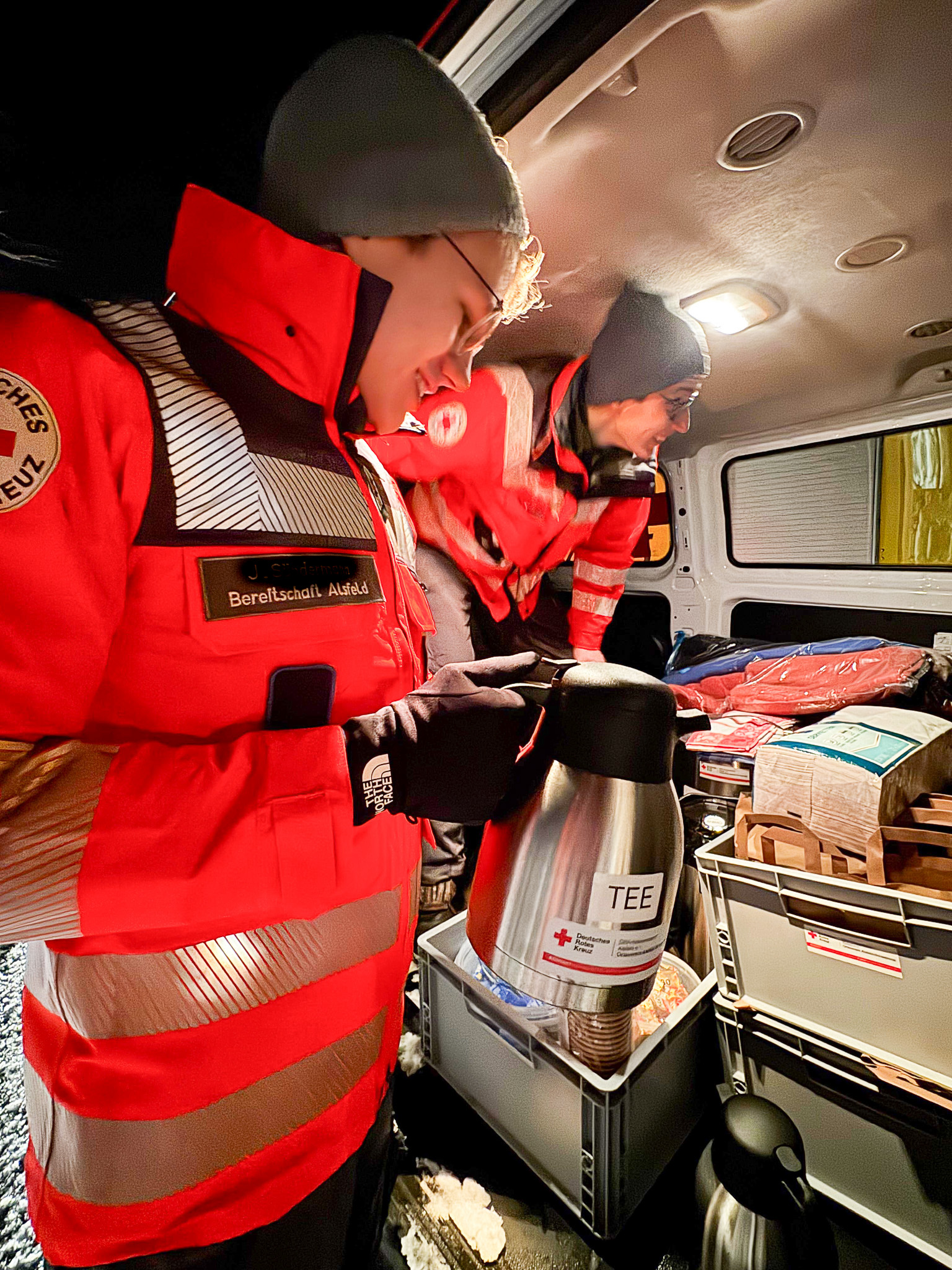 „Gerade in solchen Situationen zeigt sich, wie wichtig es ist, eine Rettungsgasse zu bilden – Fahrzeuge auf der linken Spur nach links, alle anderen nach rechts. Nur so können Einsatzkräfte schnell zu den Betroffenen gelangen.“ Leider kam es im Stau immer wieder zu Engstellen. „Wo LKW zwei-bis dreispurig stehen, ist für Rettungswagen oder unsere kleinen Busse kein Platz. – Hier müssen wir zu Fuß gehen“ erörtert Robin Steih vom DRK Alsfeld. In Homberg erfreut man sich unterdessen erneut über das spendenfinanzierte (Utility-Task Vehicle). Das DRK Homberg konnte dank des kleinen Allrounders mit Ladefläche und Heizung den größten Teil der strecke auch zwischen den LKW fahren – ein Learning aus den vergangenen Jahren im Stau.