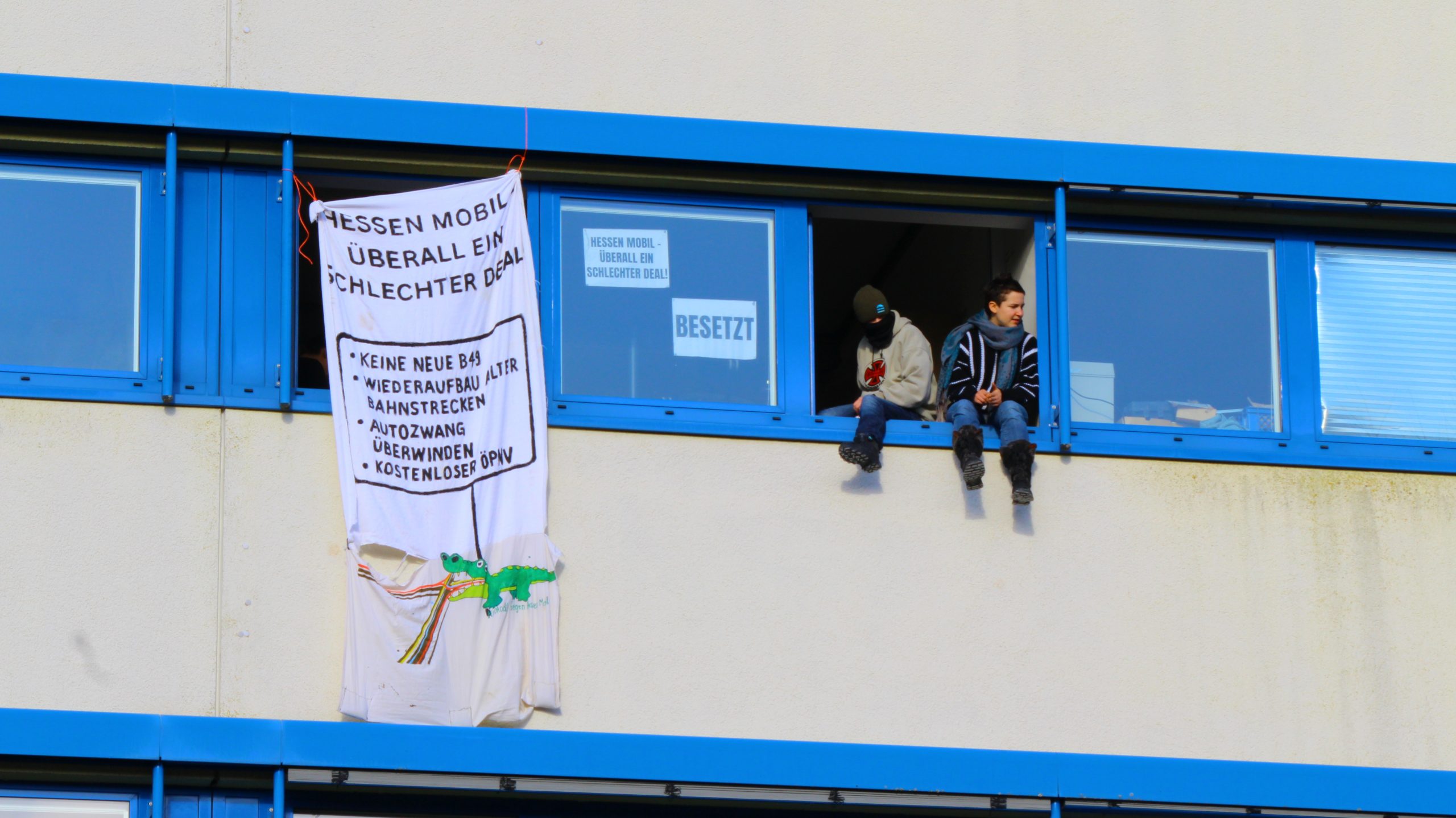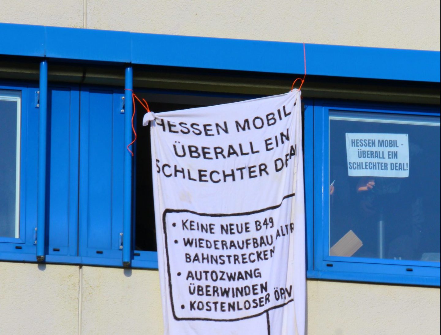 Protest gegen geplanten Ausbau der B49 zwischen Lindenstruth und ReiskirchenAktivistengruppe besetzt Büros von Hessen Mobil in Schotten