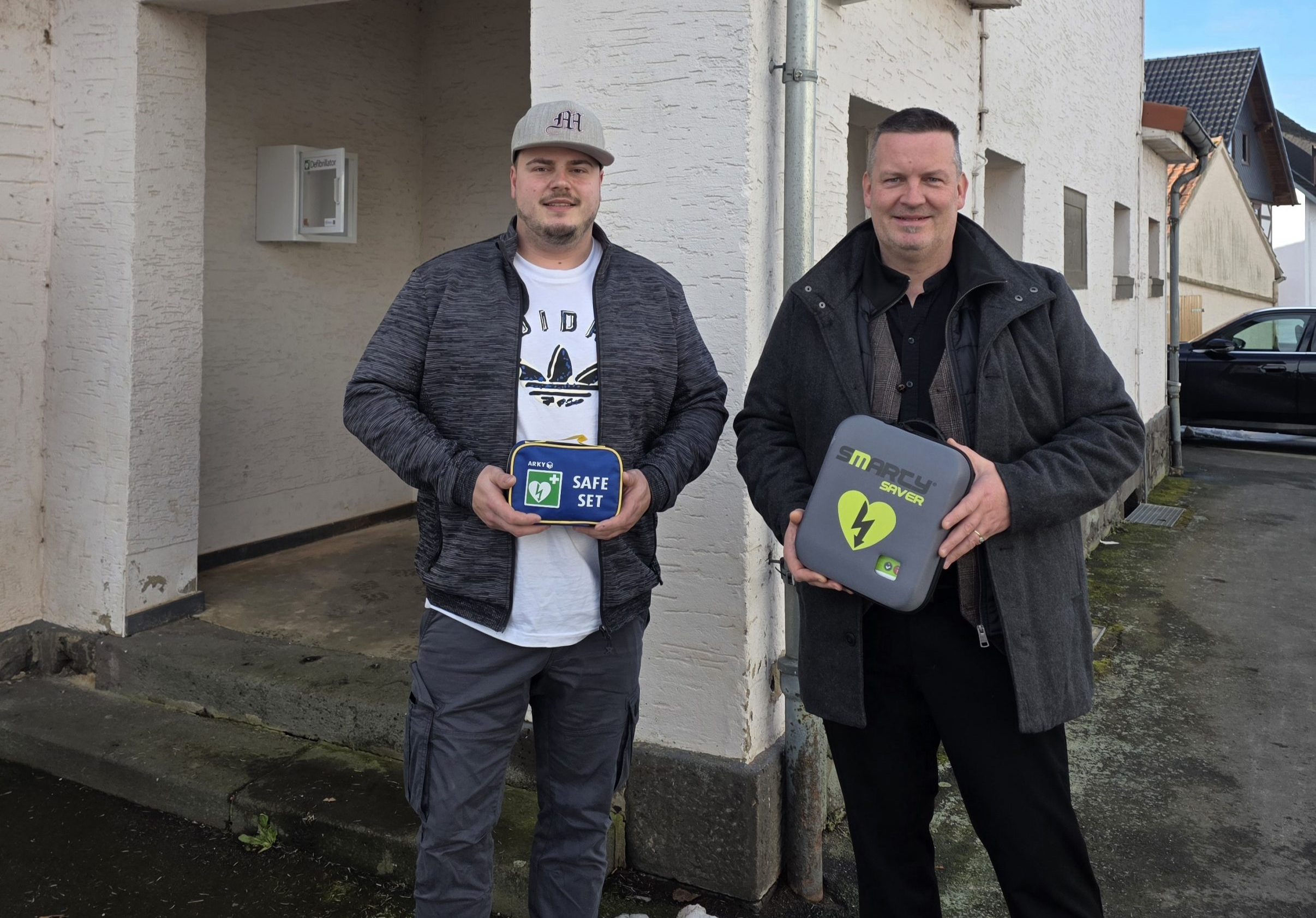 Neues AED-Gerät am Dorfgemeinschaftshaus installiert – Gemeinde übernimmt WartungOhmeser Vereine spenden Defibrillator für den Ort