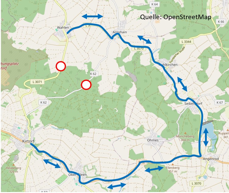 Die Arbeiten erfordern jedoch eine Vollsperrung. Das bedeutet für die Verkehrsteilnehmenden für die Dauer von Mittwoch, dem 25. Februar, bis voraussichtlich Freitag, den 27. Februar, eine Erweiterung der Umleitungsstrecke. Bis Ende der Woche führt die Umleitung U 7 auf der B 62 über Ober-Gleen zum Abzweig L 3070 und von dort über Seibelsdorf, Ruhlkirchen, Arnshain nach Wahlen. Die Umleitung der Gegenrichtung erfolgt analog und ist mit U 8 beschildert.