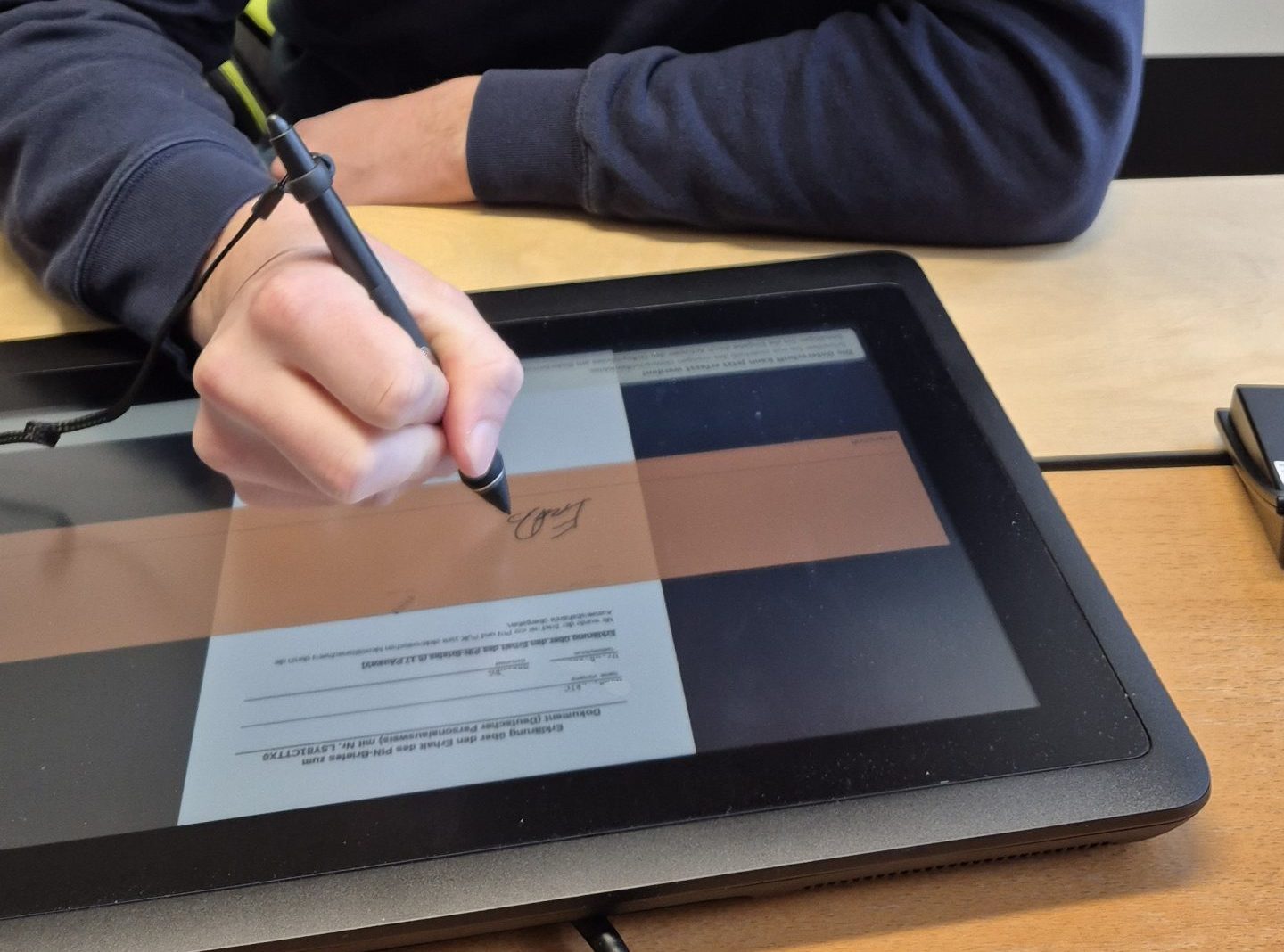 Sämtliche Verfahrensschritte werden nun elektronisch abgewickelt und in einer digitalen e-Akte geführt. Der gesamte Prozess erfolgt medienbruchfrei und kommt vollständig ohne Papier aus. Damit werden Abläufe effizienter gestaltet, Bearbeitungszeiten optimiert und zugleich Ressourcen geschont. Durch die Möglichkeit, das biometrische Passfoto direkt vor Ort aufnehmen zu lassen, wird ein weiterer Gang zum Fotografen überflüssig – ein weiterer spürbarer Zeitgewinn für die Bürgerinnen und Bürger. Auf dem beigefügten Foto ist ein Kunde bei der digitalen Unterschrift für sein Ausweisdokument zu sehen – ein sichtbares Zeichen für die moderne und bürgernahe Weiterentwicklung der Verwaltung.