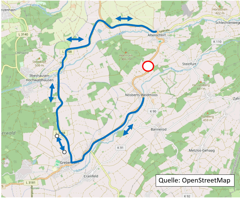 Die Verkehrsteilnehmenden werden daher aller Voraussicht nach bis Ende April in beiden Fahrtrichtunge über Ilbeshausen-Hochwaldhausen umgeleitet. Die Einmündung zur K 89 in Richtung Steinfurt bleibt während der gesamten Bautätigkeiten befahrbar.