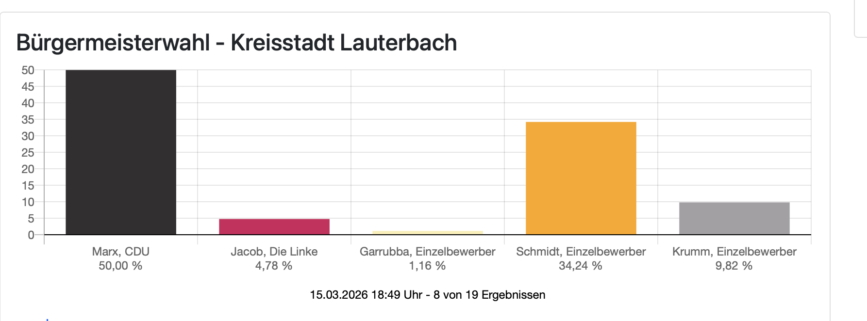 20:08 Uhr: Die Bürgermeisterwahl in Lauterbach ist fast durch: 18 von 19 Ergebnissen liegen vor. Und immer noch liegt Holger Marx klar vorne – aber mit 49,26 Prozent unter der magischen Marke von 50 Prozent.
