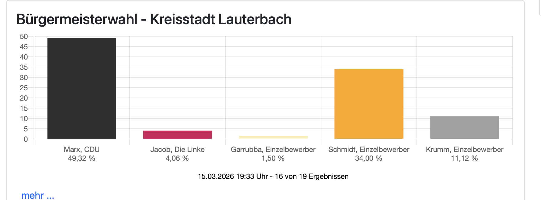 19.36 Uhr: Insgesamt aber wird es kurz vor Ende der Auszählung bei dieser Wahl noch einmal spannend: Holger Marx liegt bei 49,32. Prozent. Es könnte also ein Sieg werden für ihn – aber kein Durchmarsch. Gibt es eine Stichwahl?