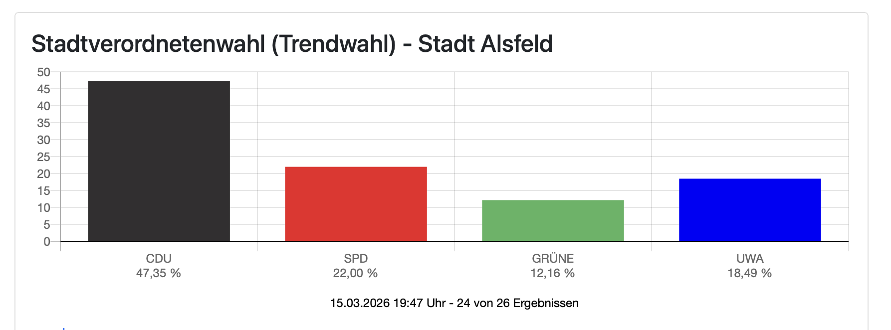 19:11 Uhr: Schauen wir einmal nach Alsfeld – und zwar zur Kreiswahl, denn für die Stadtverordnetenversammlung liegen noch keine Ergebnisse vor. In Alsfeld liegt die CDU mit 32 Prozent vorne, gefolgt von der AfD (26) und der SPD mit 16 Prozent. Ist das Ergebnis bei CDU und SPD auch eine Vorschau für die Stadtverorndeten-Versammlung?