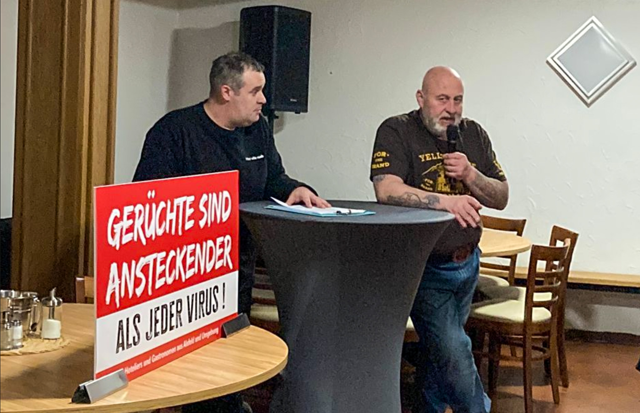 „Es ist uns ein dringendes Anliegen, öffentlich klarzustellen, dass der Ausbruch eines Virus ein Schlag von außen war und nichts mit der einwandfreien Hygiene im Hotel zu tun hatte.“ Diese Erklärung verlas Markus Kirchheim, Chefkoch der Villa Raab, der die Aktion zusammen mit Jörg Hofmann, dem Betreiber des Eudorfer Restaurants „Zur Schmiede“ initiiert hatte. 15 Kollegen schlossen sich an nebst Vertretern vom Verkehrsverein AlsAktiv und dem Dehoga-Kreisverband – auch Alsfelds Bürgermeister Stephan Paule war dabei.