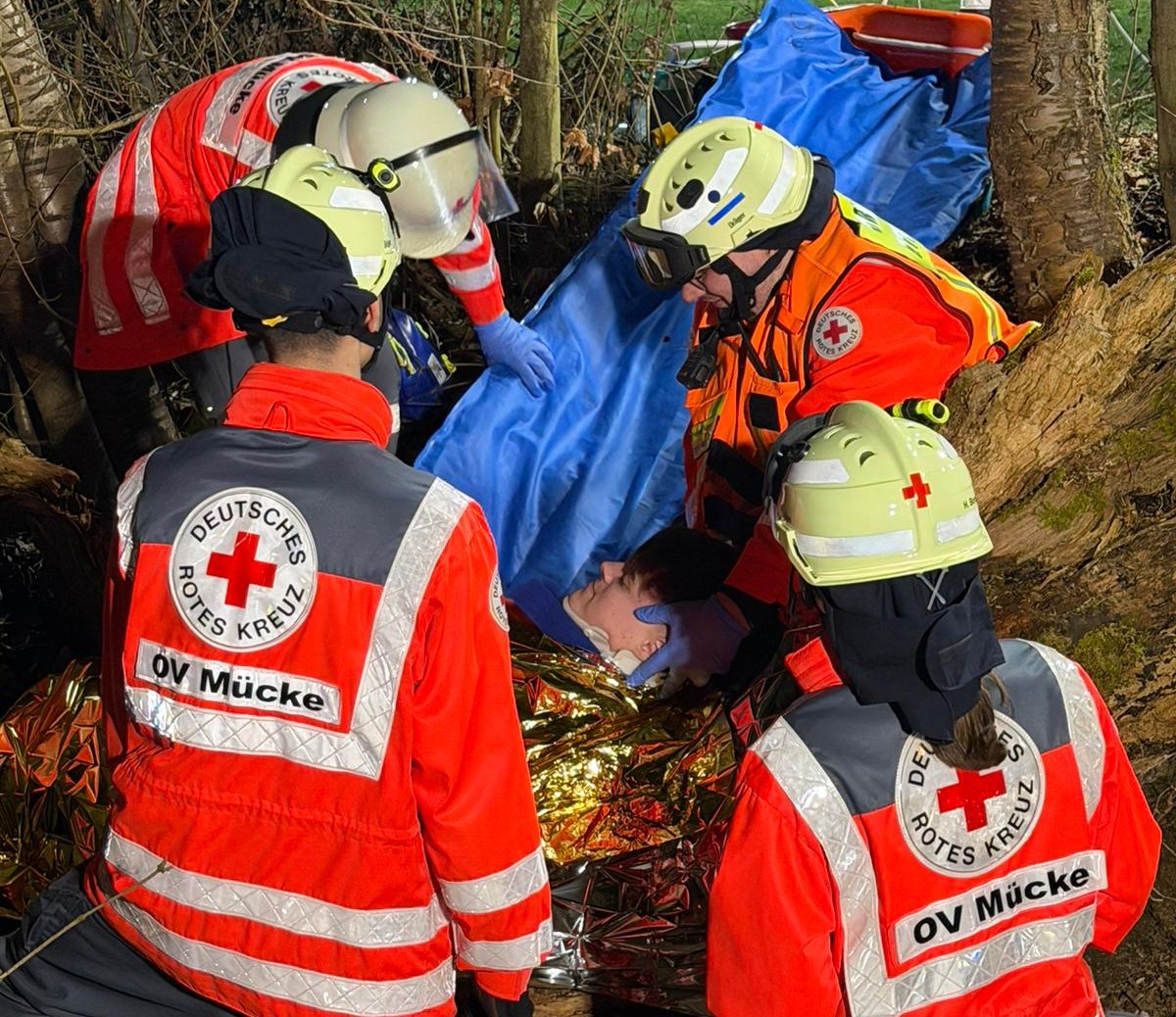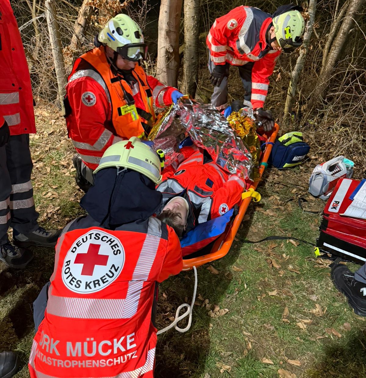 MÜCKE (ol). Die DRK-Bereitschaft Mücke hat bei einer Übung die Rettung aus unwegsamem Gelände trainiert. Rund 20 Einsatzkräfte probten die Versorgung und Bergung zweier verletzter Personen aus einem Graben. Neben medizinischen Maßnahmen stand vor allem die sichere und schonende Rettung im Mittelpunkt. Die Übung unterstreicht die Bedeutung regelmäßiger Trainings für komplexe Einsatzlagen.