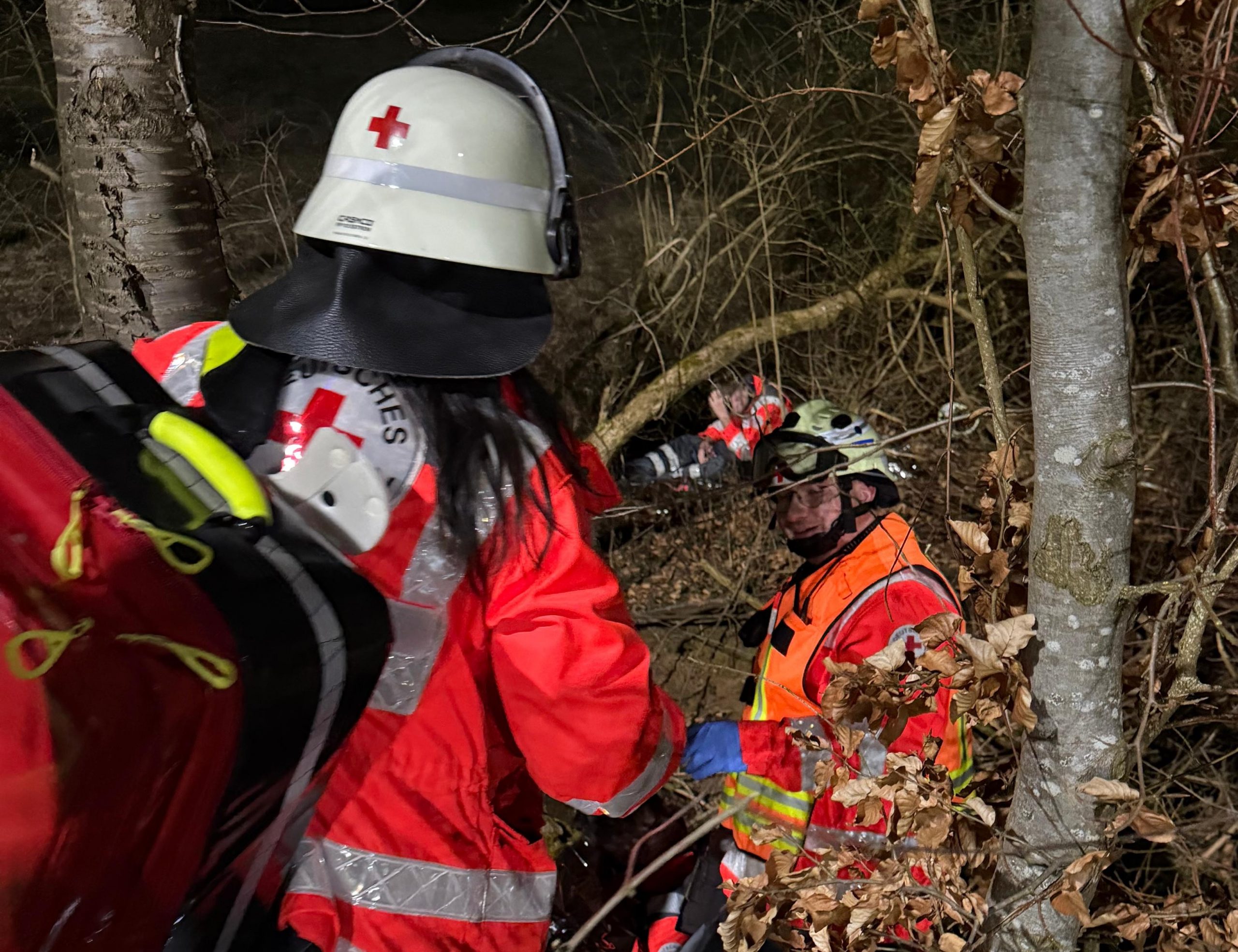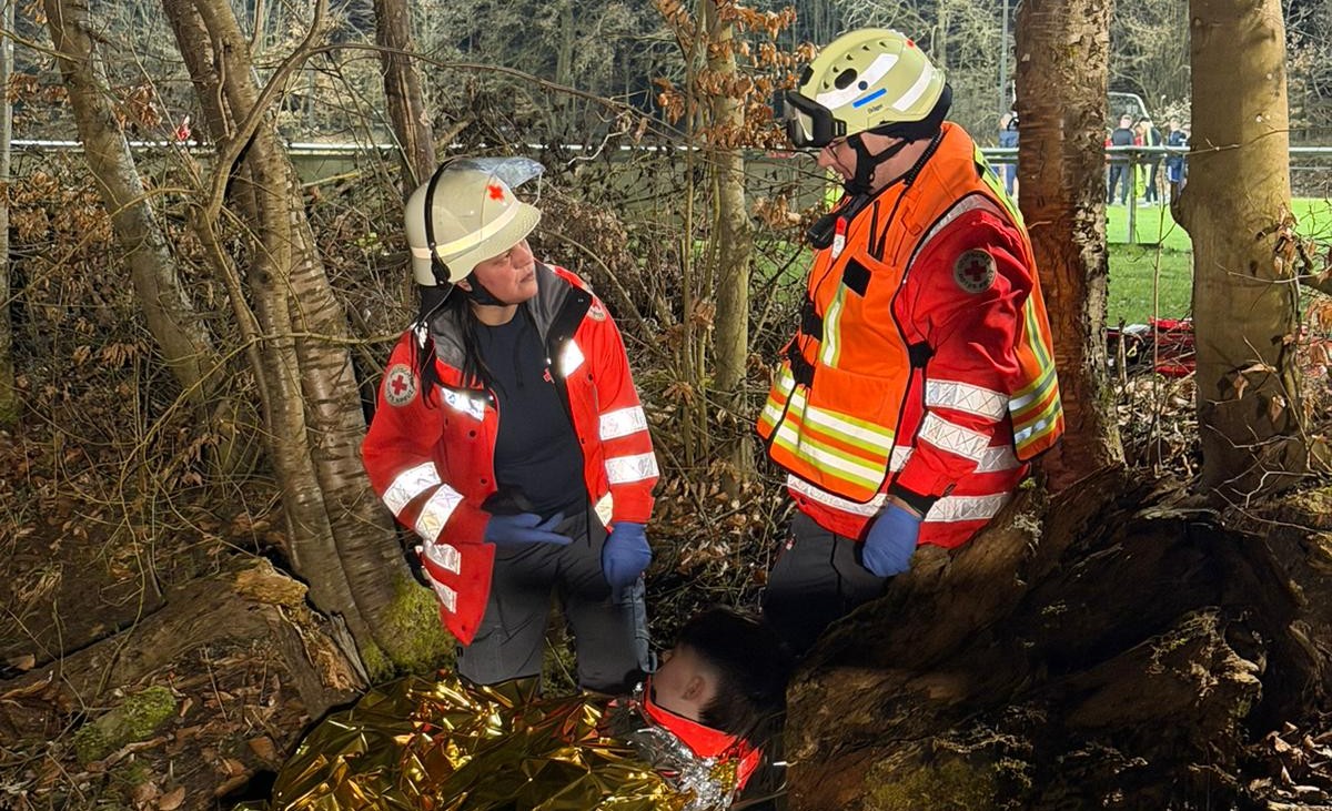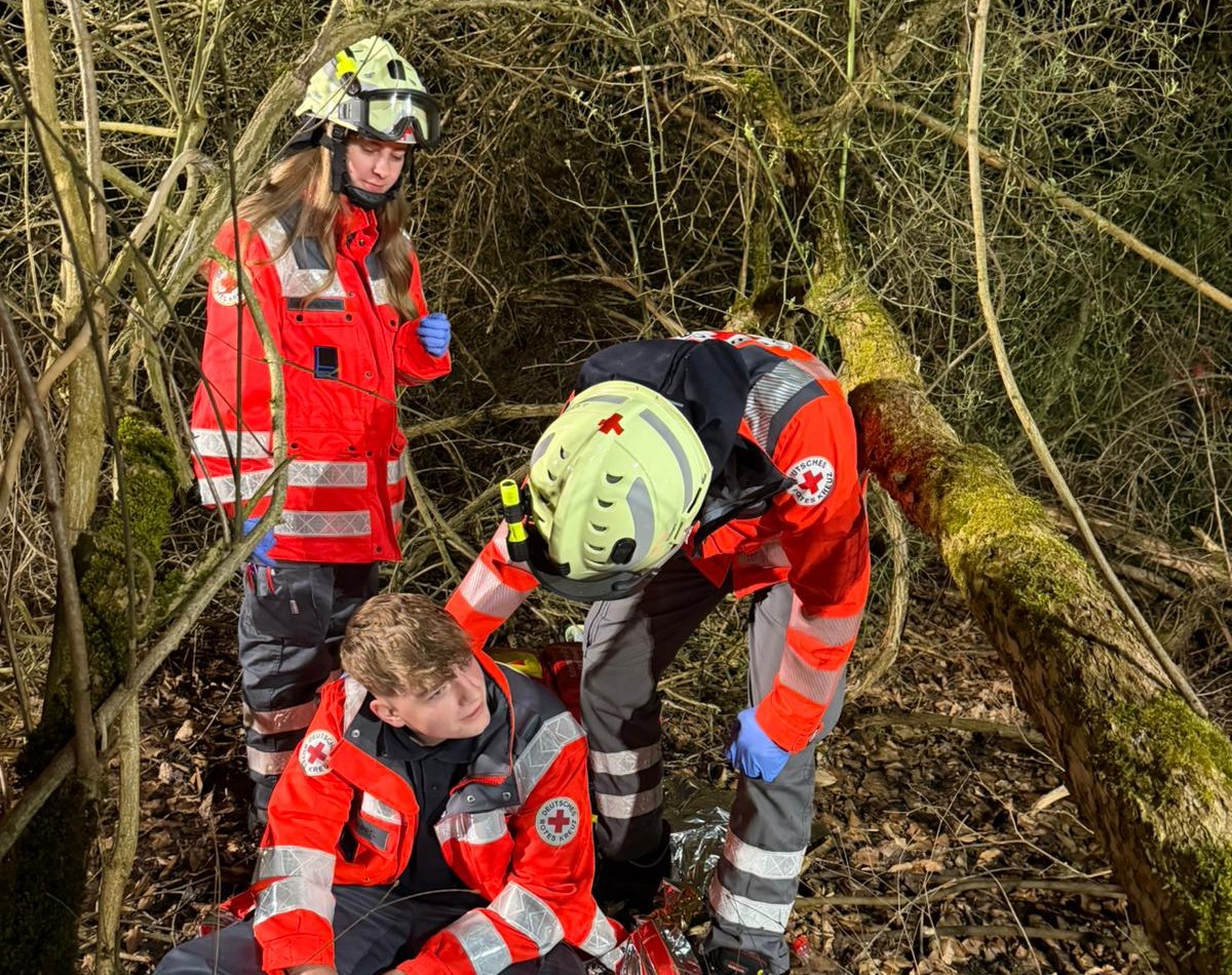 Für die Rettung nutzten die Helferinnen und Helfer verschiedene Rettungsmethoden. Eine verletzte Person wurde über eine angrenzende Wiese nach oben gebracht. Der zweite Patient wurde mithilfe einer Schleifkorbtrage aus dem unteren Bereich des Grabens gerettet. Nachdem beide Patienten aus der Gefahrenlage befreit waren, wurden sie fiktiv zur weiteren Behandlung in ein Krankenhaus transportiert.