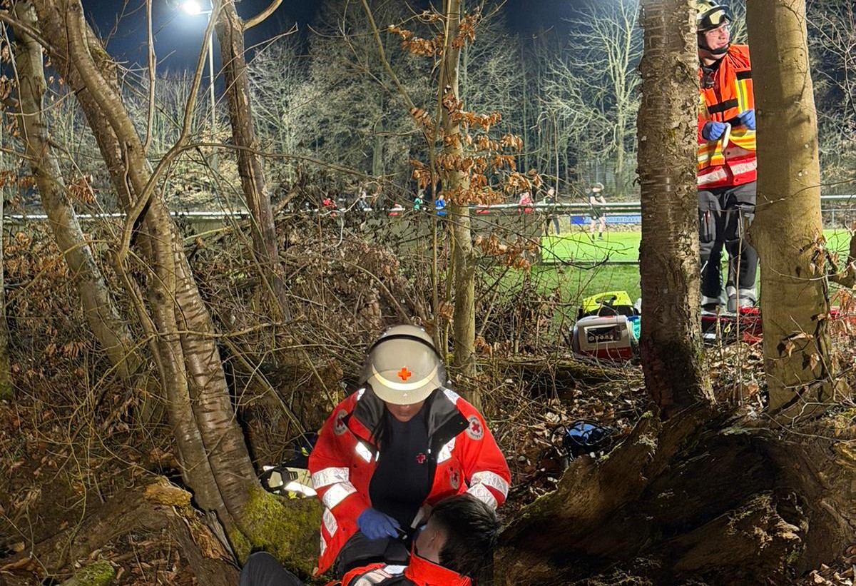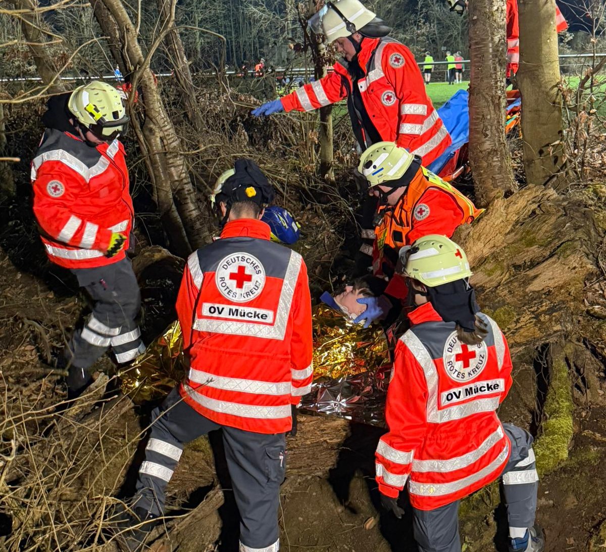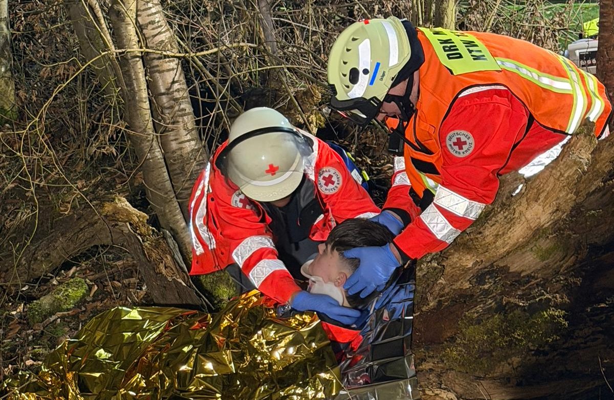 Für die Rettung nutzten die Helferinnen und Helfer verschiedene Rettungsmethoden. Eine verletzte Person wurde über eine angrenzende Wiese nach oben gebracht. Der zweite Patient wurde mithilfe einer Schleifkorbtrage aus dem unteren Bereich des Grabens gerettet. Nachdem beide Patienten aus der Gefahrenlage befreit waren, wurden sie fiktiv zur weiteren Behandlung in ein Krankenhaus transportiert.