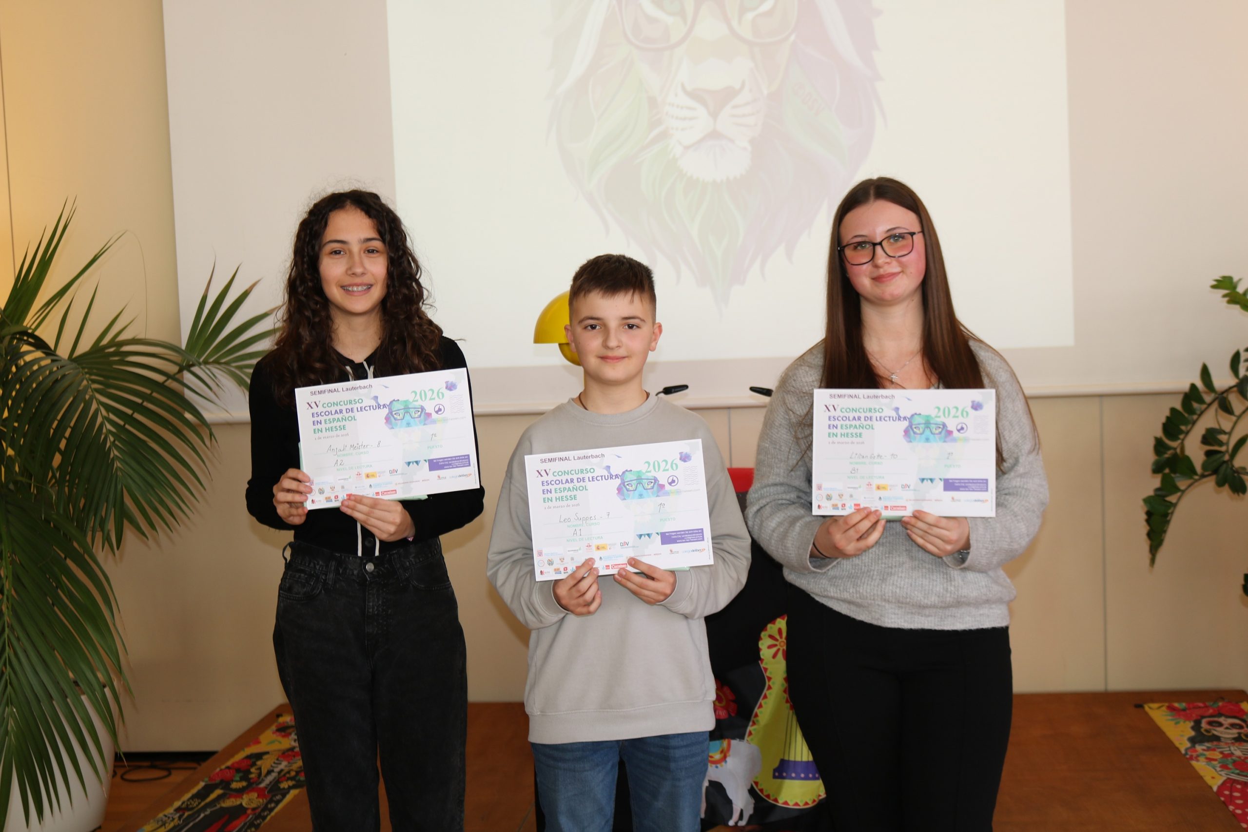 Im Niveau A1 schnitt Leo Suppes (Gustav-Stresemann-Gymnasium) am besten ab. Zweite wurde Sarah Busca (Alexander-von-Humboldt-Schule). Sie werden gemeinsam zum Finale am 19. Mai im Instituto Cervantes in Frankfurt reisen. Dort werden die jeweils Zweitplatzierten als Vertreter für die Erstplatzierten mit von der Partie sein. Begleiten werden sie die Sieger des Niveaus A2. Erste wurde hier Anjali Meister (Albert-Schweitzer-Schule), Zweiter Johann Habermehl (Alexander-von-Humboldt-Schule). Das Niveau B1 wird auf der Landesebene von Lilian Gette (Ursulinenschule) und Masha Mir Mohammadi (Albert-Schweitzer-Schule) vertreten.