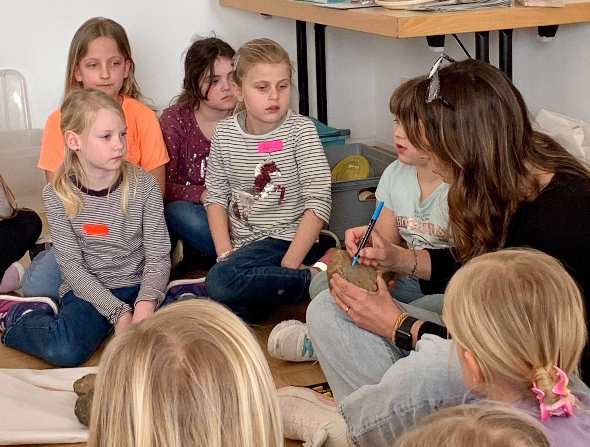 An der vierten Station sammelten die Kinder Worte für Traurigkeit und schrieben sie auf Steine. Diese Steine machten sichtbar, dass auch schwere Gefühle zur Geschichte gehören.