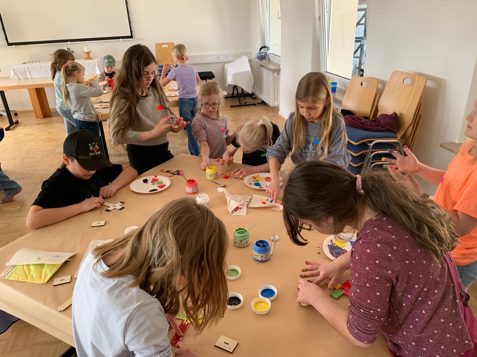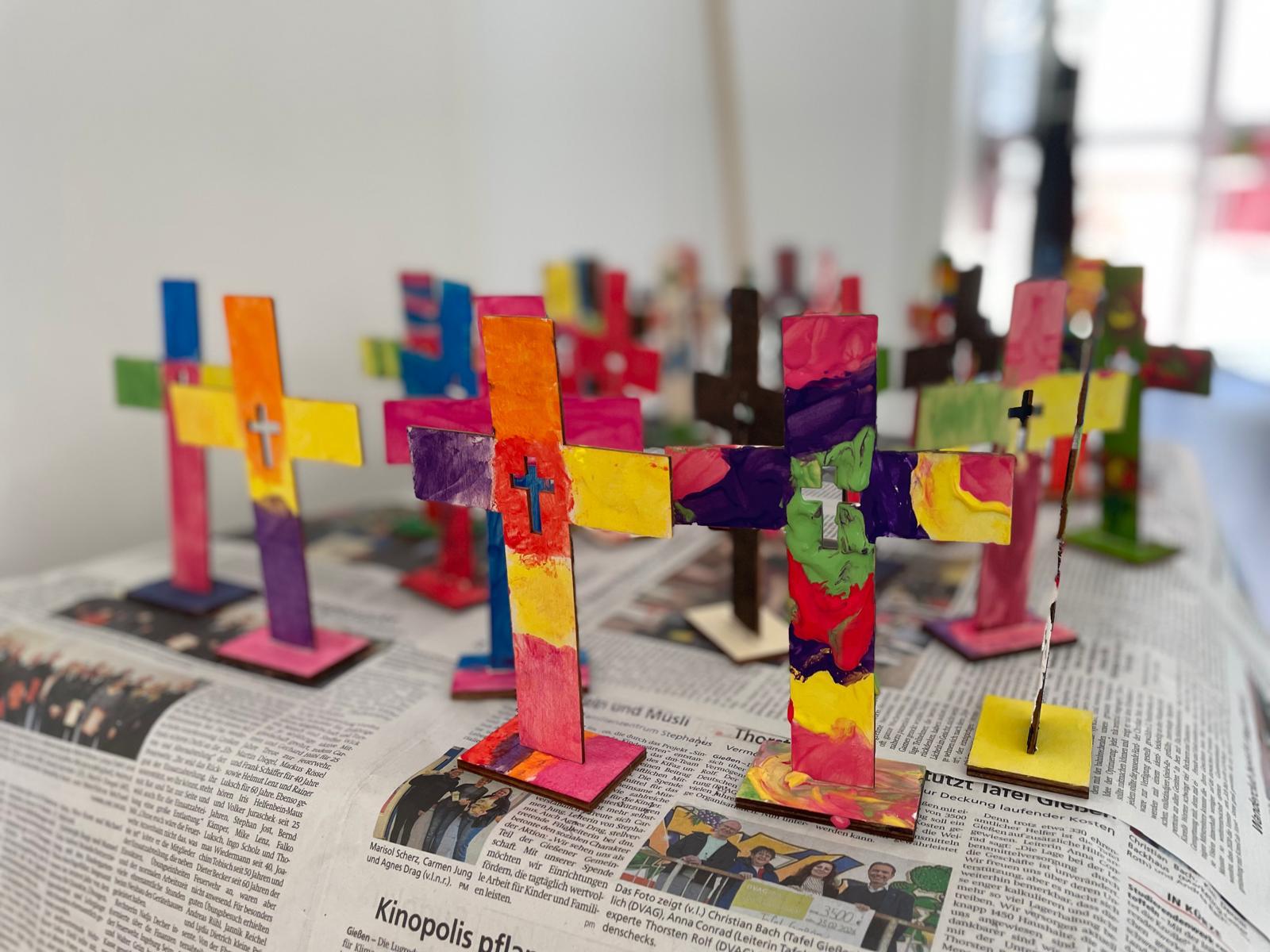 Stiller wurde es an der dritten Station, die von der Gefangennahme Jesu und seinem Tod am Kreuz erzählte. Die Kinder bemalten kleine Holzkreuze und setzten sich dabei auf ihre eigene Weise mit diesem schweren Teil der Geschichte auseinander.