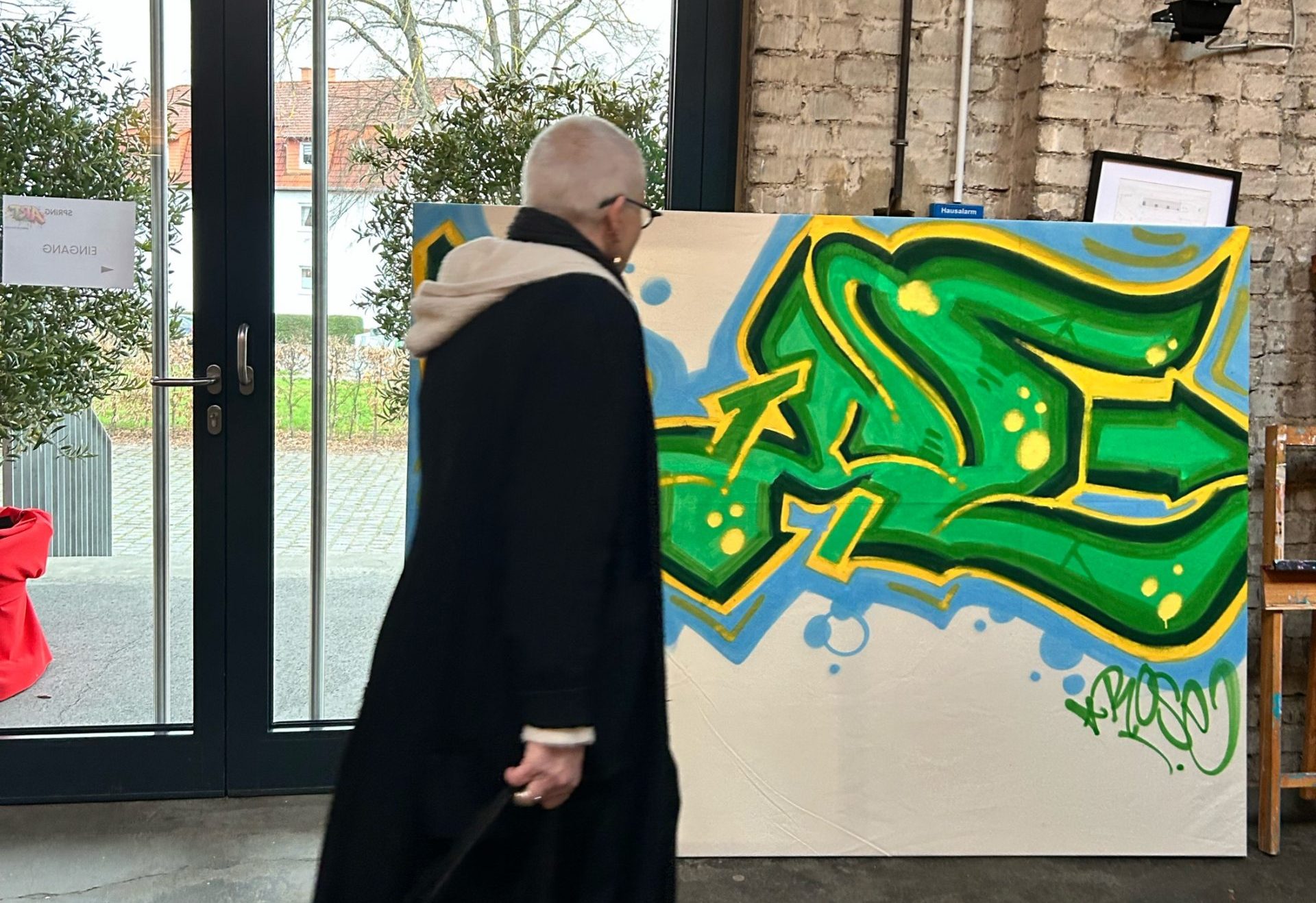 Auch der Sonntag stand noch einmal im Zeichen der Begegnung mit der Kunst und den interessierten Menschen. Als Highlight kurz vor Abschluss der Ausstellung zeigte der Graffiti-Künstler Oskar Bil (Fulda) seine Kunst ganz nahbar und hinterließ im Bahnhof ein weiteres, neues Werk.
