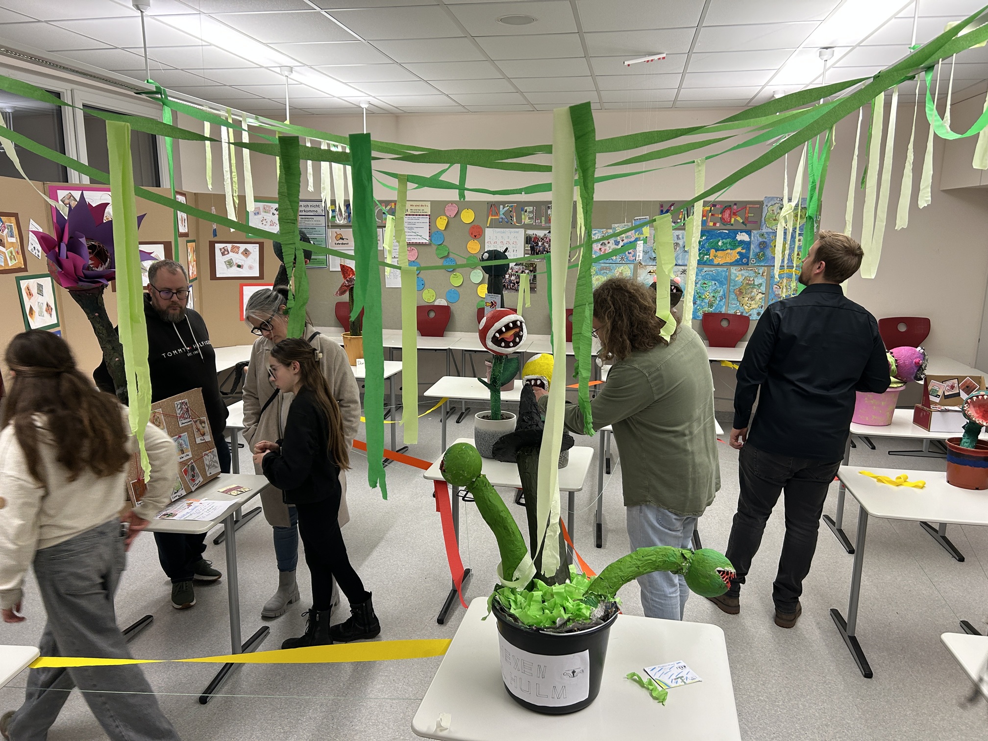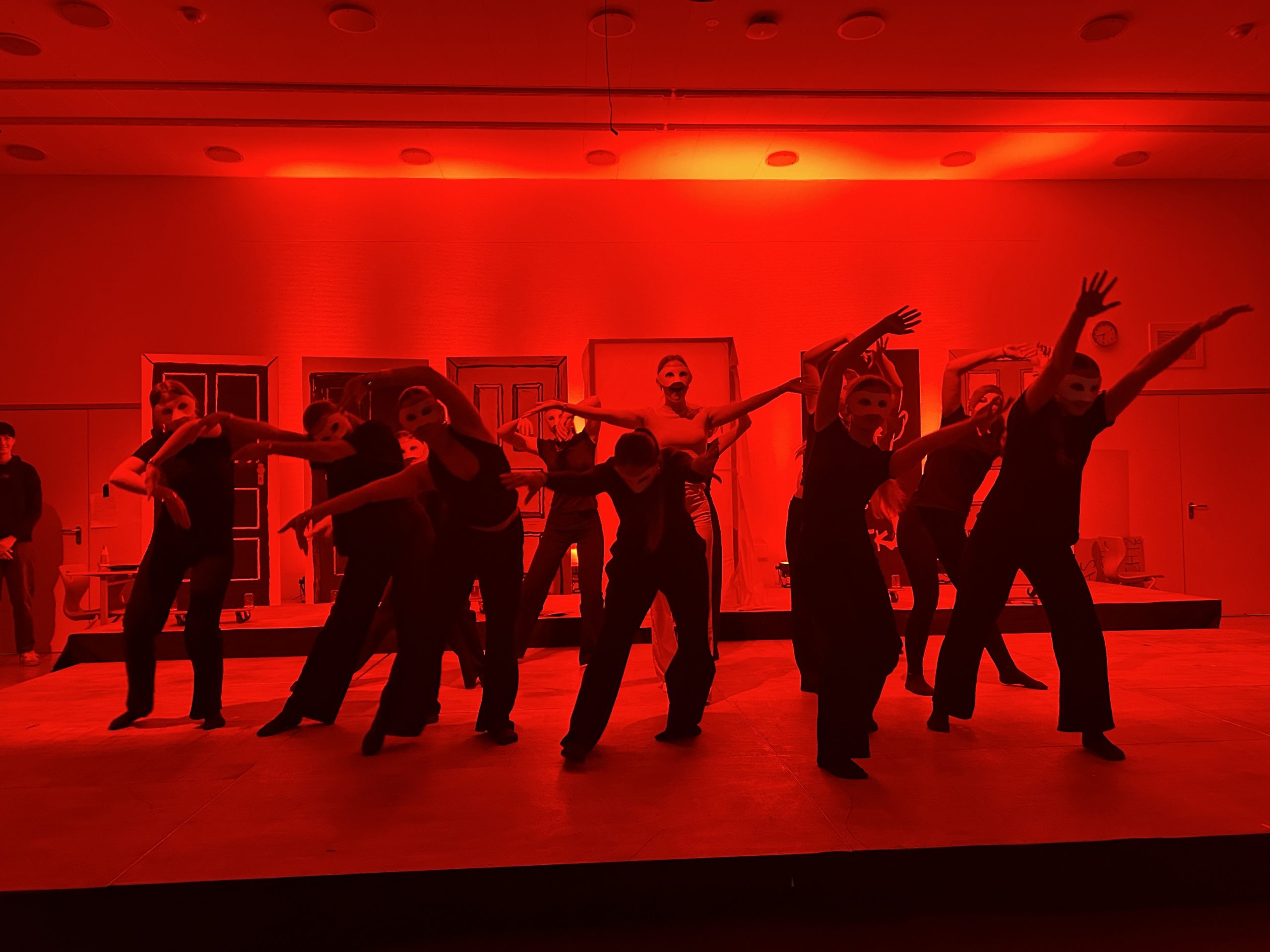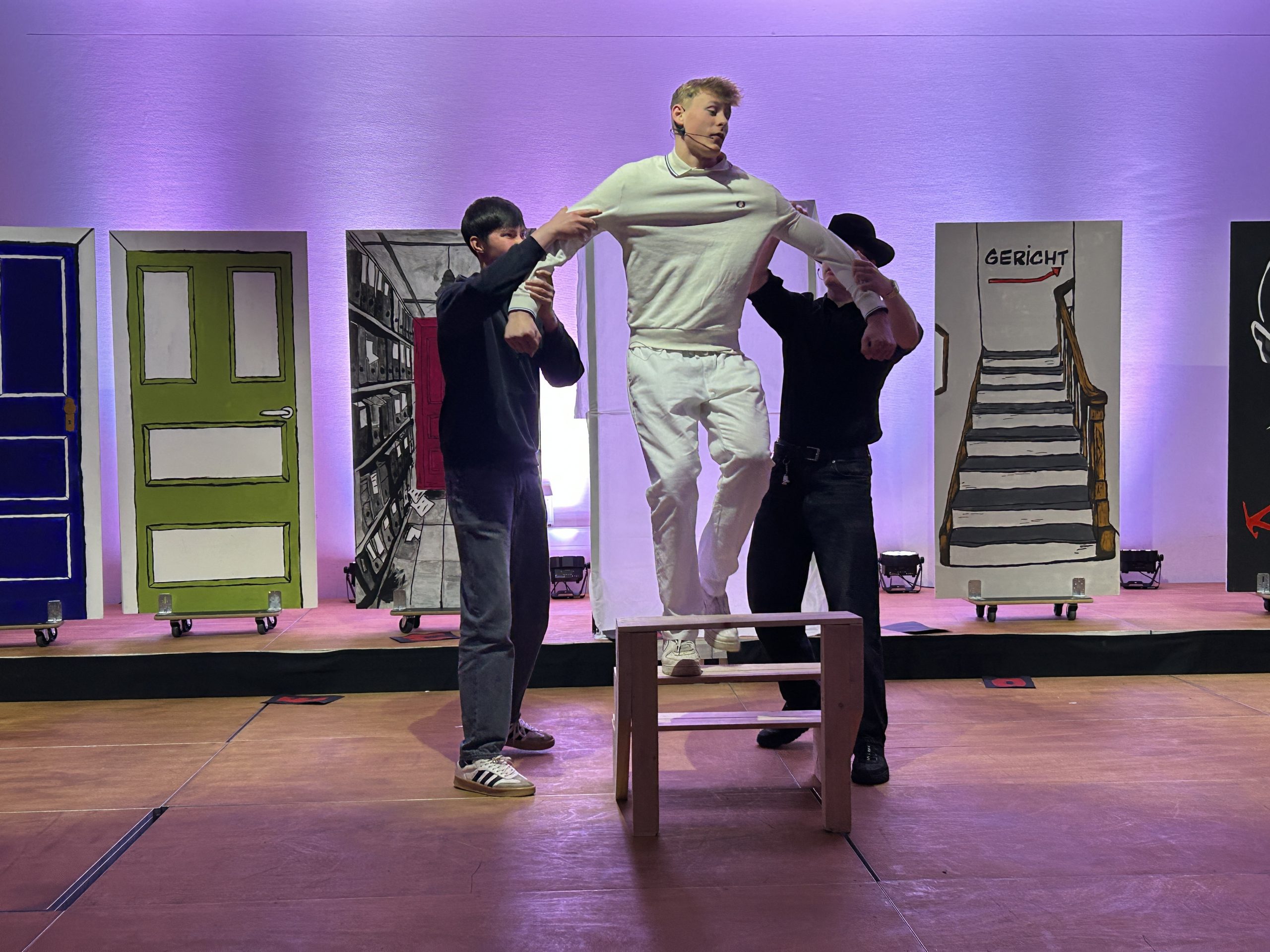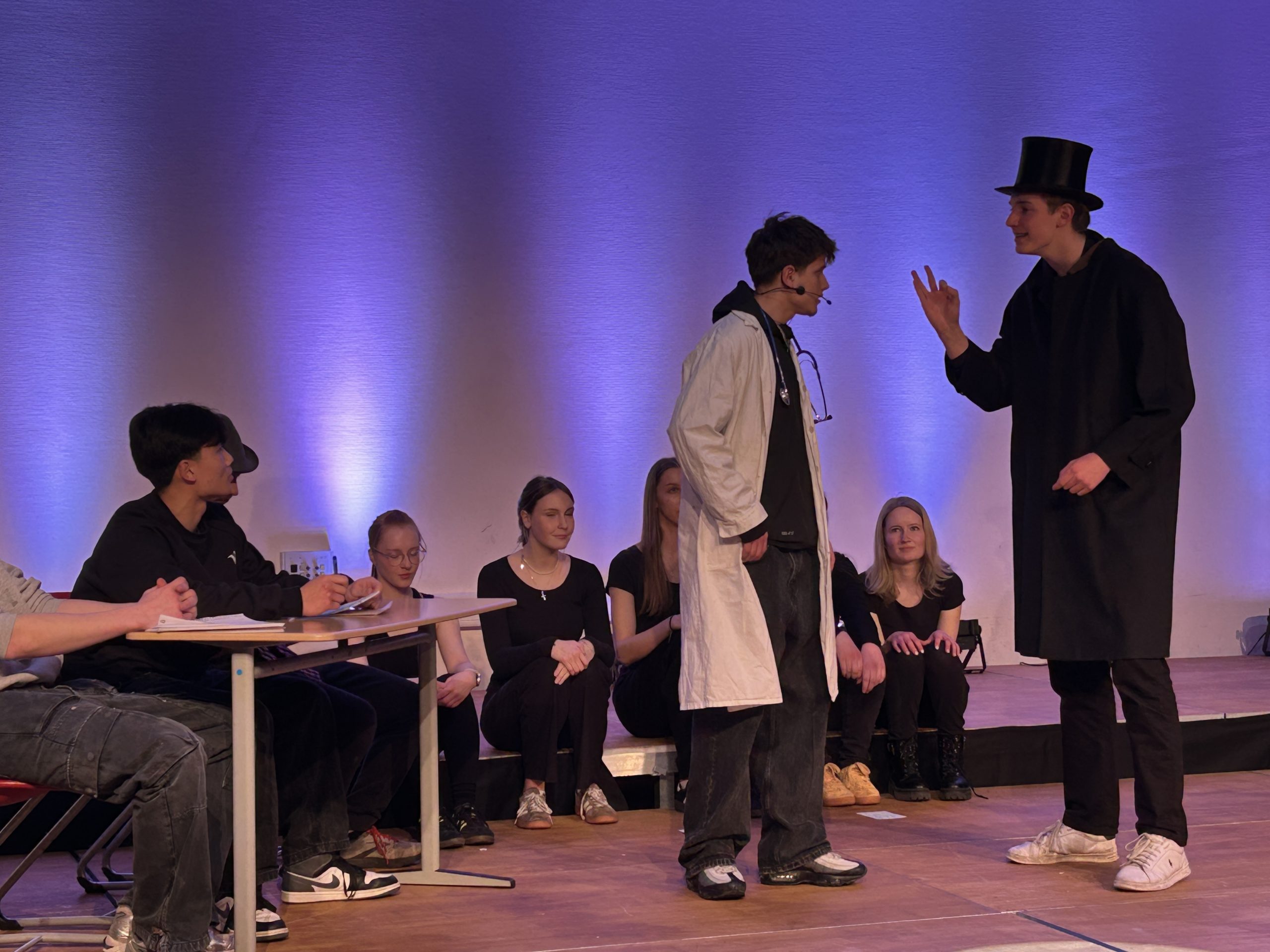 Dies galt auch für die anderen Kunstrichtungen: Viel Musik erklang an einzelnen Stellen: So erfreute u.a. auch die Band-AG unter der Leitung von Jörg Becker die Gäste. Tanzaufführungen standen auf dem Programm genauso wie ganz viel Theater: Kurze Szenen, Walk-through-Räume, Schwarzlichttheater und zwei jeweils dreißigminütige Darbietungen in der Aula. Die DS-Kurse der Qualifikationsphase unter der Leitung von Christa Lange führte Kafkas „Der Prozess“ als hochaktuelle Inszenierung auf. Auch Ibsens „Der Volksfeind“, bearbeitet und auf die Bühne gebracht von den DS-Kursen der Qualifikationsphase unter der Leitung von Thomas Zulauf, beeindruckte nicht zuletzt durch die nach wie vor hohe inhaltliche Relevanz. Die Aula selbst war zudem Bühne für eine spektakuläre Darbietung der Technik-AG: Sie präsentierte eine Light-Show mit Musik, die die Gäste begeisterte.