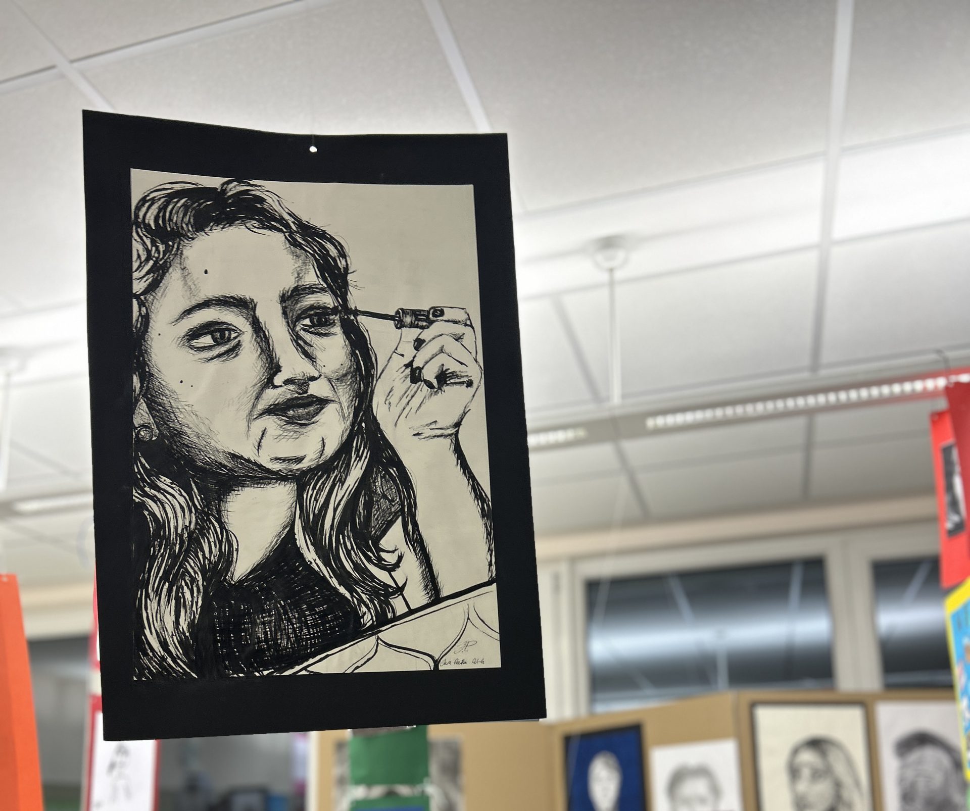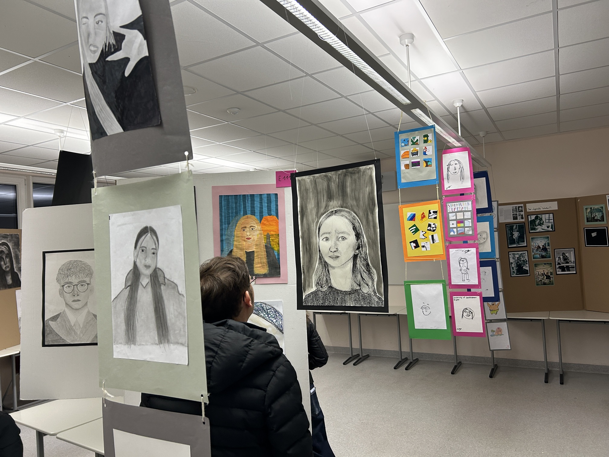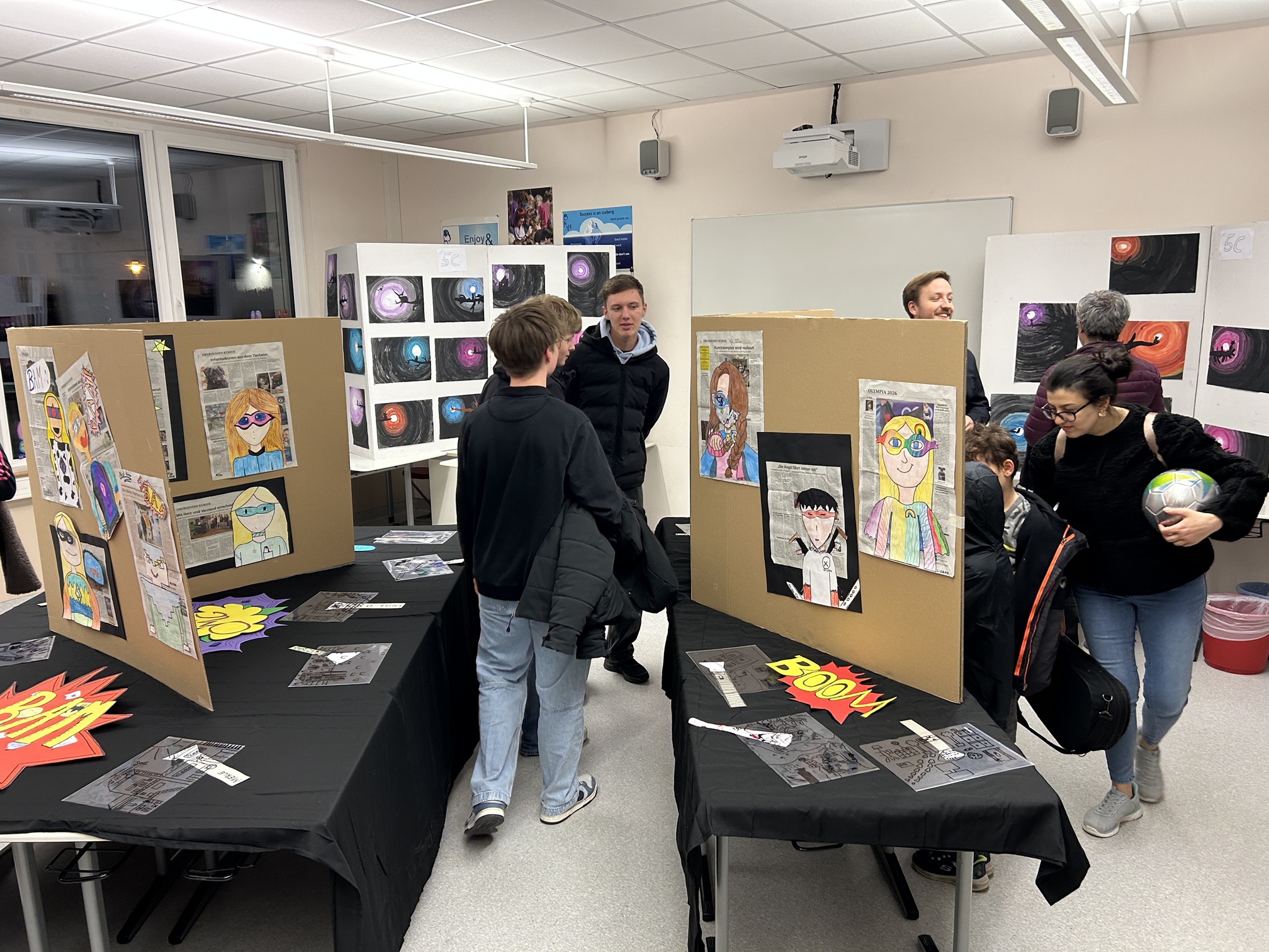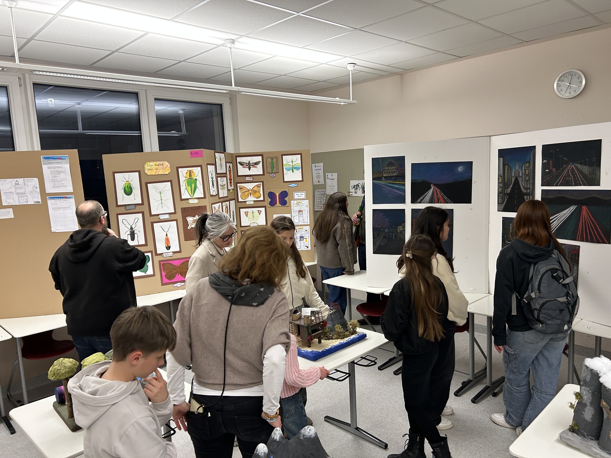 Nach den einführenden Reden gab es für die Besucher viel zu sehen, zu hören und zu erleben: Die Alexander-von-Humboldt-Schule präsentierte sich einmal mehr als ein Ort, an dem die Schülerinnen und Schüler ab der fünften Klasse zu Kunst in vielen Facetten inspiriert werden. So hatten schon die Jüngsten ihren Traum vom Fliegen in Szene gesetzt und Superhelden aus Alltagsgegenständen entwickelt: „Selina Seifenschaum“ und „Fleischi Hackbraten“ ließen grüßen. Auch die „beste Pizza der Welt“, kreativ designt und benannt, erblickte an diesem Abend in Lauterbach das Licht der Welt. In der Fantasie der Kinder retteten kleine, liebe Monster – „Monstis“ – den Planeten, daneben zeigten ältere Schülerinnen und Schüler Wohnwürfel: Modelle zum neuen Wohnen auf engem Raum, die mit Gründächern und witzigen Ideen vielleicht Pate für die Zukunft stehen können. Auch in anderen Räumen spielte Wohnen eine große Rolle – das neue Jahrtausend gar wurde hier künstlerisch erobert. Die Kinder konnten sich selbst portraitieren, Krimi-Taschenlampenbilder zeigen oder interessante Projekte und Kunst zur Nachhaltigkeit entwickeln. Upcycling spielte hier eine große Rolle – zu Recht, denn die Möglichkeiten sind hier schier grenzenlos. Winterlandschaften, Forscherstationen in Extremlandschaften und Krimiszenen waren in den zur Galerie gewordenen Klassenräumen zu sehen, auch interessante Ansichten von Lauterbach. Im weiteren Verlauf gab es Studien zu Perspektive, Stillleben zu ökologischen Themen. Wie die Schülerinnen und Schüler sich den verschiedensten Techniken näherten, zeigten grafische oder filmische Werke, Arbeiten im Stil des Surrealismus, Fotografie, Collage, Kreidezeichnungen. Jeder Raum lud zum Staunen, Innehalten und Betrachten ein.
