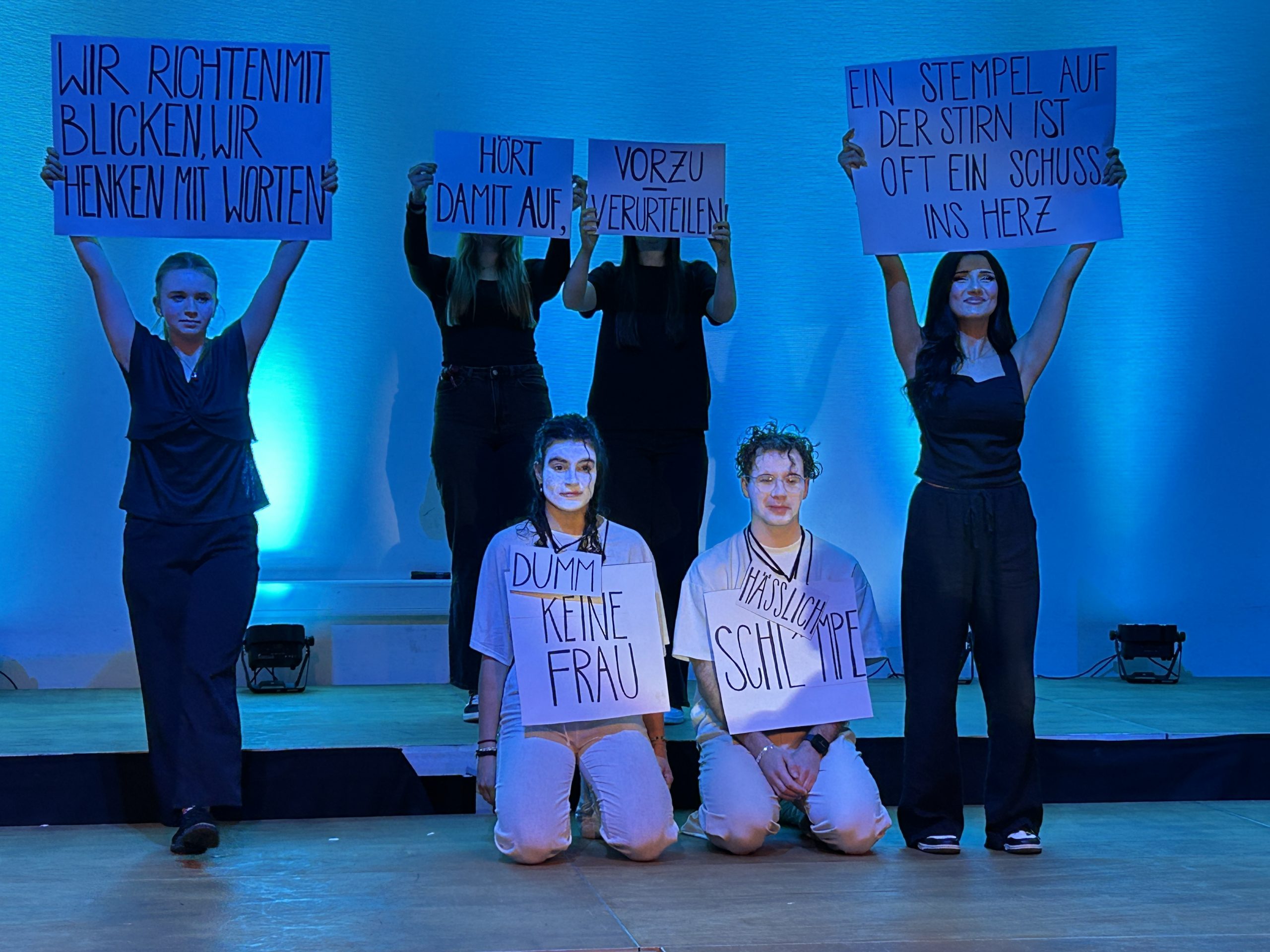 Wie sehr die Schulleiterin diesen Abend schätzt, wurde in ihrer Rede deutlich: Die Schülerinnen und Schüler könnten bei der Mitwirkung an einer solchen Veranstaltung erkennen, dass aus einer Idee etwas werden könne: „Sie spüren ihre Kompetenz.“ Nacheinander lobte Holloch auch ihr Team: Die Lehrkräfte ermutigten und bestärkten die Schülerinnen und Schüler, sie stellten ihnen interessante Inhalte zur Verfügung, so hätten sie u. a. zu Themen wie die Weltrettung und Lobbyismus, aber auch Bequemlichkeit und Gewohnheiten gearbeitet. Sie hätten Kunstwerke selbst entwickelt und bekannte Stücke wie Kafkas „Prozess“ oder Ibsens „Volksfeind“ neu interpretiert. Verschiedenste künstlerische Ausdrucksformen hätten die Lehrkräfte der künstlerischen und musischen Fächer mit den jungen Menschen erarbeitet und damit nicht nur großformatige Werke geschaffen, sondern auch viele Themen, wie Ökologie und Identität, dargestellt. Neben allen beteiligten Lehrkräften dankte die Schulleiterin besonders Stefanie Michel als Initiatorin und Organisatorin dieses außergewöhnlichen Abends.
