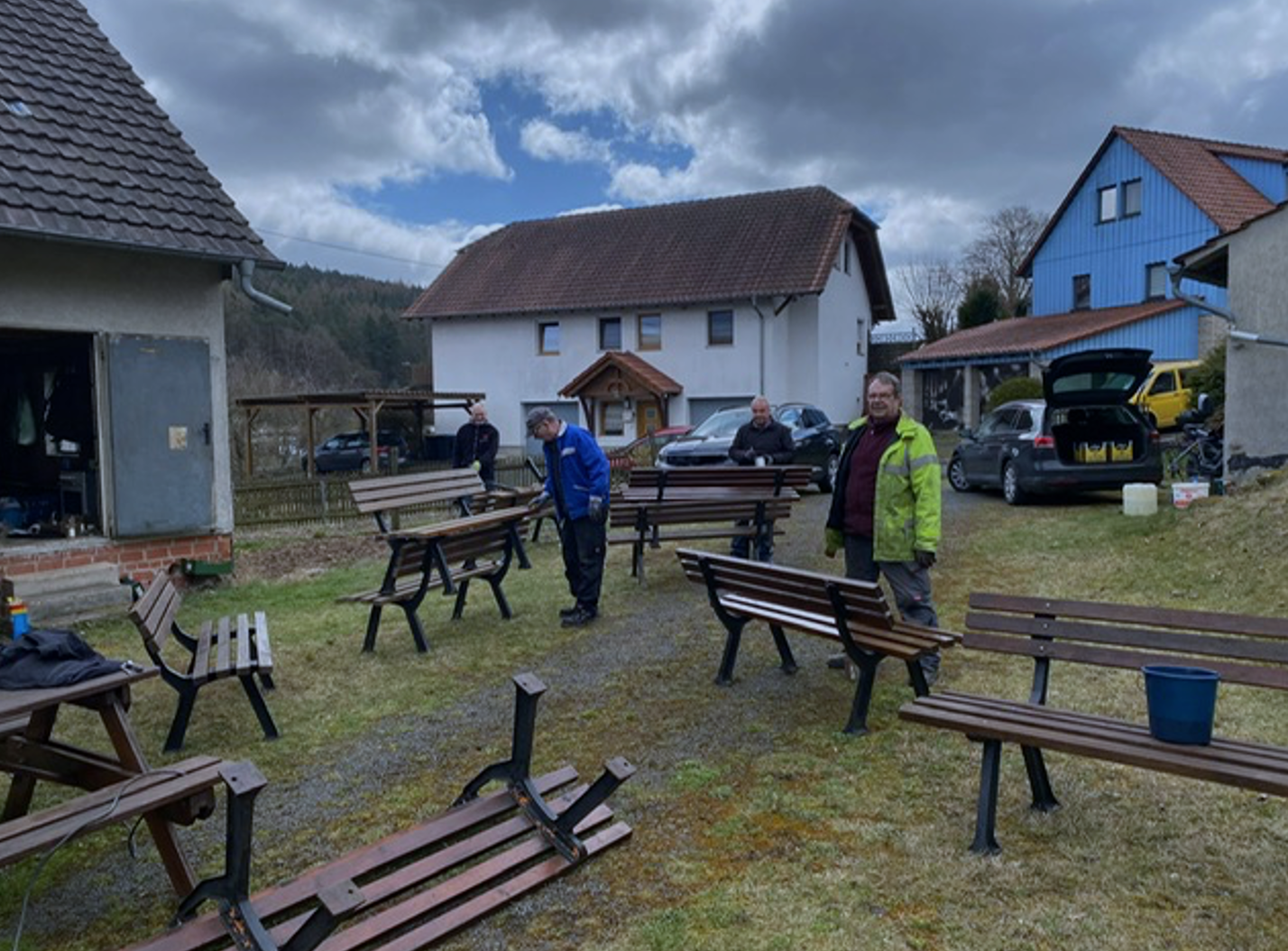 Das Team kümmerte sich liebevoll um jedes Detail: Rostschutz, frische Farbe und eine gründliche Reinigung gehörten ebenso dazu wie das Überprüfen der Stabilität. Die Arbeiten begannen mit einer Sichtprüfung aller Bänke, gefolgt von notwendigen Ausbesserungsarbeiten am Holz und an den Verbindungen. Anschließend wurden die Möbel abgeschliffen, grundiert und zweimal neu gestrichen, sodass sie künftig wetterbeständiger sind. Neben der praktischen Instandsetzung stand auch der ästhetische Aspekt im Mittelpunkt: Die Bänke erstrahlen in einem frischen, gleichmäßigen Ton und fügen sich wieder harmonisch in das Umfeld des Ortes Udenhausen ein.